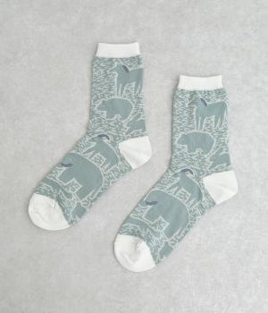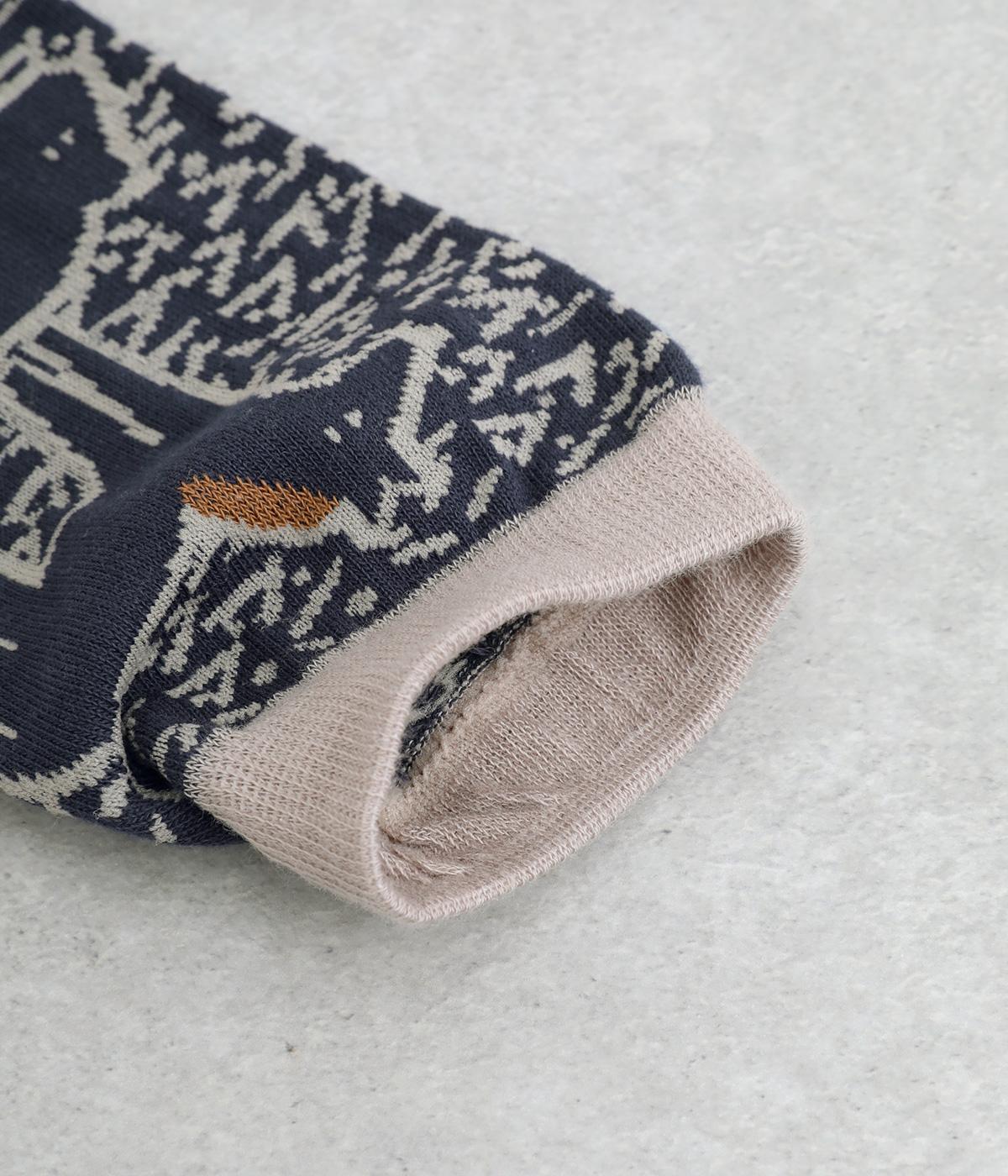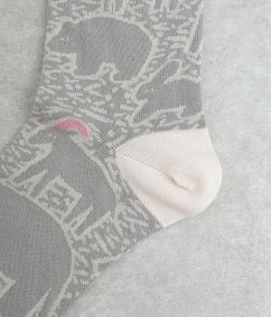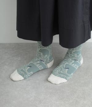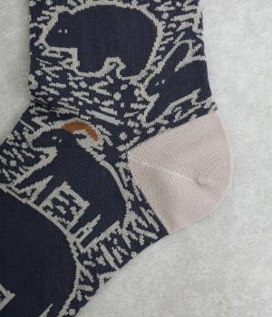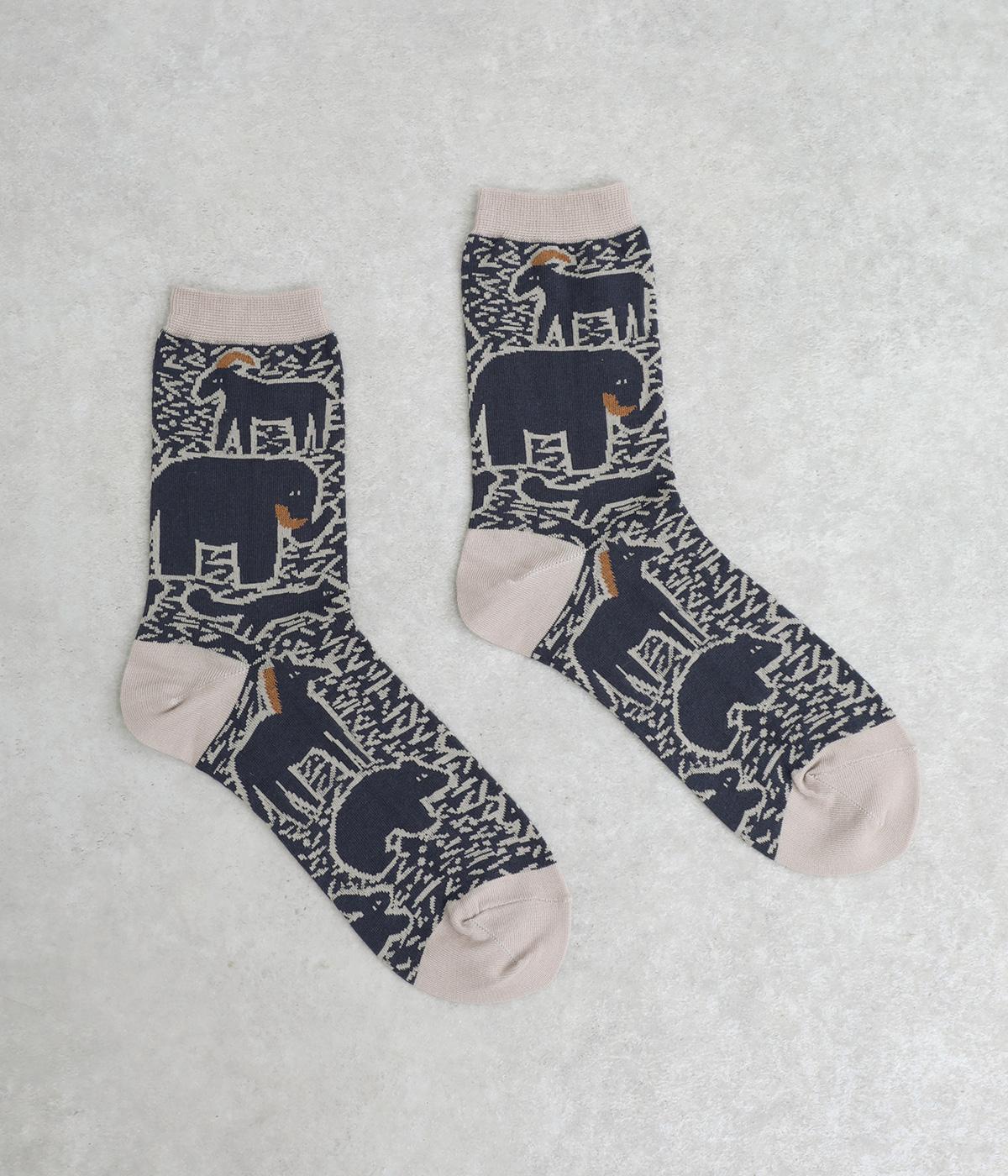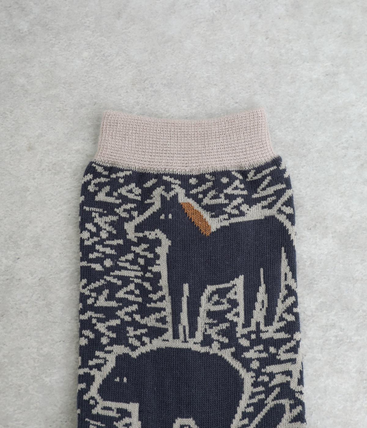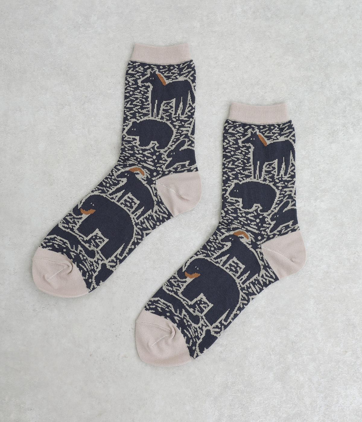 版画タッチで描かれたさまざまな動物がユーモアで可愛らしいソックスです。たのしげな動物が癒されるデザインで、落ち着いた配色もグッド。ナチュラルやカジュアルテイストなデイリースタイルに取り入れやすい仕上がりです。