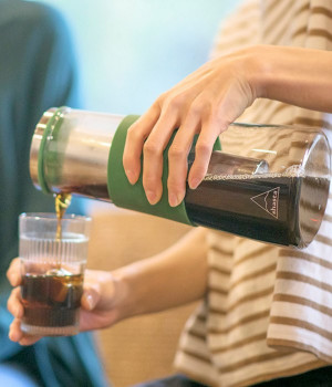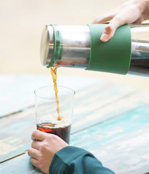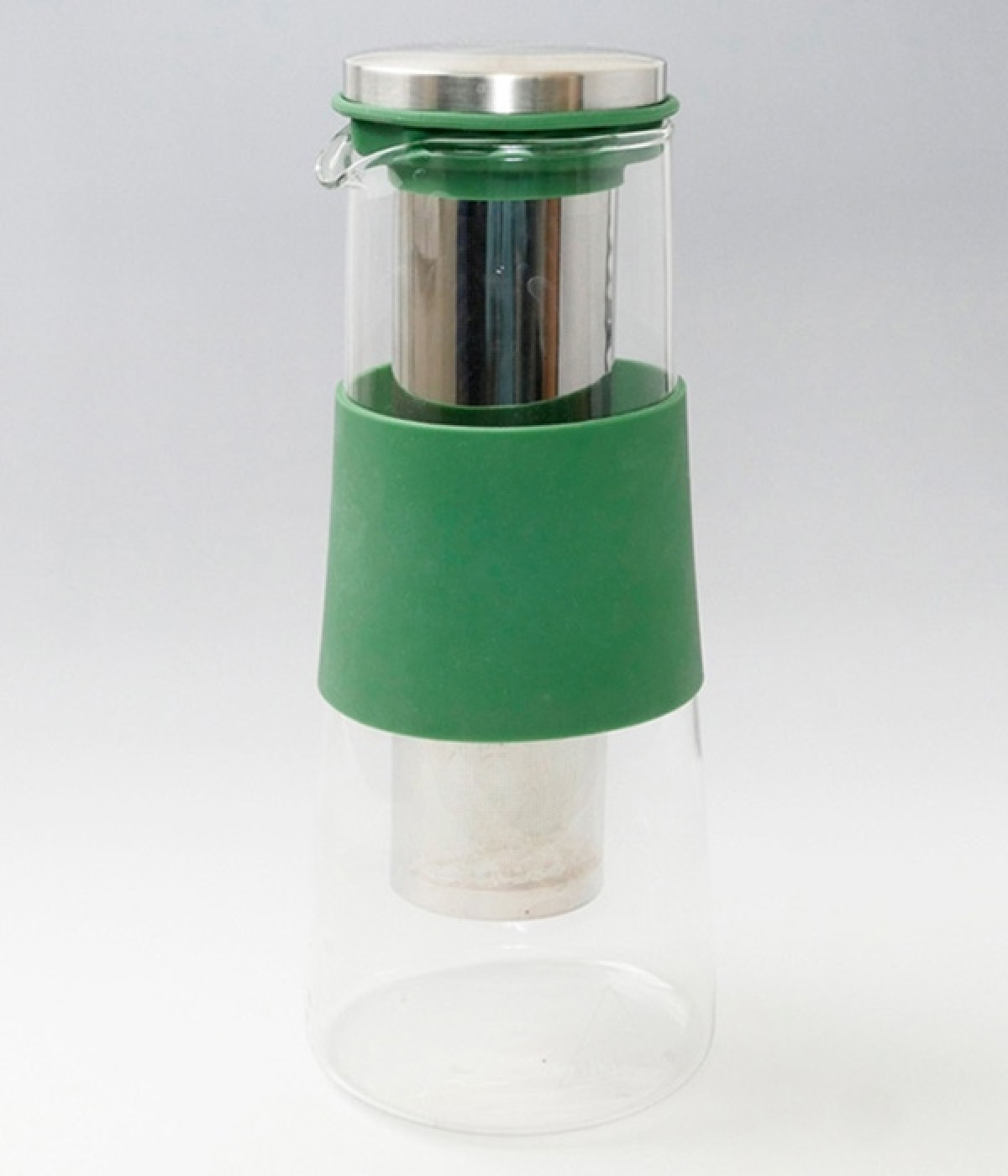 簡単に水出しコーヒーを楽しめるポットです。コーヒーと水を入れるだけで手軽に作れます。耐熱ガラス製で水だしコーヒーのみならず、通常のホットコーヒーから、ハーブティーや紅茶を入れる事もできる優れもの。1300mlの大容量なので、家族や友人とシェアできるのがポイント。スマートなデザインのボトルはクリアーなガラス製で持つ部分が熱くならないラバーバンド付きです。