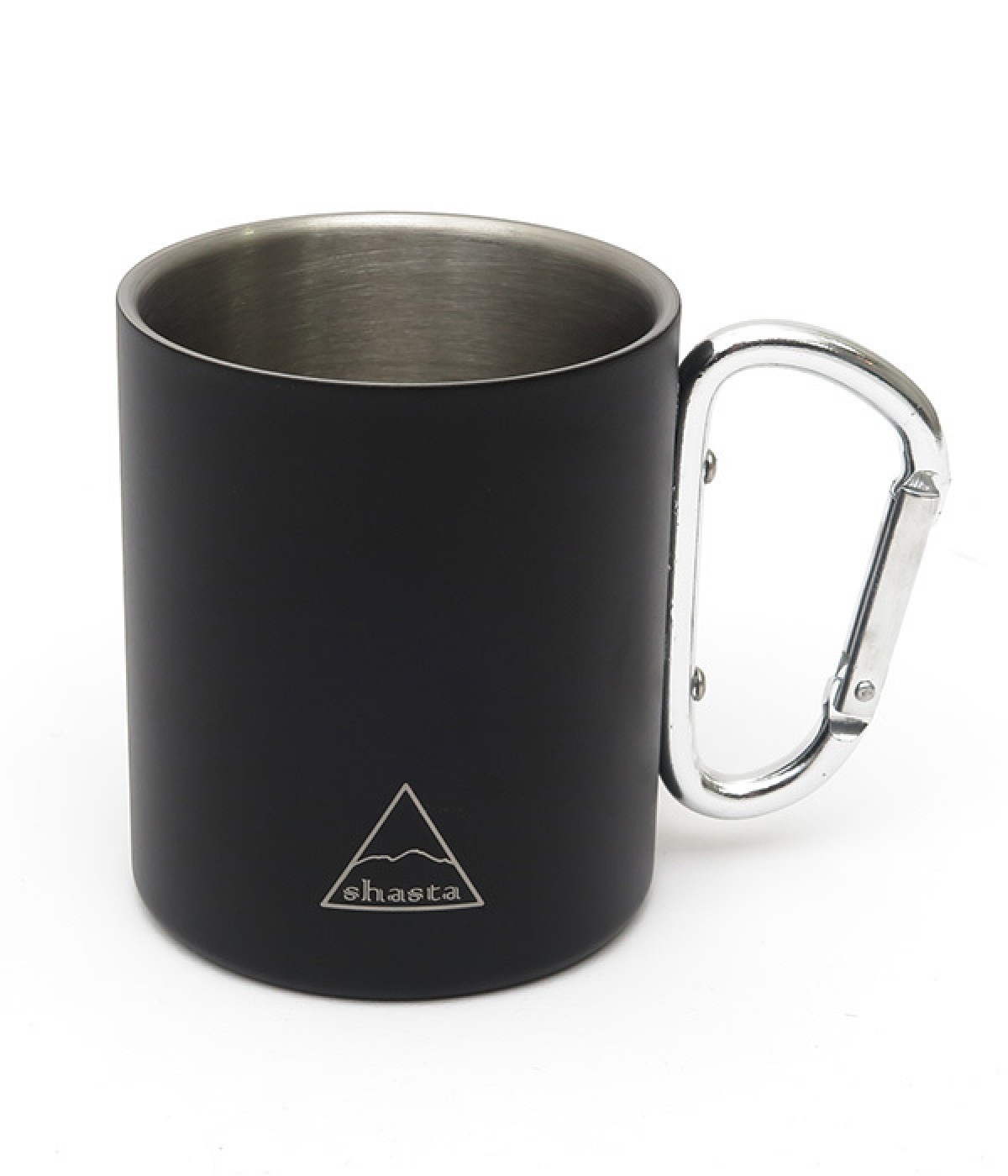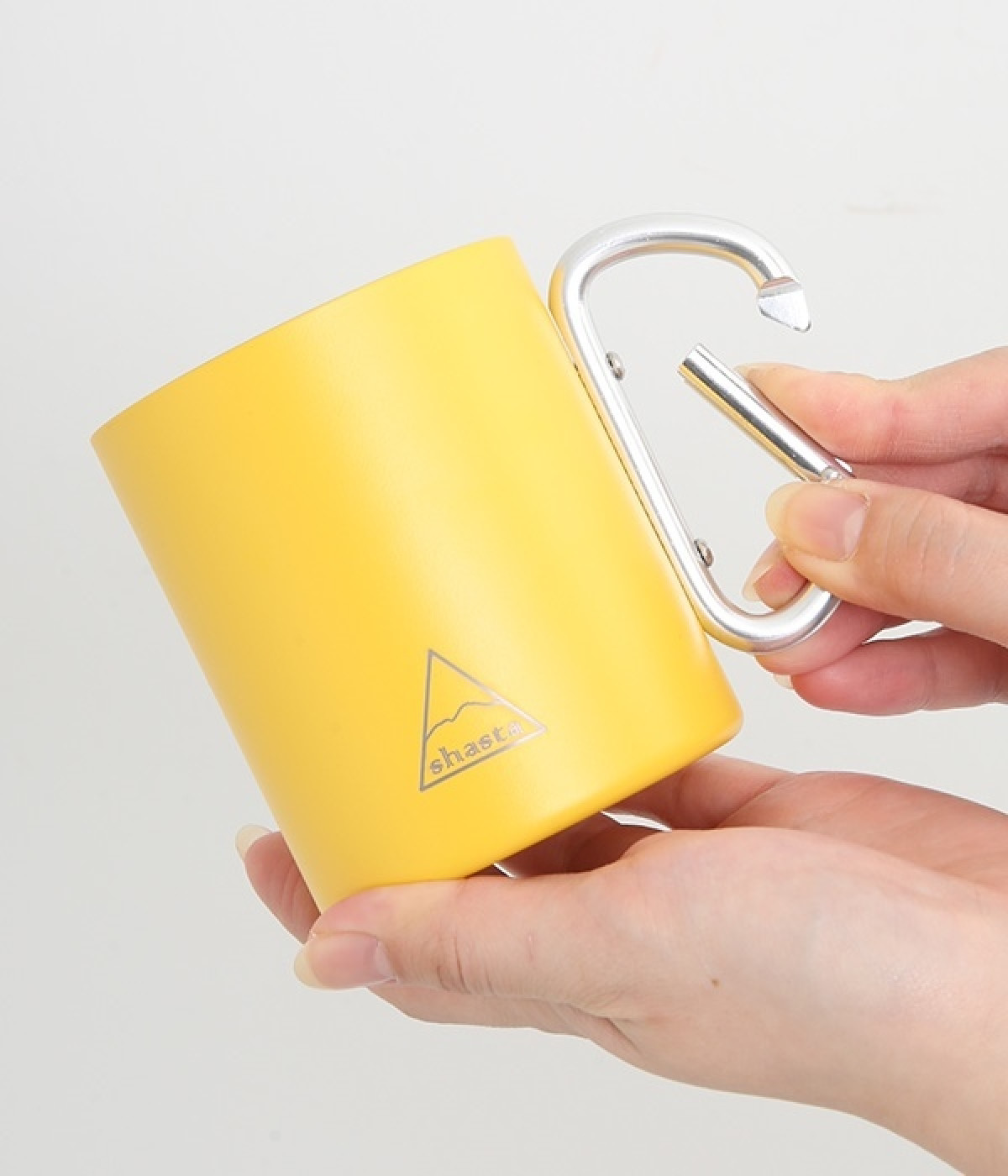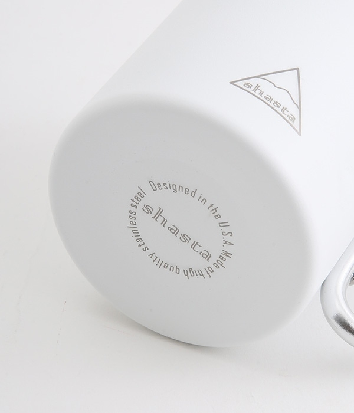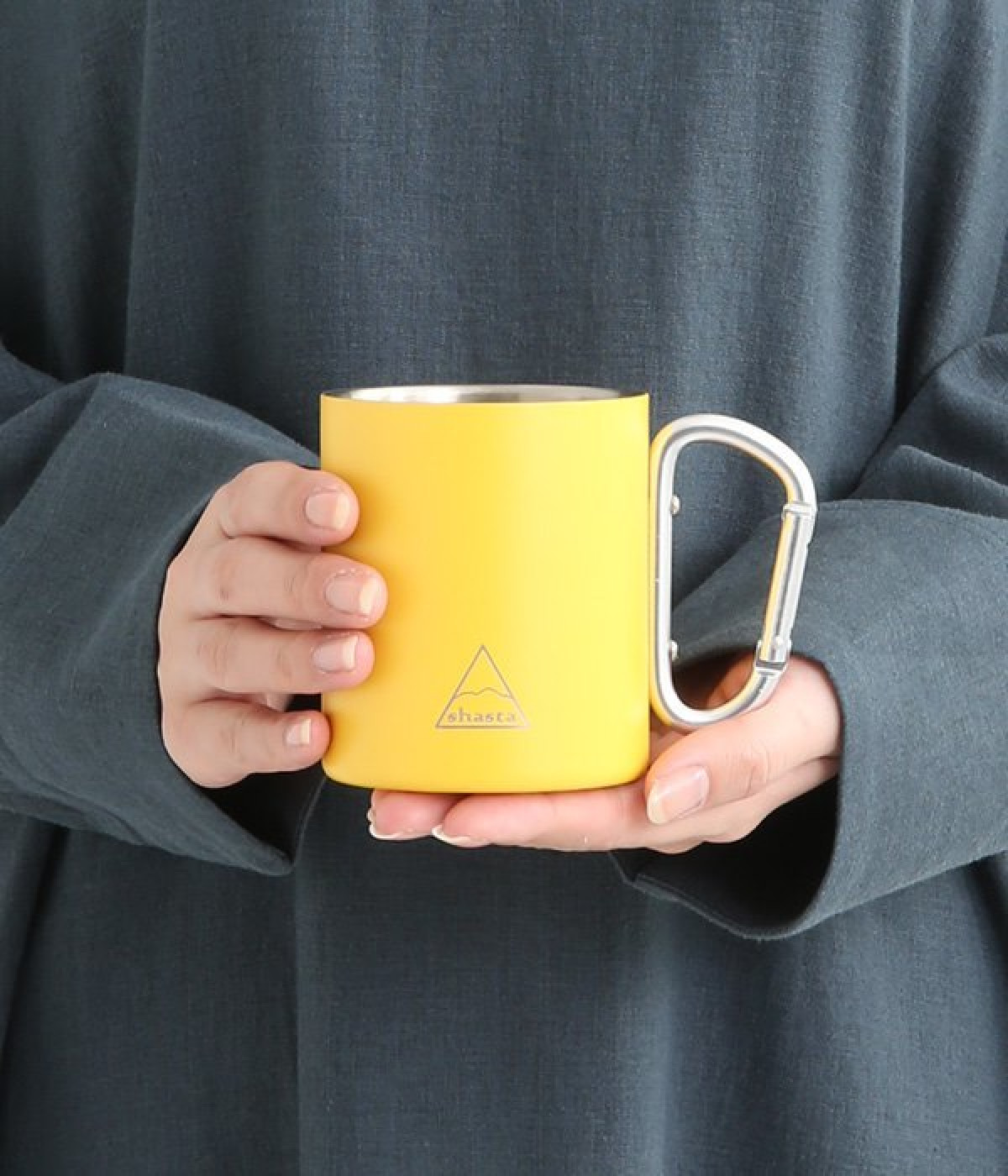 ハンドル部分がカラビナになった使いやすいマグカップです。持ち運びしやすく、取り付けられるため、おうちキャンプやバーベキューなど行楽にピッタリ。保温、保冷力が優れている二重構造、カップ外側は汚れがつきにくいパウダーコーティング、内側は錆びにくい高耐食のステンレスを採用した優れた機能性もポイントです。アメリカ発のブランドshastaはペットボトル飲料やお弁当等の購入を減らし、プラゴミなどの廃棄を減らすことで環境によいサイクルを作り出すことを提案するブランドです。