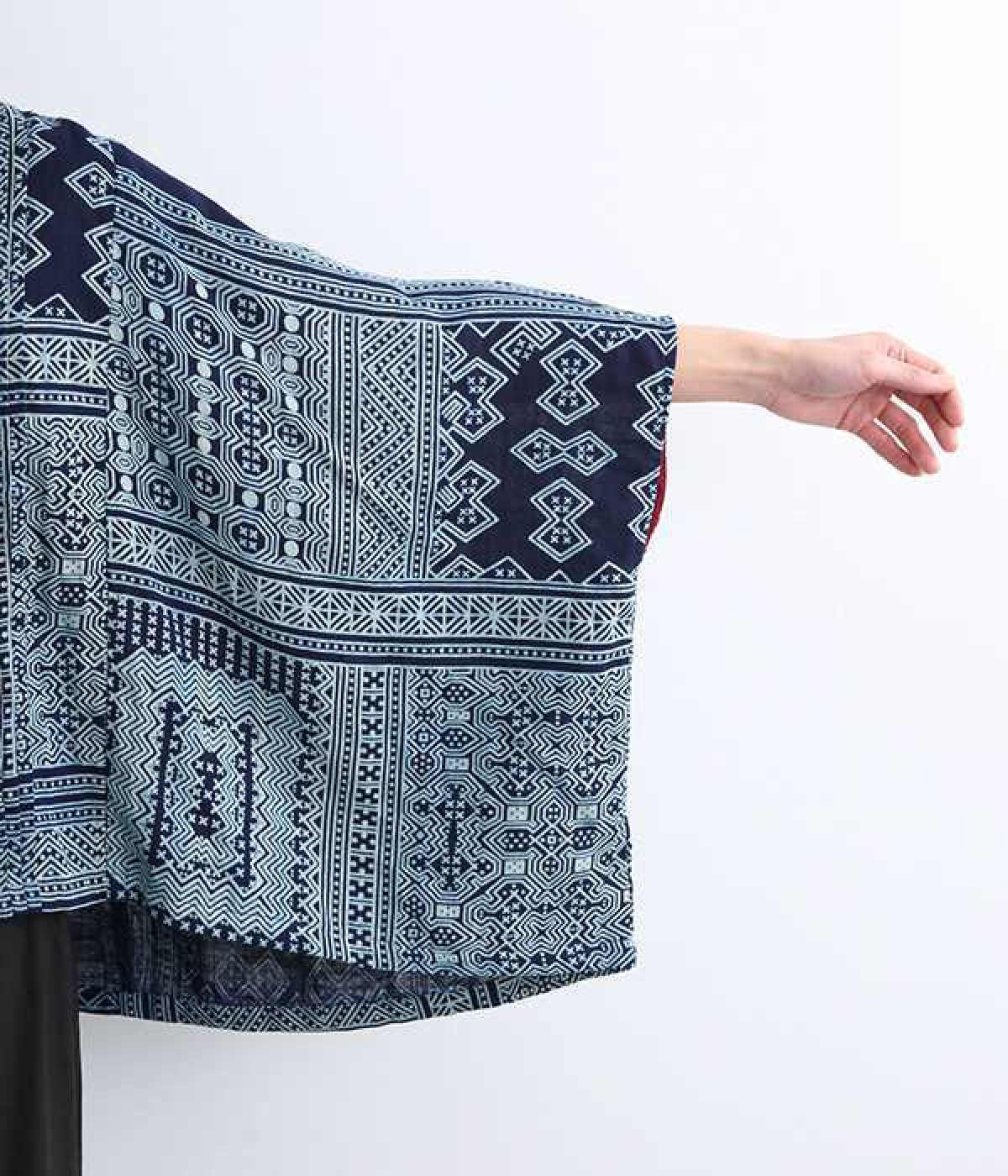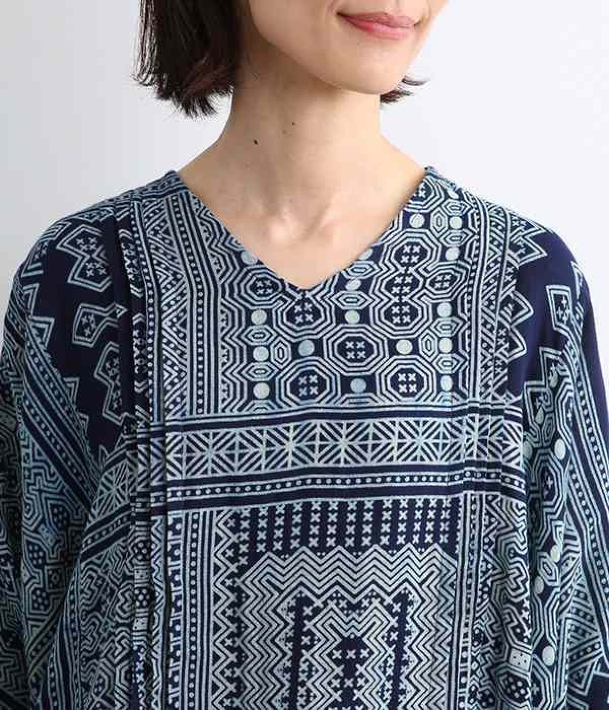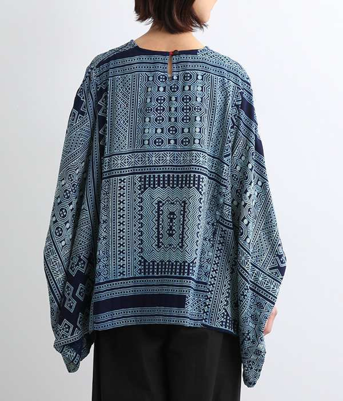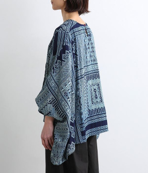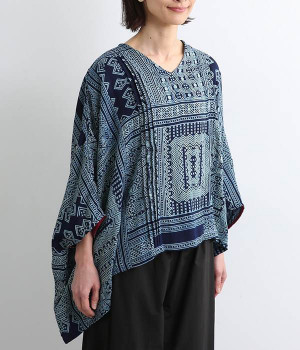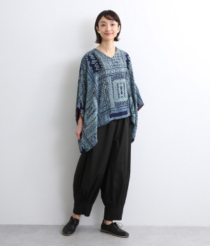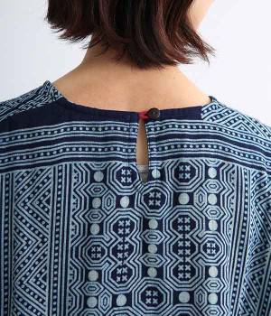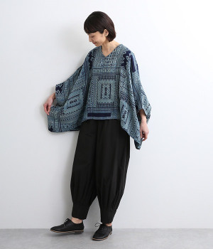 身近な自然の生き物や植物をモチーフとする、東南アジアに住むモン族の柄を取り入れた藍染のプリントプルオーバー。袖口裏の生地と後ろネックのボタンループにはアクセントカラーをきかせた、そのさりげさなさが素敵です。体をすぽっとおおうポンチョシルエットですが、首元をVネックにしてゆるくなり過ぎないバランスをとりました。