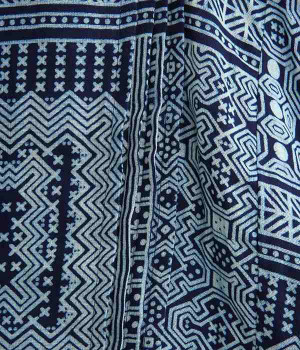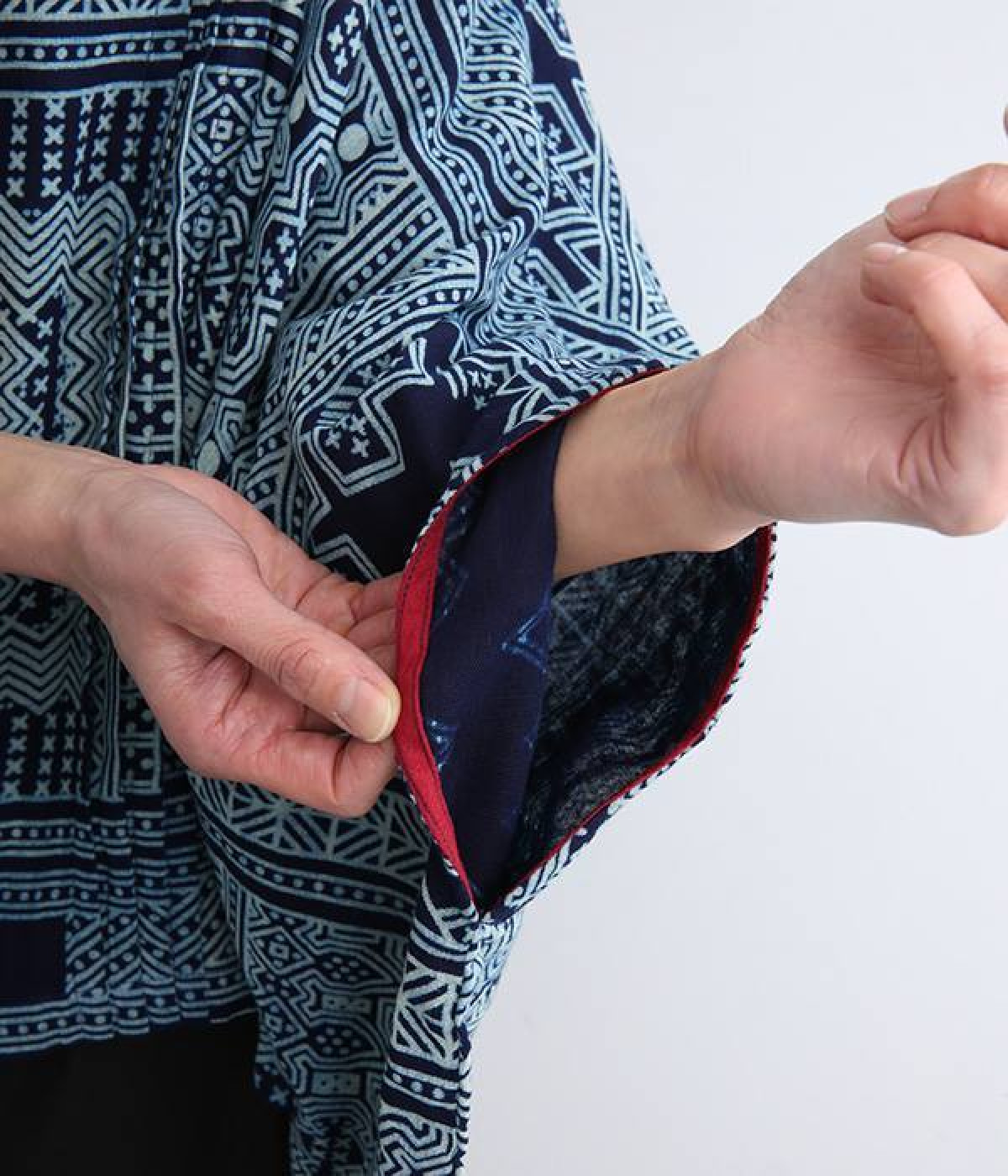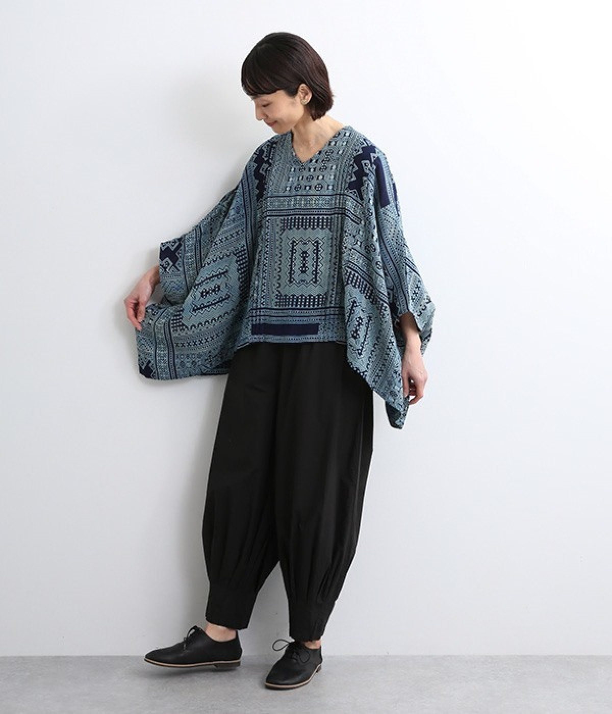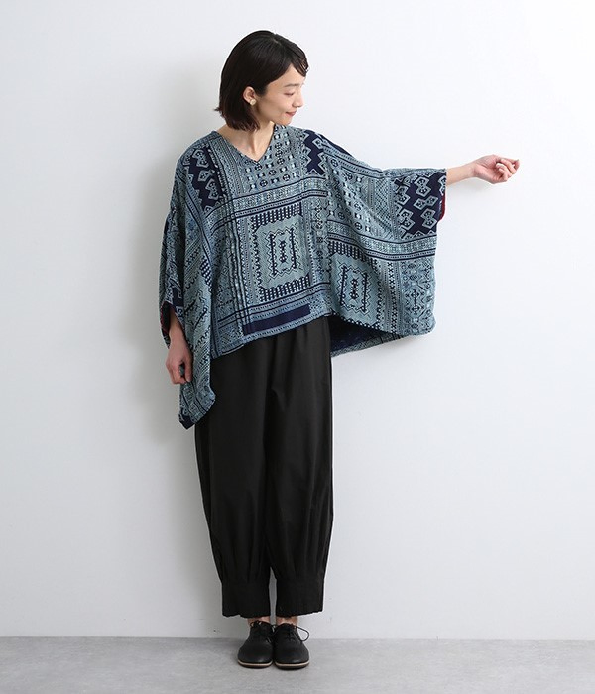 身近な自然の生き物や植物をモチーフとする、東南アジアに住むモン族の柄を取り入れた藍染のプリントプルオーバー。袖口裏の生地と後ろネックのボタンループにはアクセントカラーをきかせた、そのさりげさなさが素敵です。体をすぽっとおおうポンチョシルエットですが、首元をVネックにしてゆるくなり過ぎないバランスをとりました。