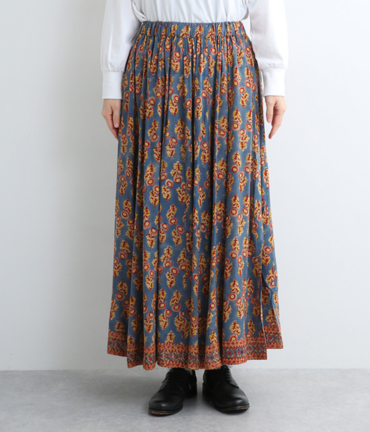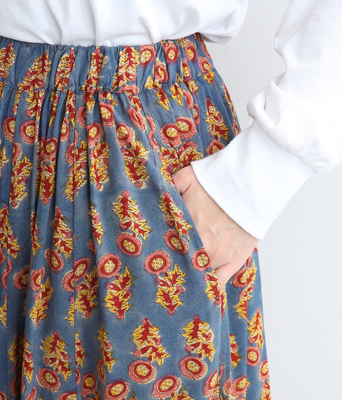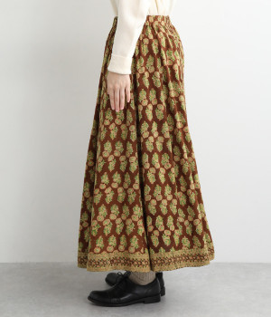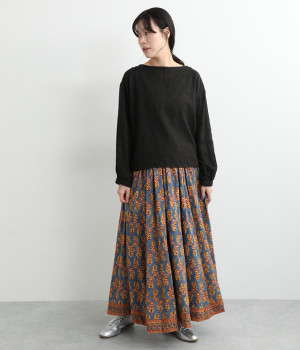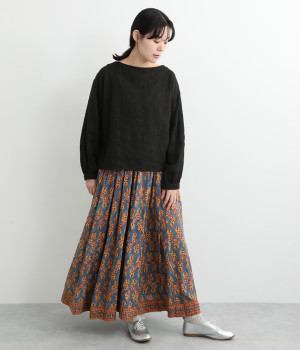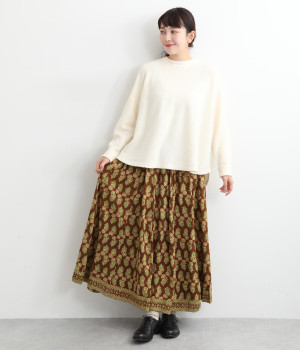 目を引くオリエンタル柄はシンプルなトップスと好相性
