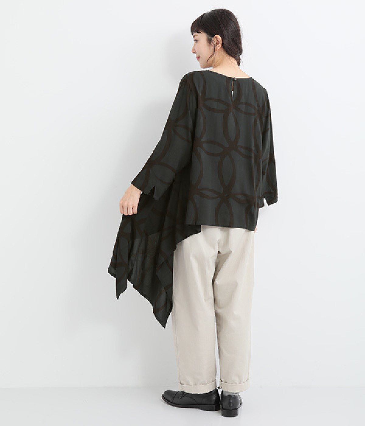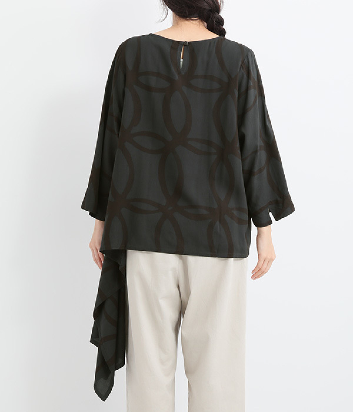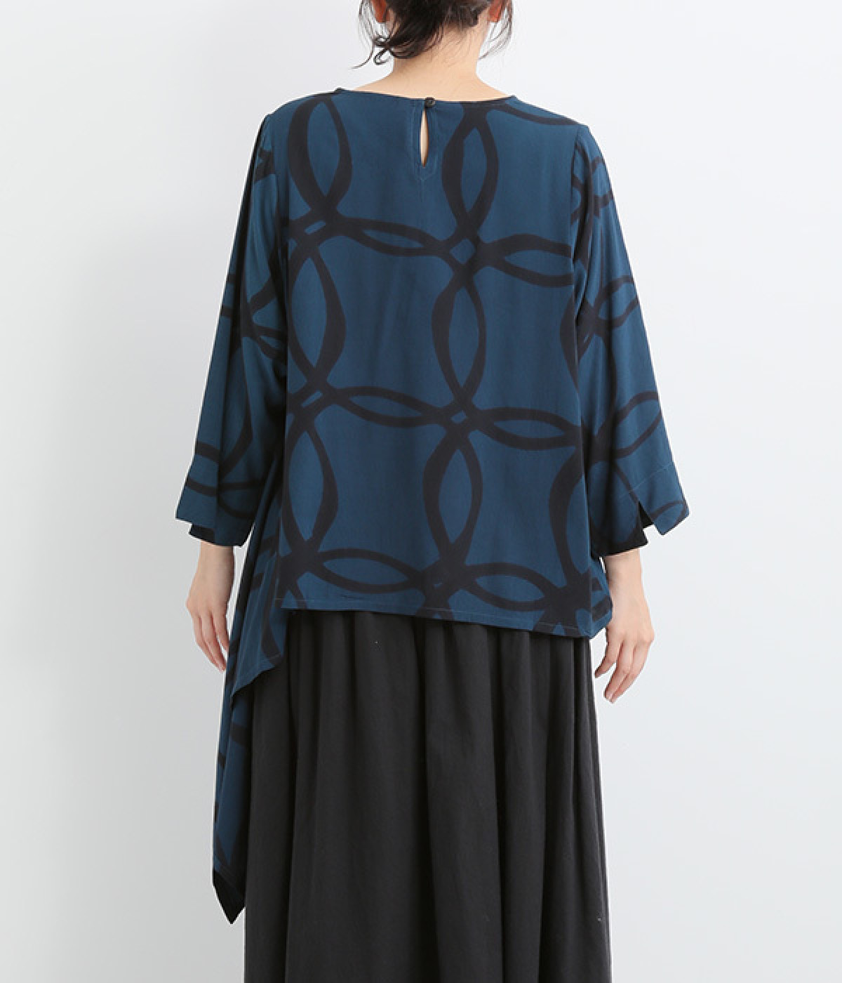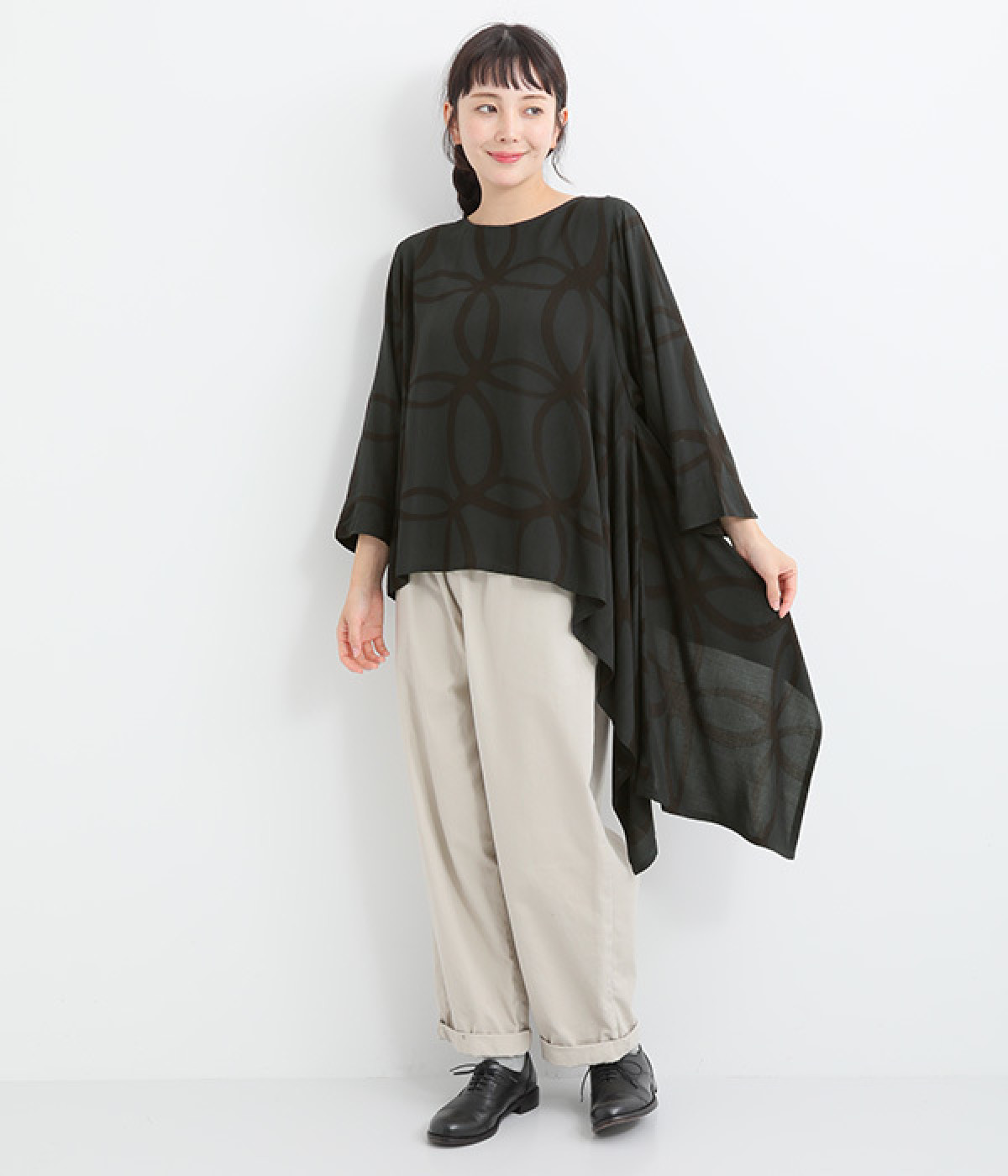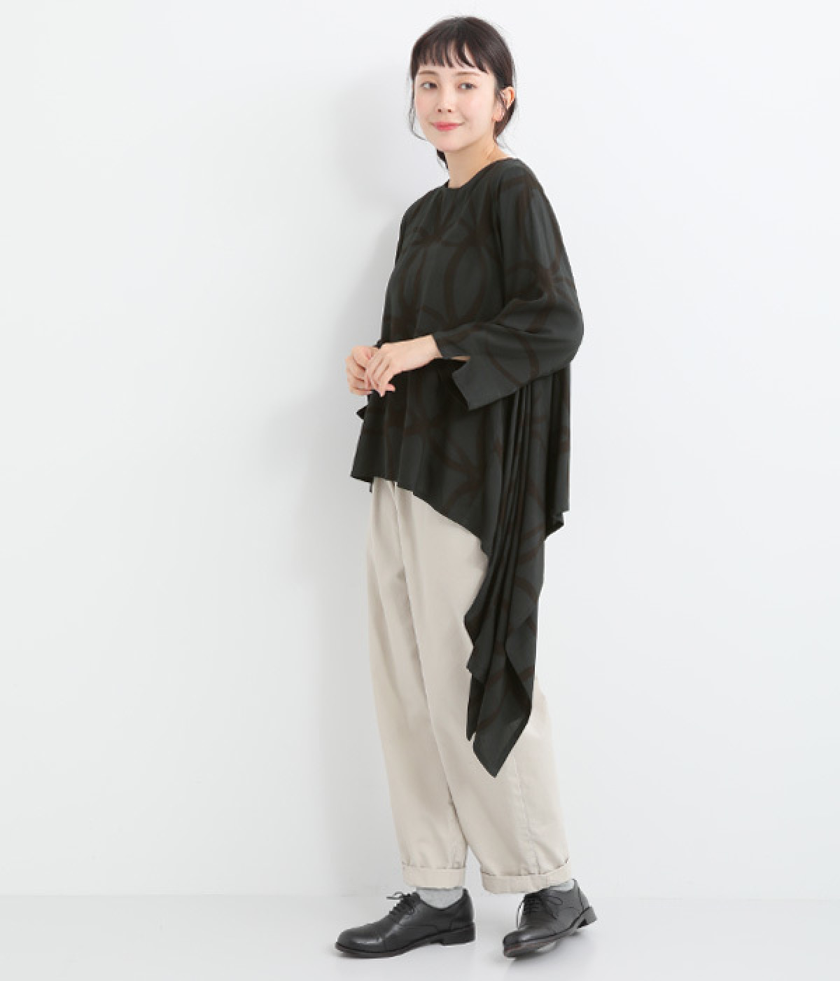 動くたびに揺れ動くアシンメトリーな裾ラインが優雅