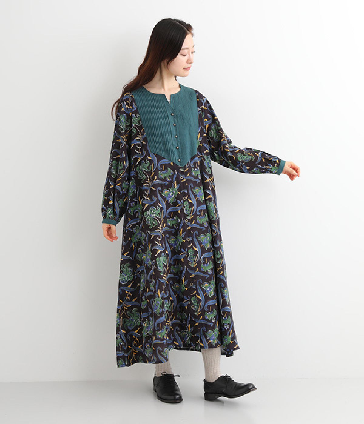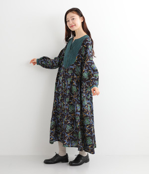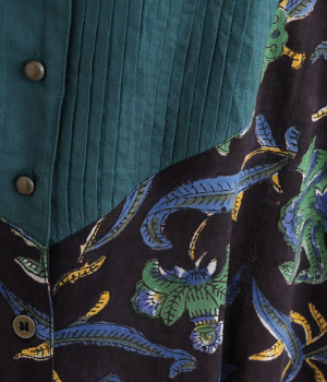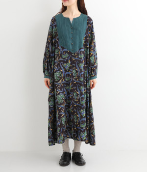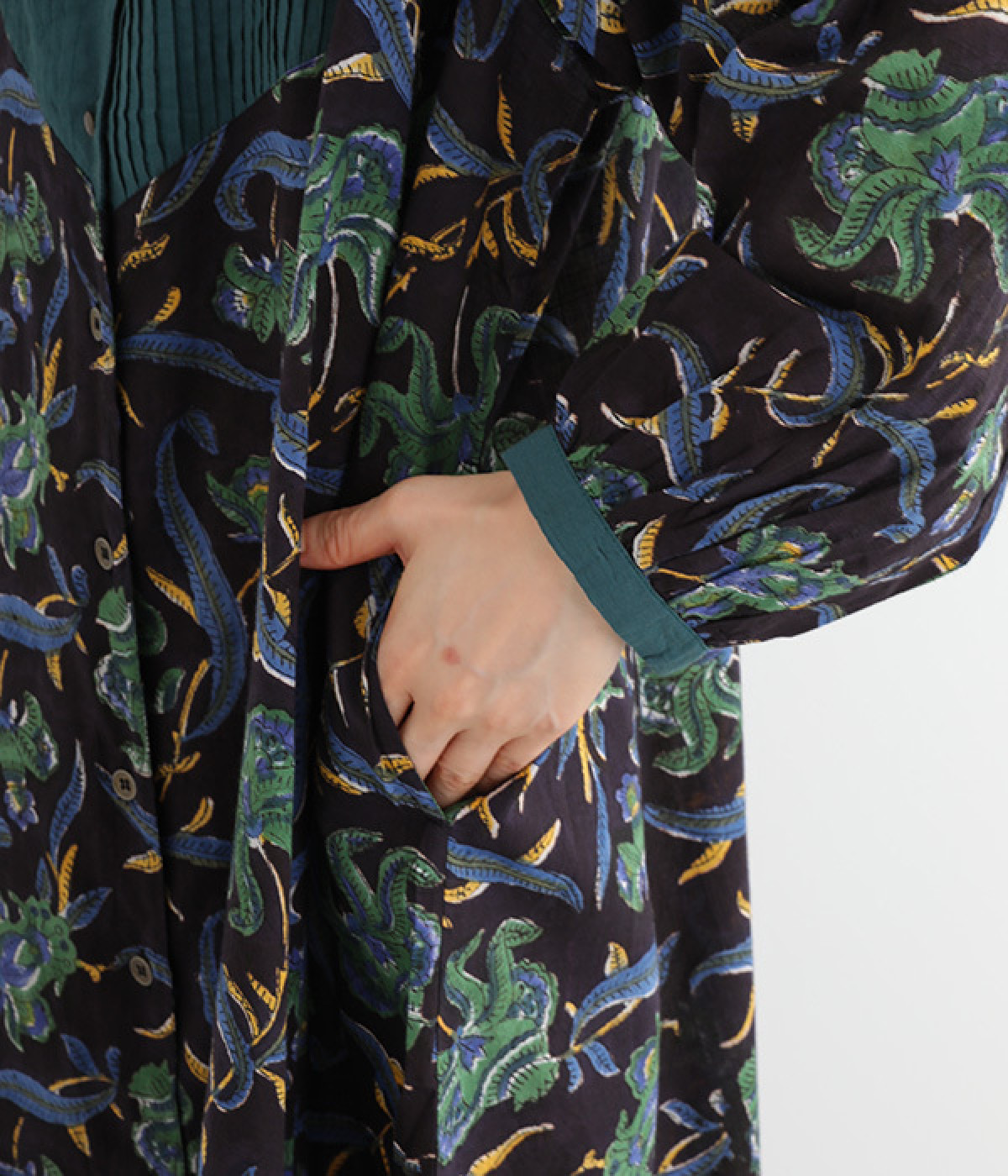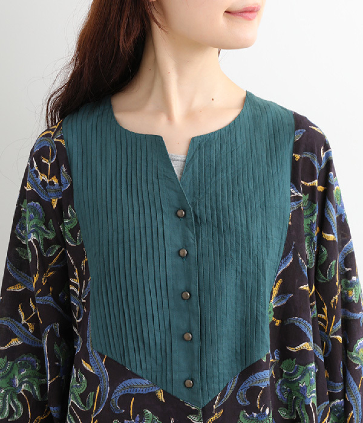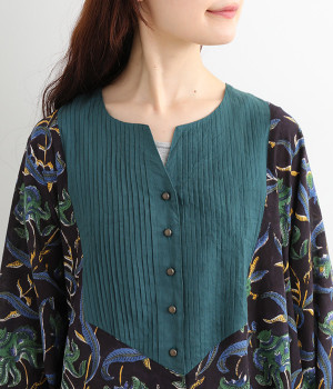 胸元のピンタックや袖口を無地に切り替えてメリハリを
