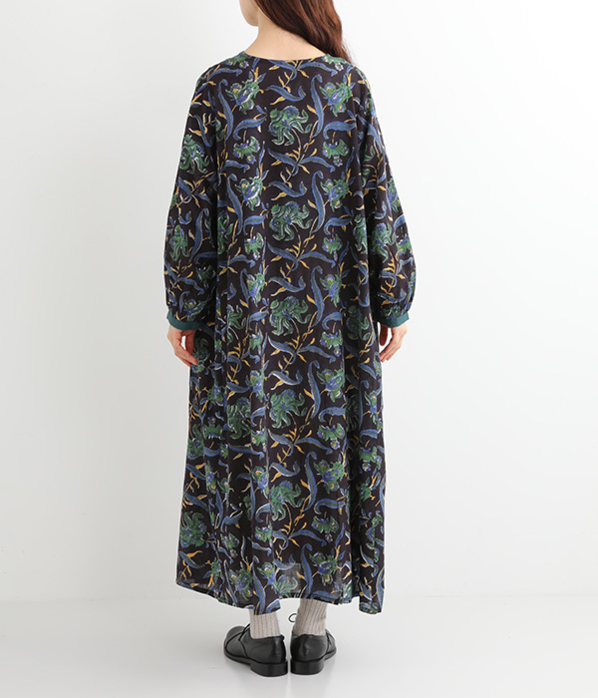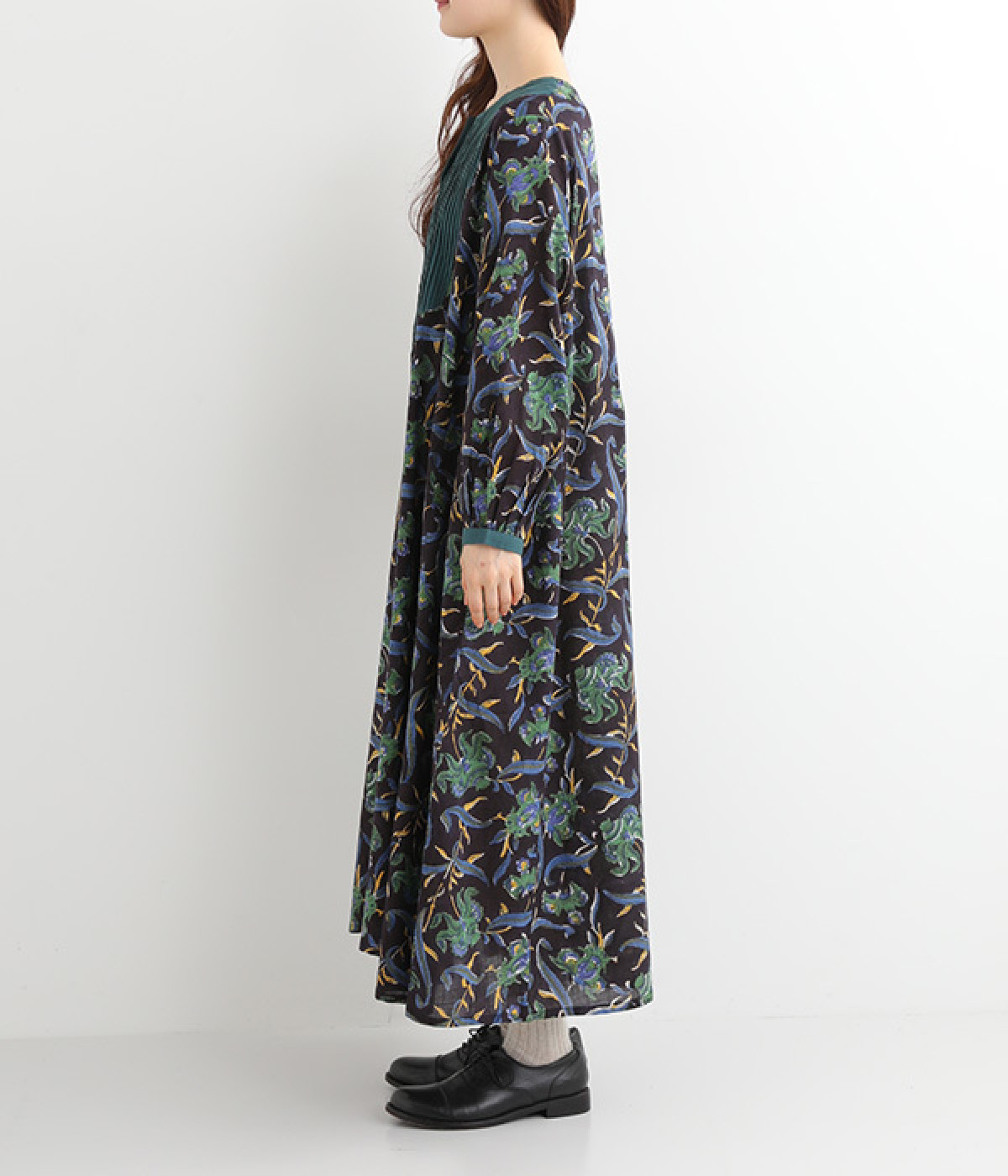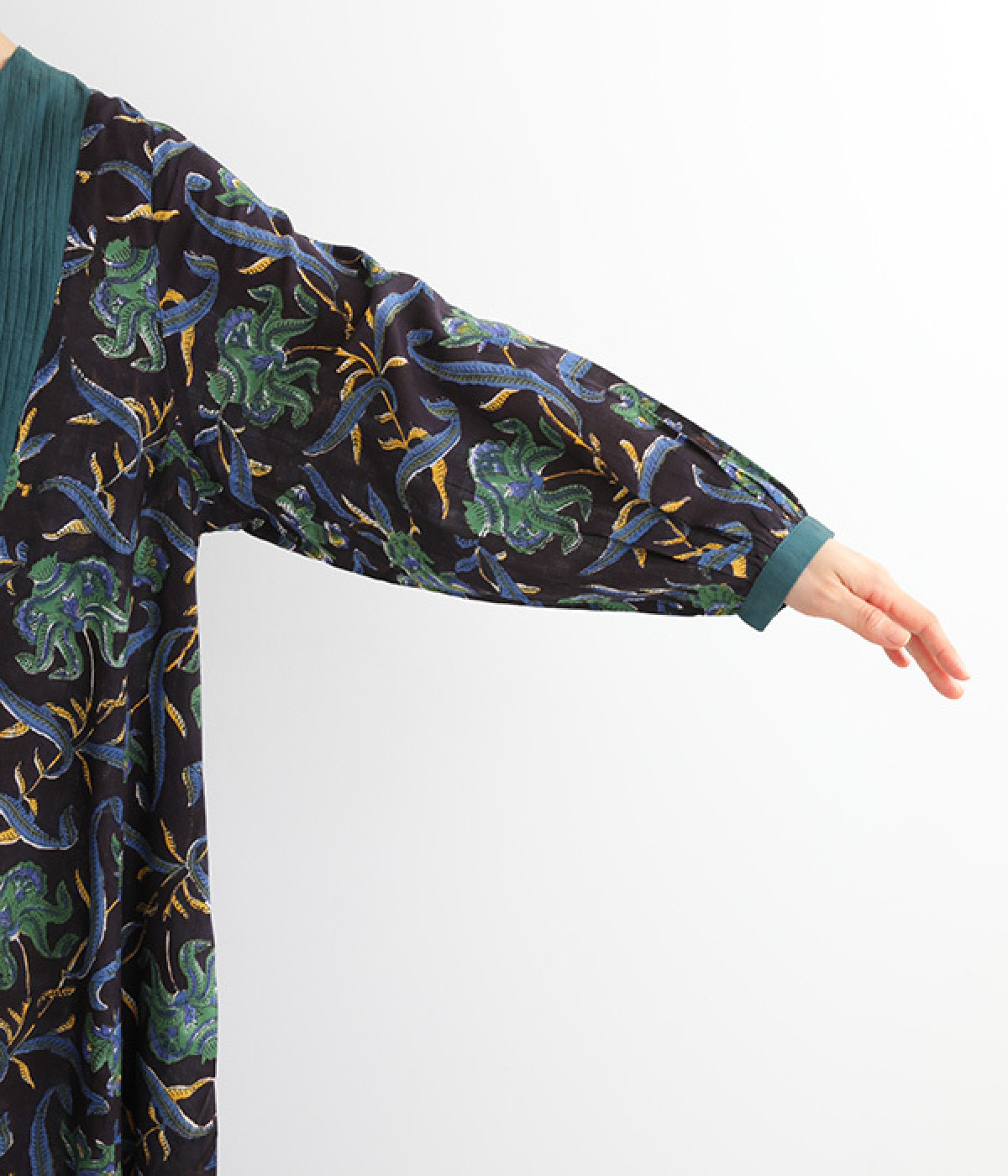 胸元のピンタックや袖口を無地に切り替えてメリハリを