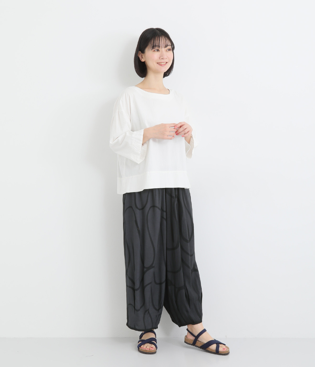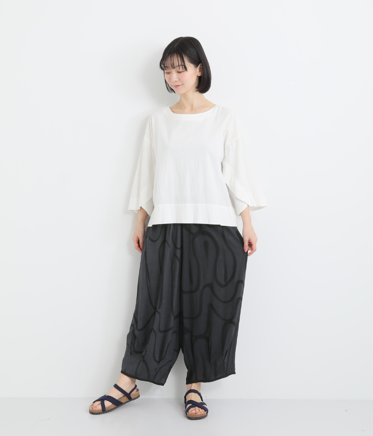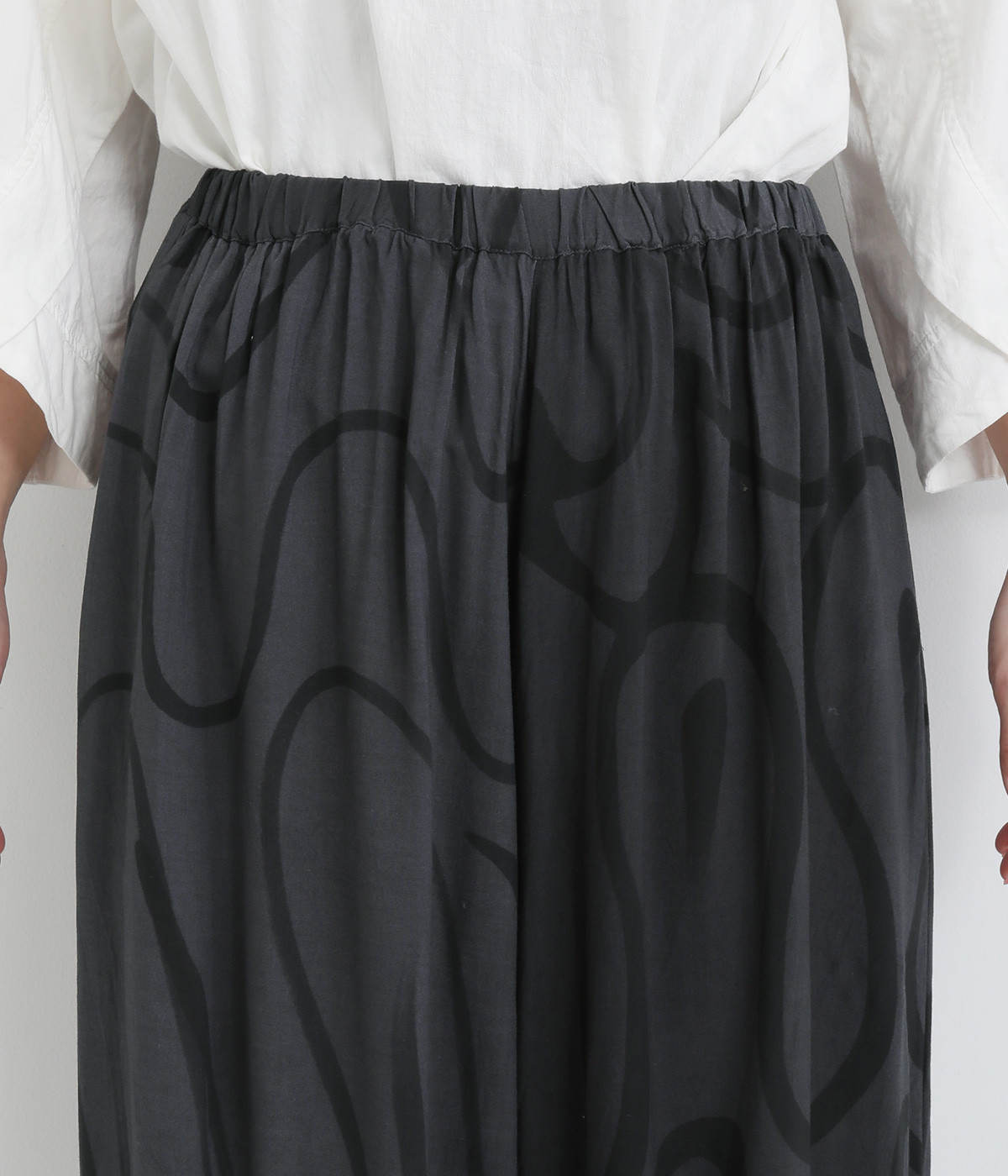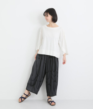 とろみのある薄手のレーヨン生地を使用。美しいドレープが軽やかなシルエットを生み出します。肌にやさしくなじむ滑らかな質感が特徴です。