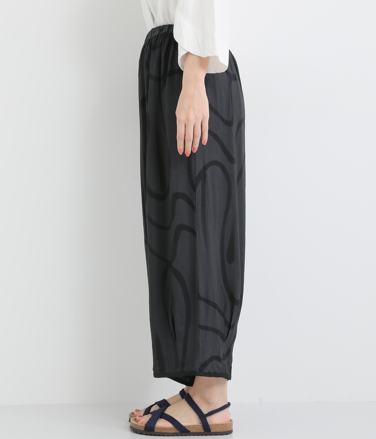 インドの工房で丁寧に描かれた、味わいのある線柄が目を惹くバルーンパンツ。裾に無地のパイピングを施し、さり気ないメリハリを添えました。ゆるやかなシルエットで風通しがよく、暑い季節も心地よく過ごせる一枚に。