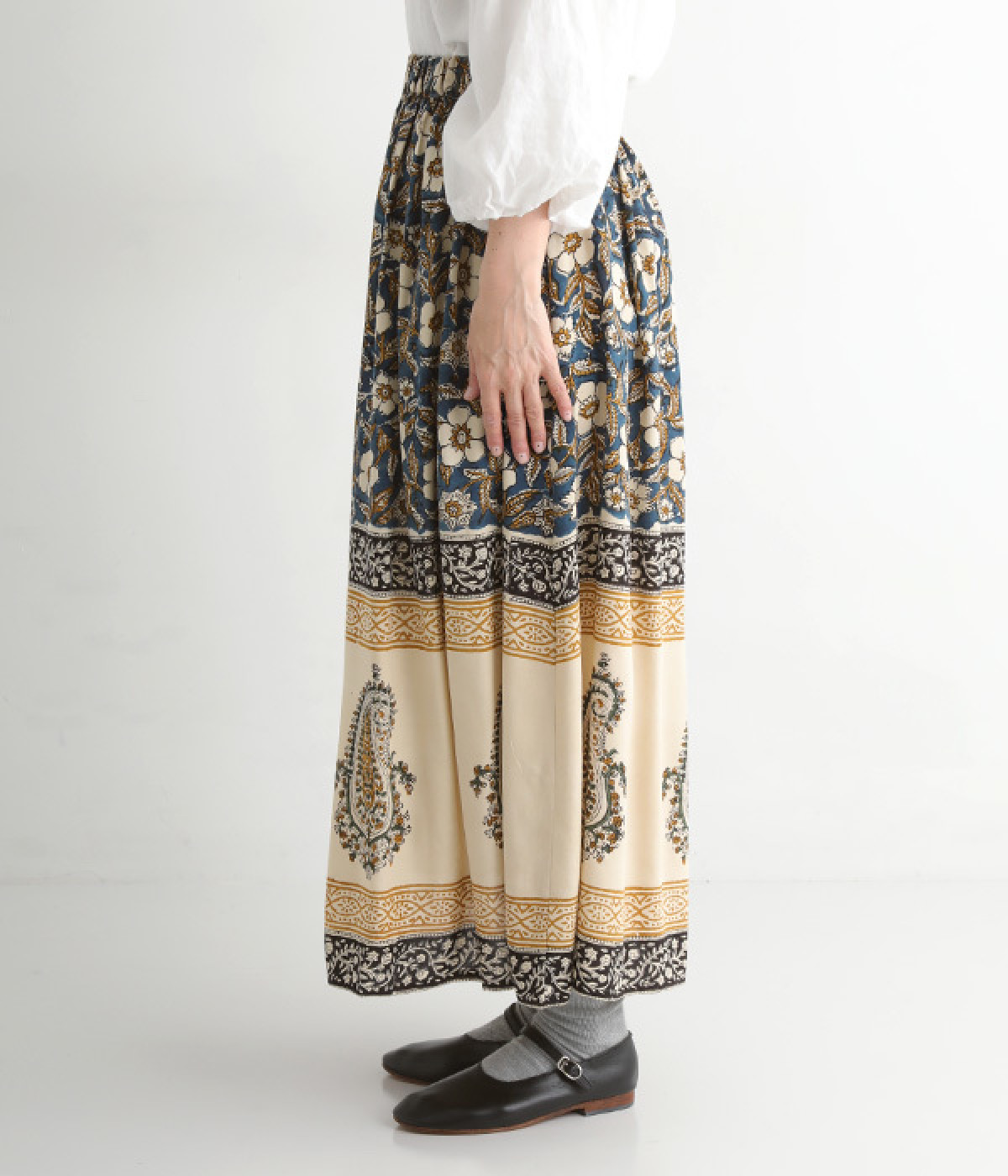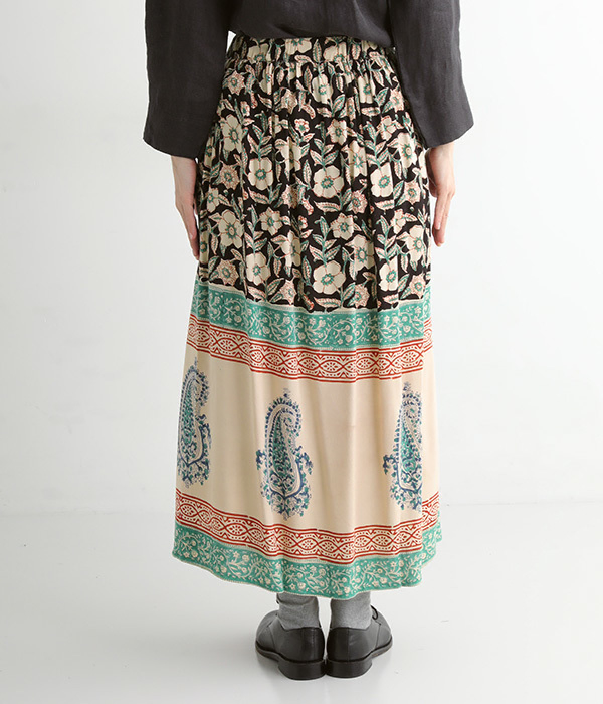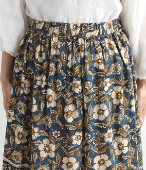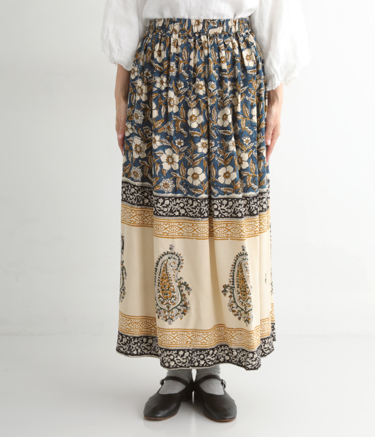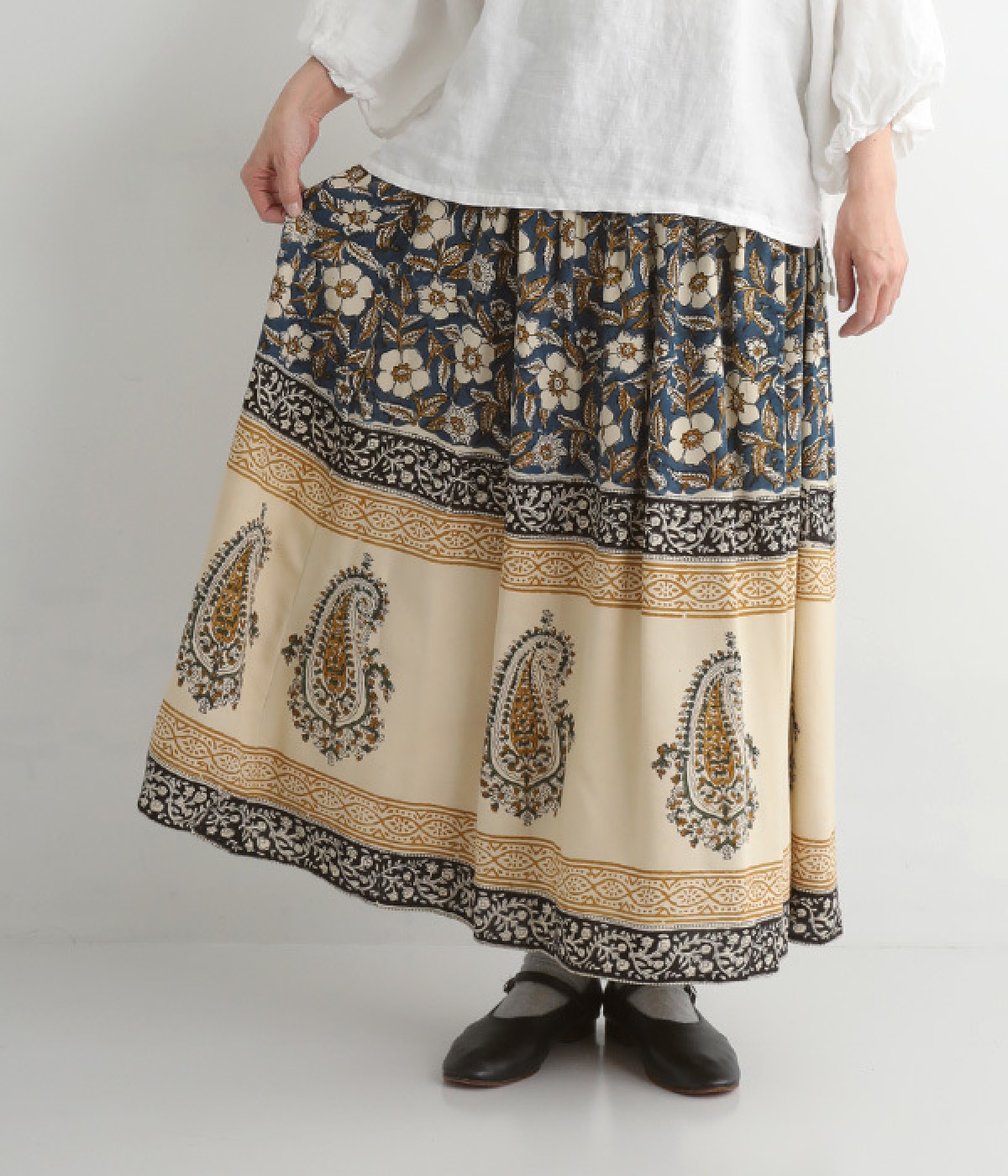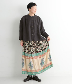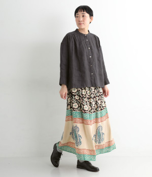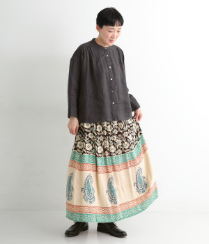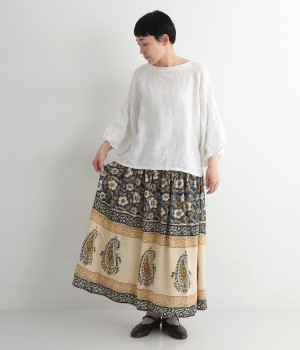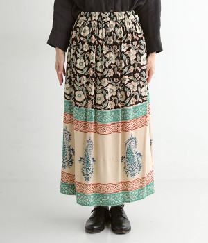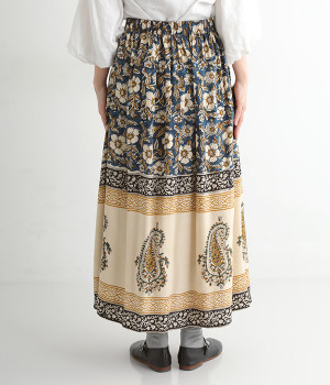 花やペイズリーなどのさまざまな柄を組み合わせたロングスカートです。裾には大きな柄を配置してアクセントに。ウエストは幅広めのゴムを入れて、すっきりと仕上げています。無地のシンプルなトップス合わせで、柄を主役にしたコーディネートもおすすめ。