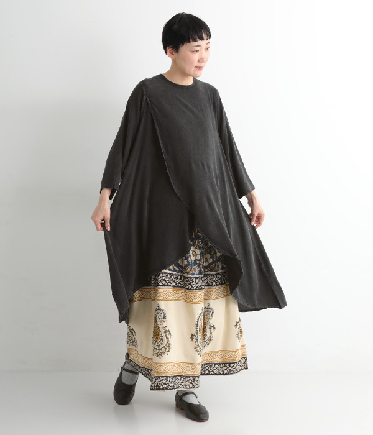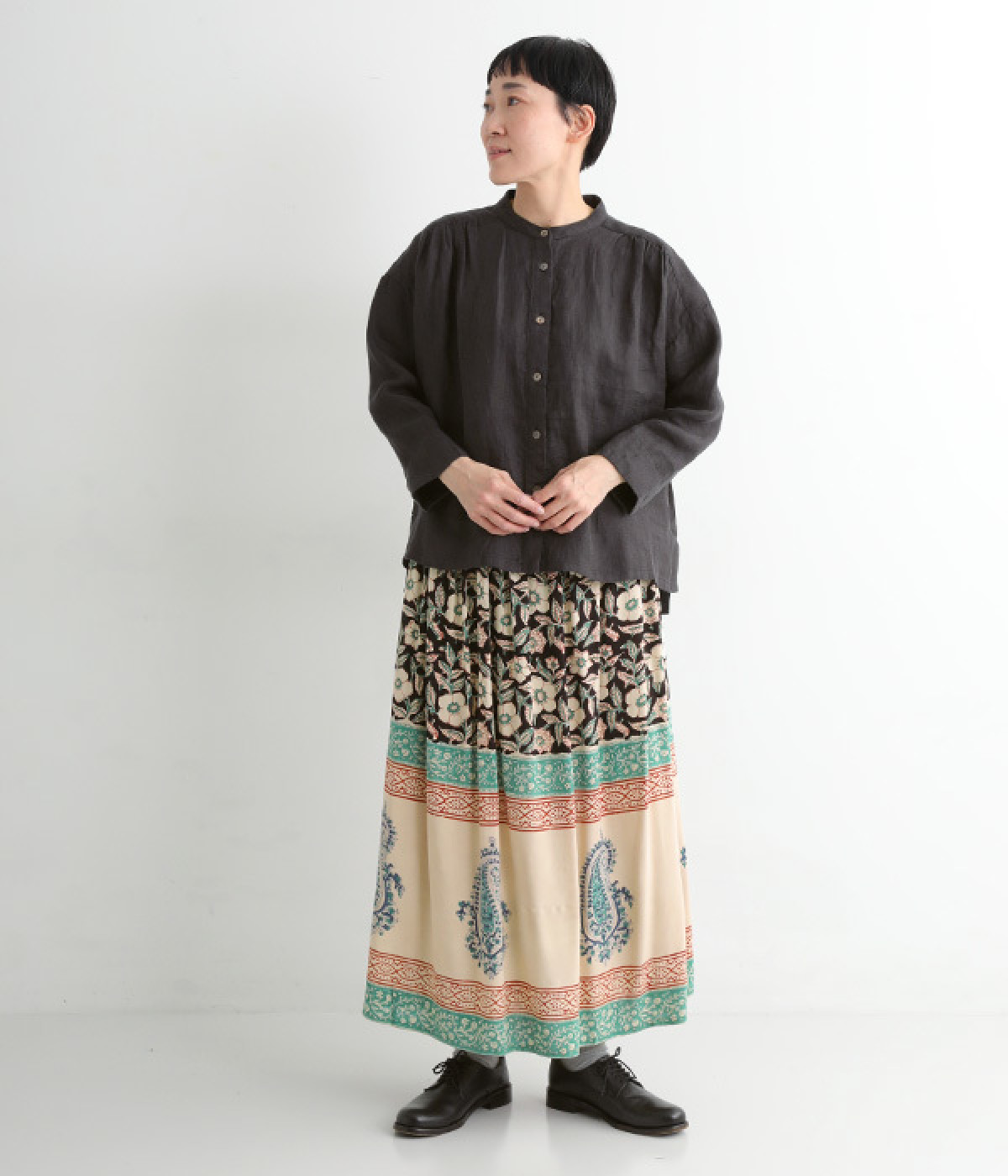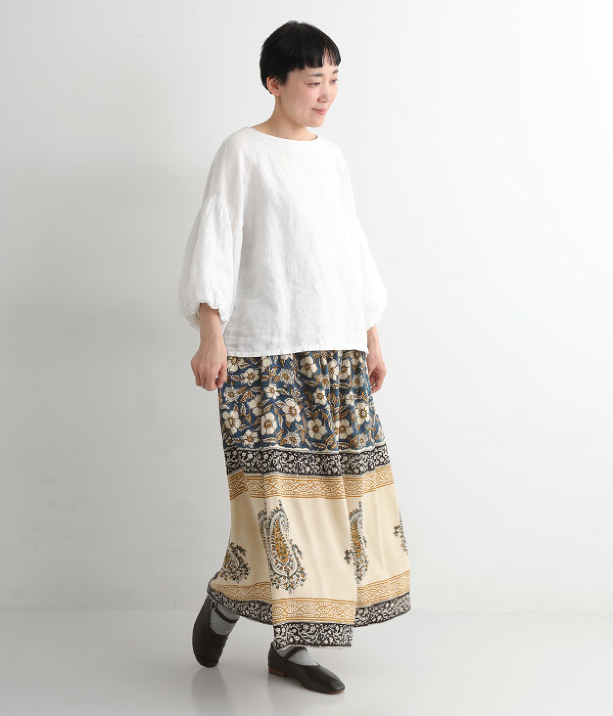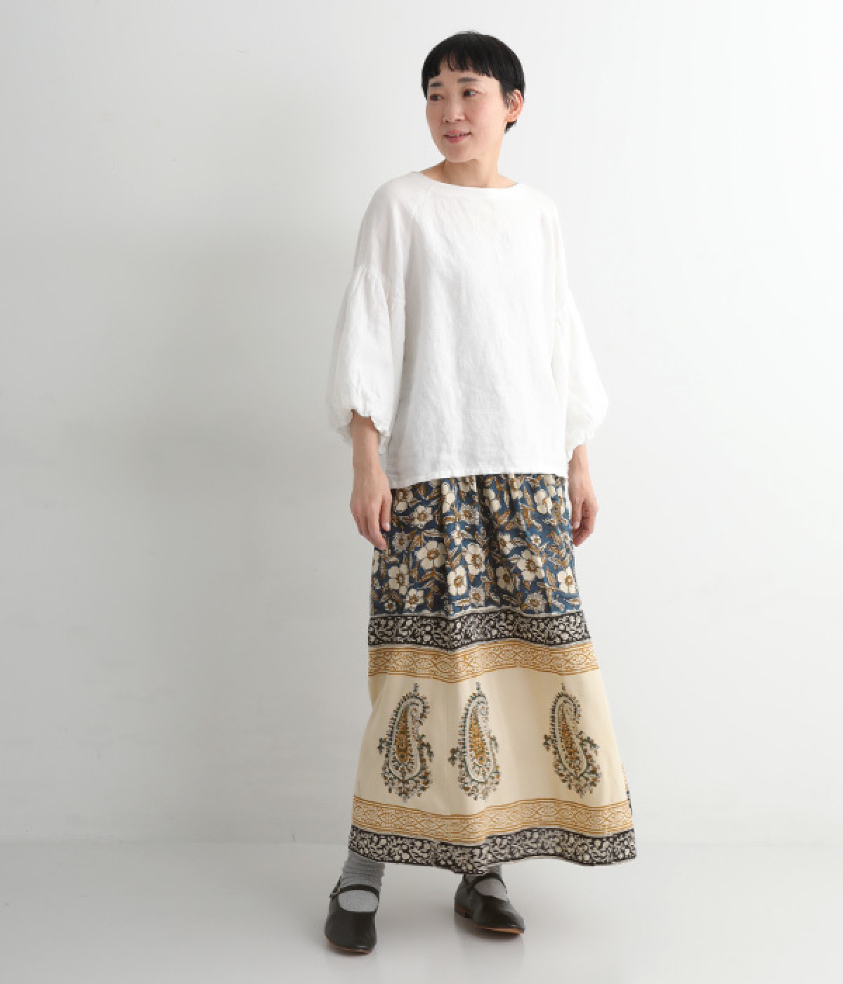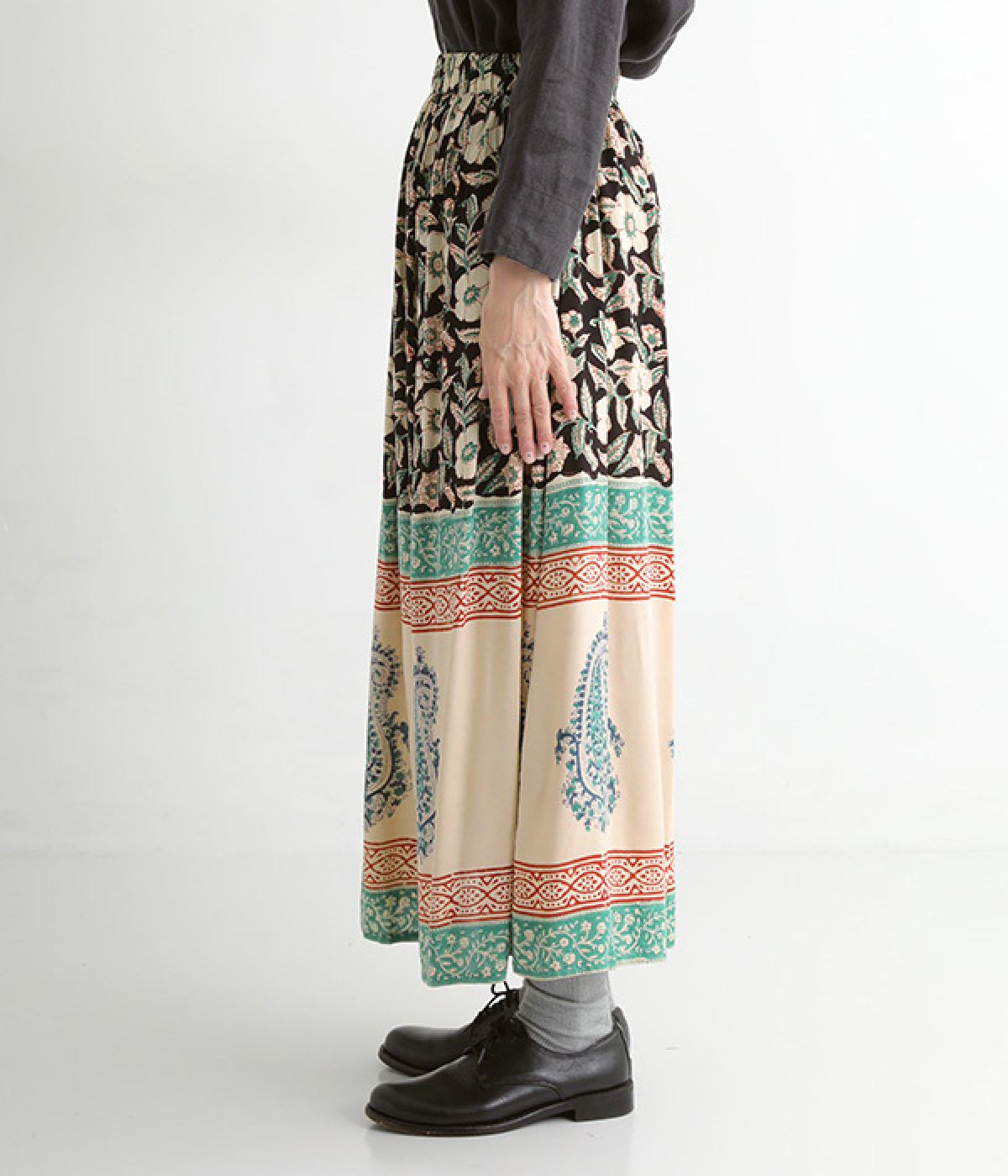 花やペイズリーなどのさまざまな柄を組み合わせたロングスカートです。裾には大きな柄を配置してアクセントに。ウエストは幅広めのゴムを入れて、すっきりと仕上げています。無地のシンプルなトップス合わせで、柄を主役にしたコーディネートもおすすめ。