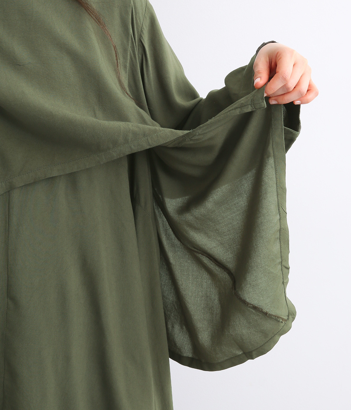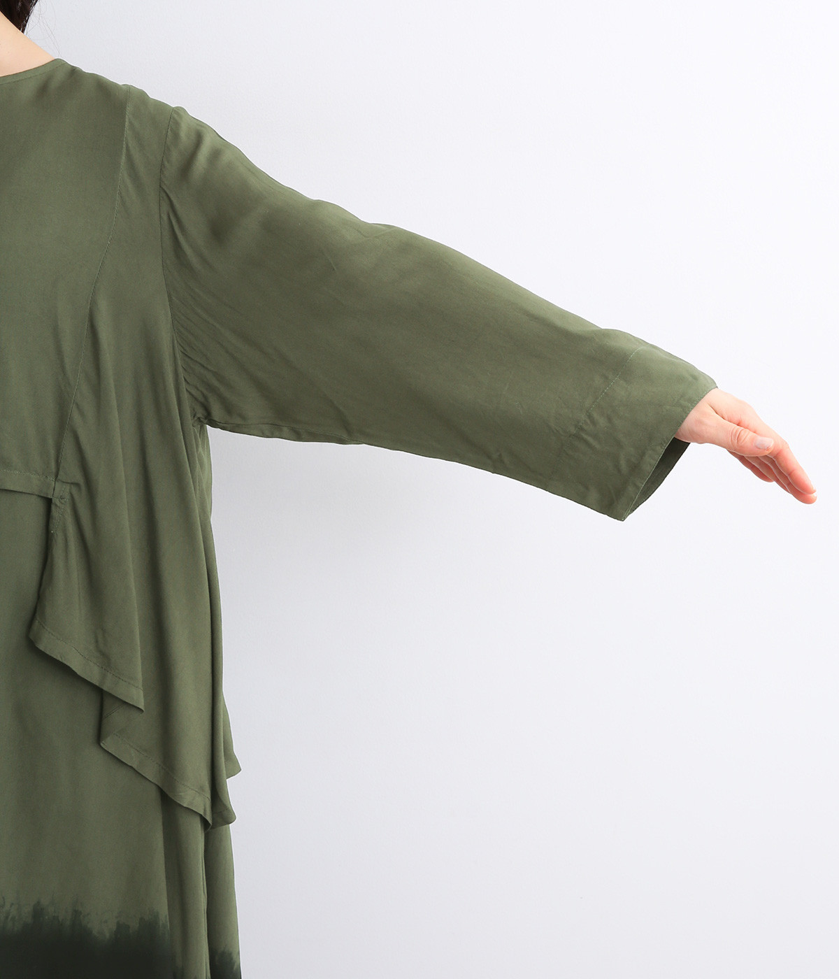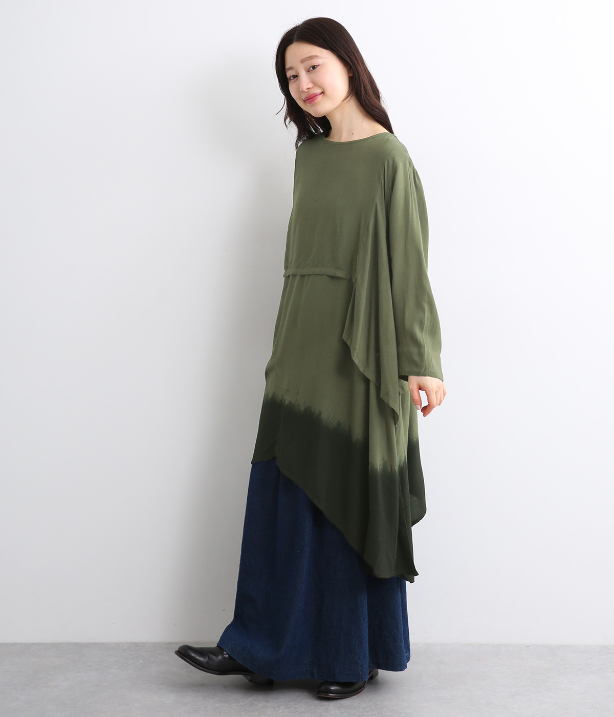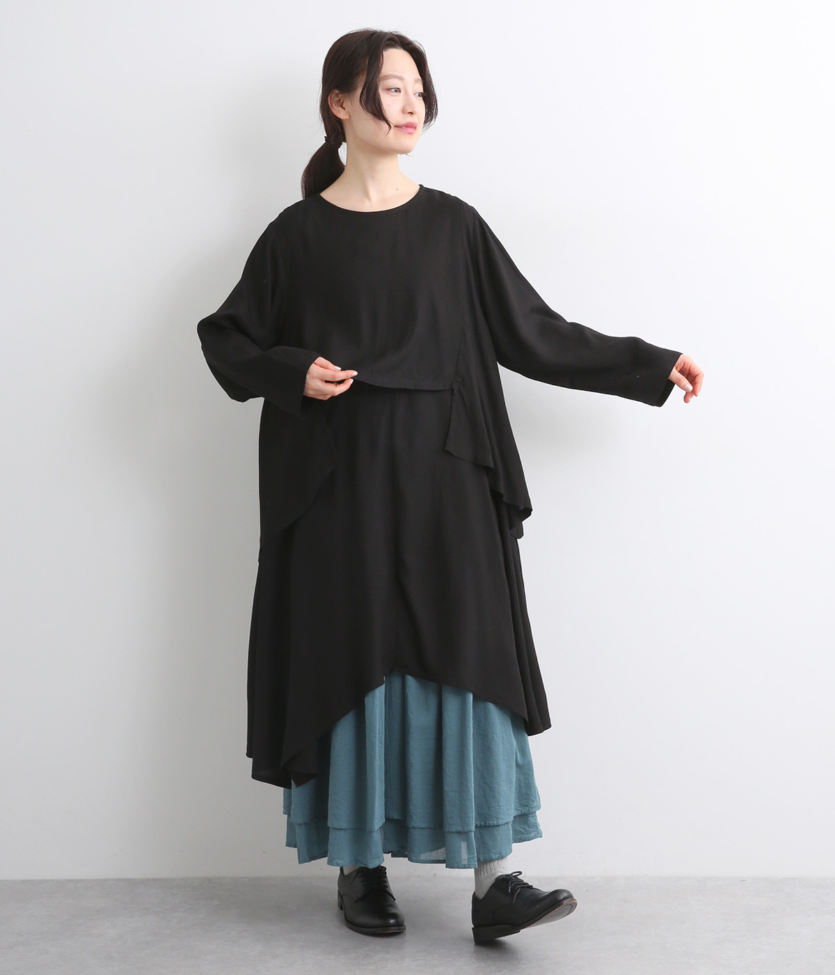 動くたびにやわらかなドレープが揺れるフレアシルエット