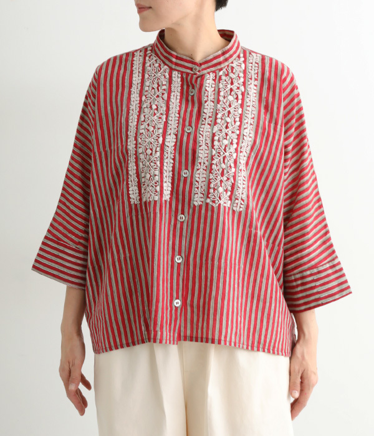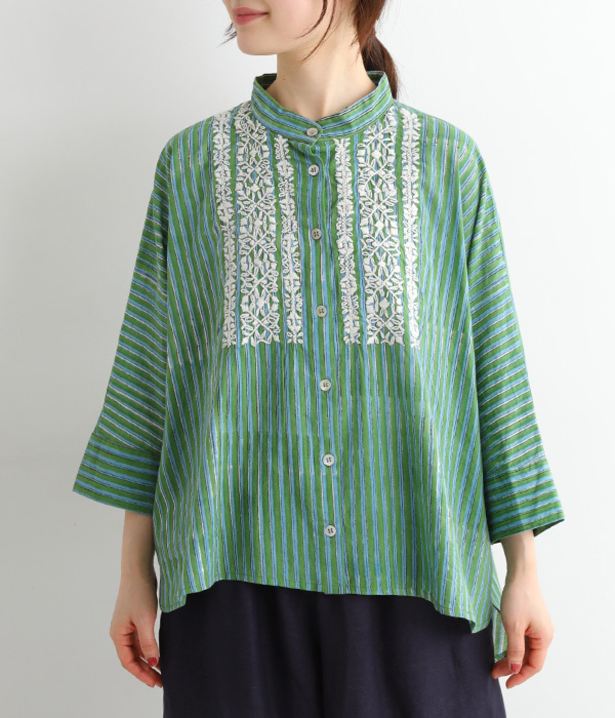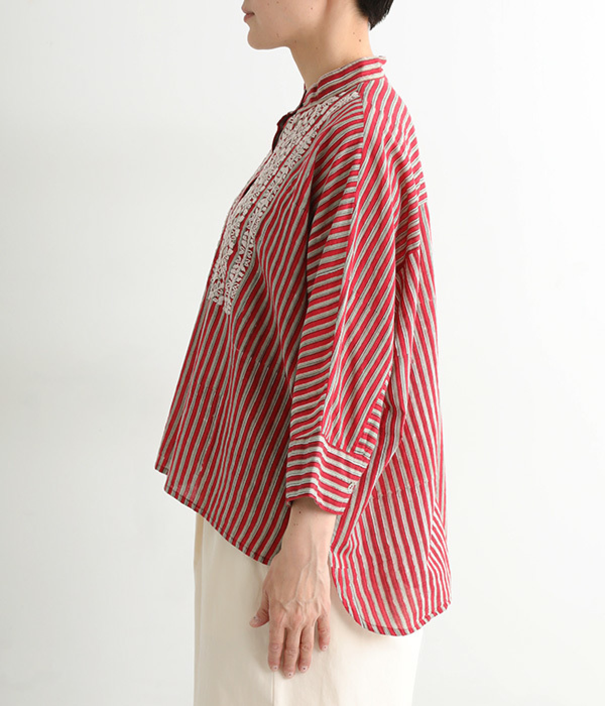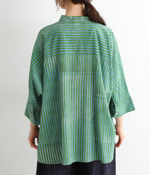 スタンドカラーと明るい色合いが爽やかな印象を与えるブラウス。前後差のある着丈で、ふわりとしたエアリーなシルエットが描かれています。シンプルなボトムスにさっと合わせるだけでサマになる、大人のエスニックアイテムです。