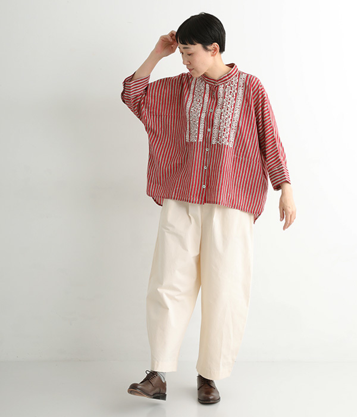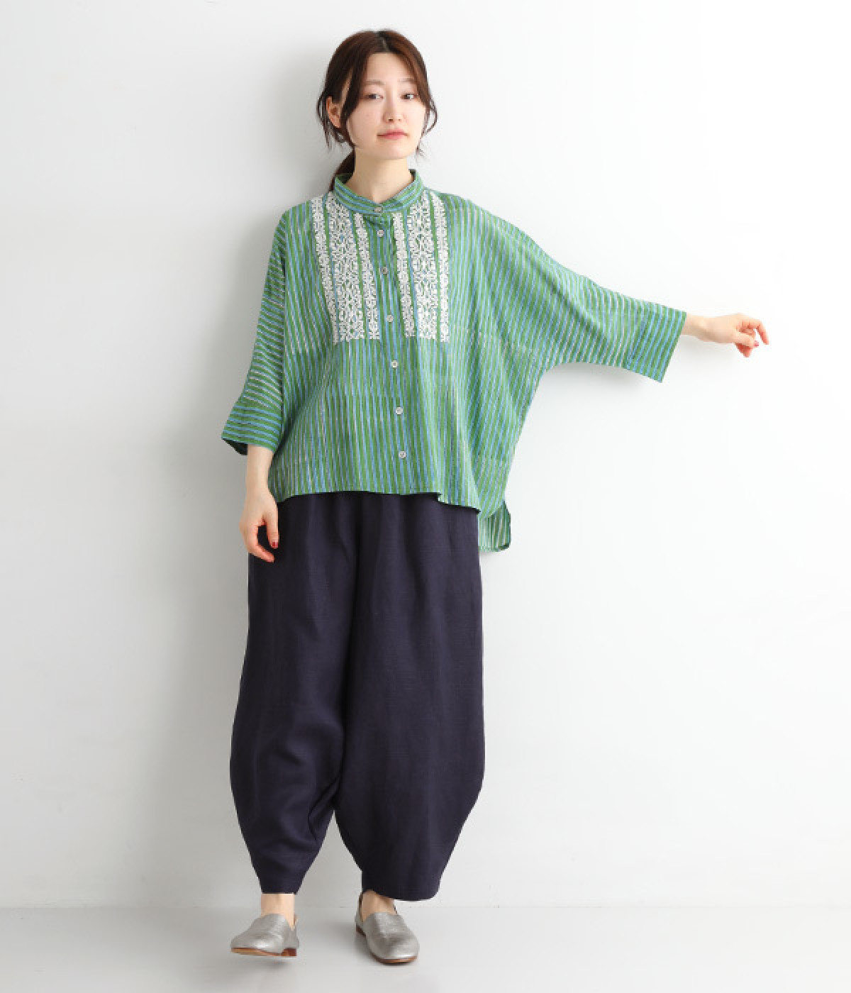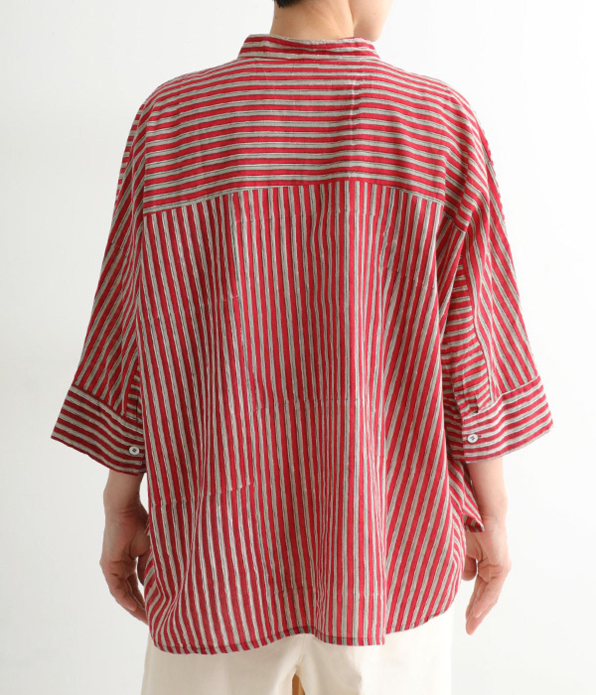 スタンドカラーと明るい色合いが爽やかな印象を与えるブラウス。前後差のある着丈で、ふわりとしたエアリーなシルエットが描かれています。シンプルなボトムスにさっと合わせるだけでサマになる、大人のエスニックアイテムです。