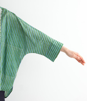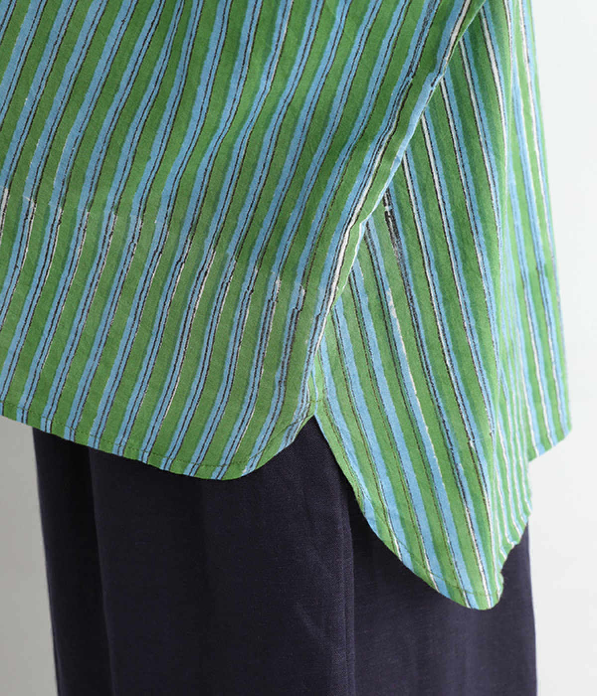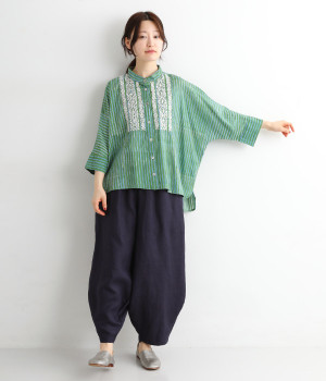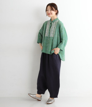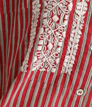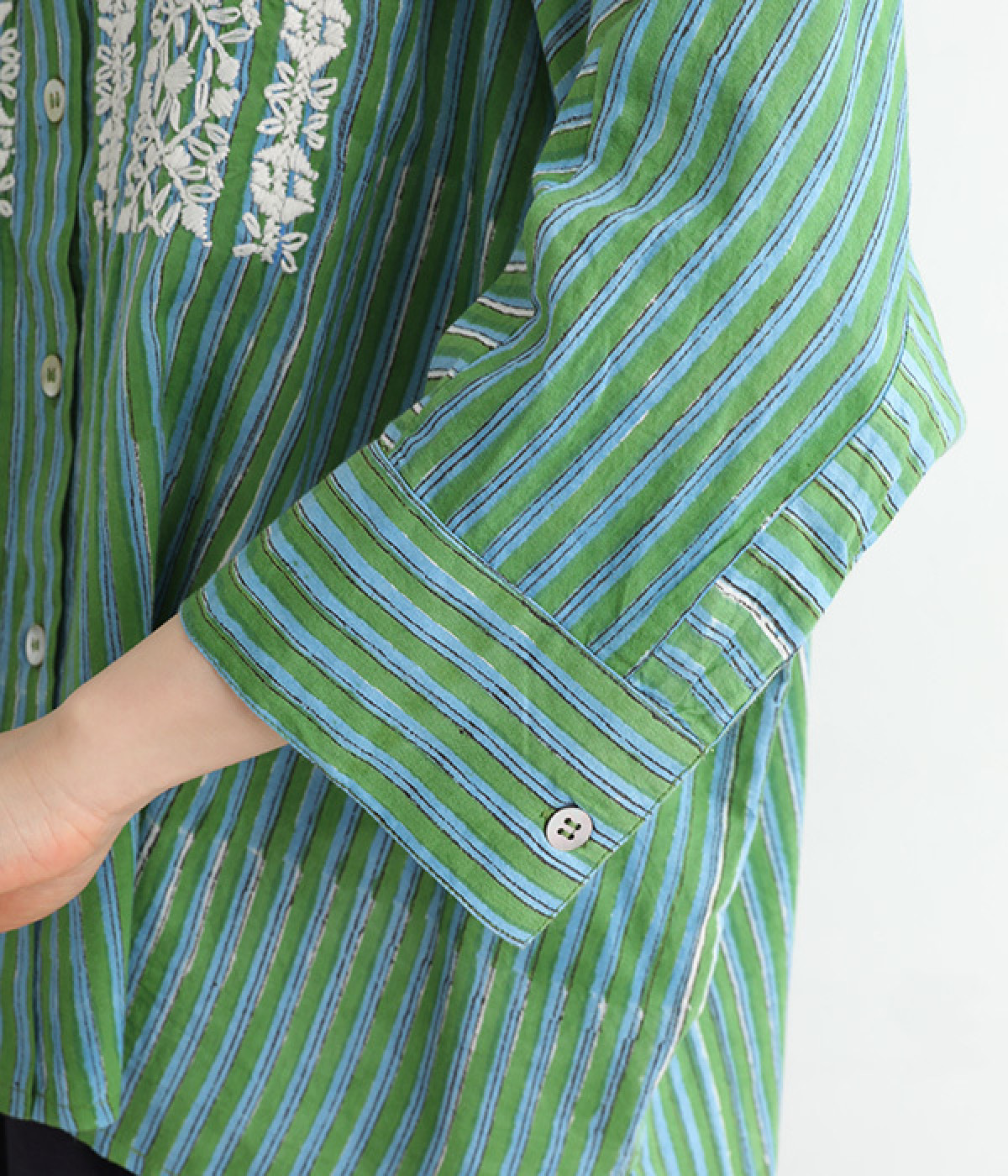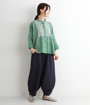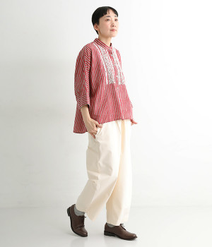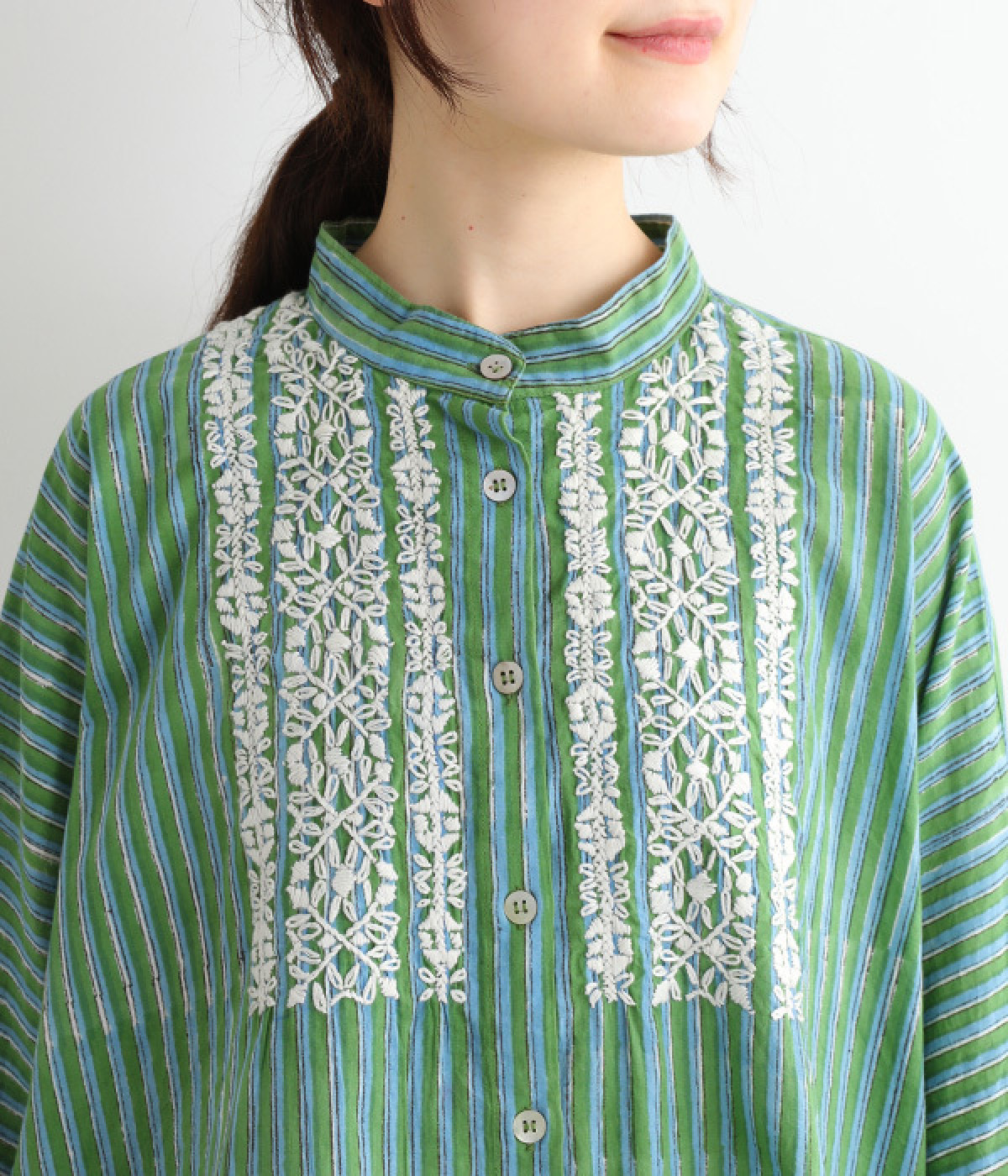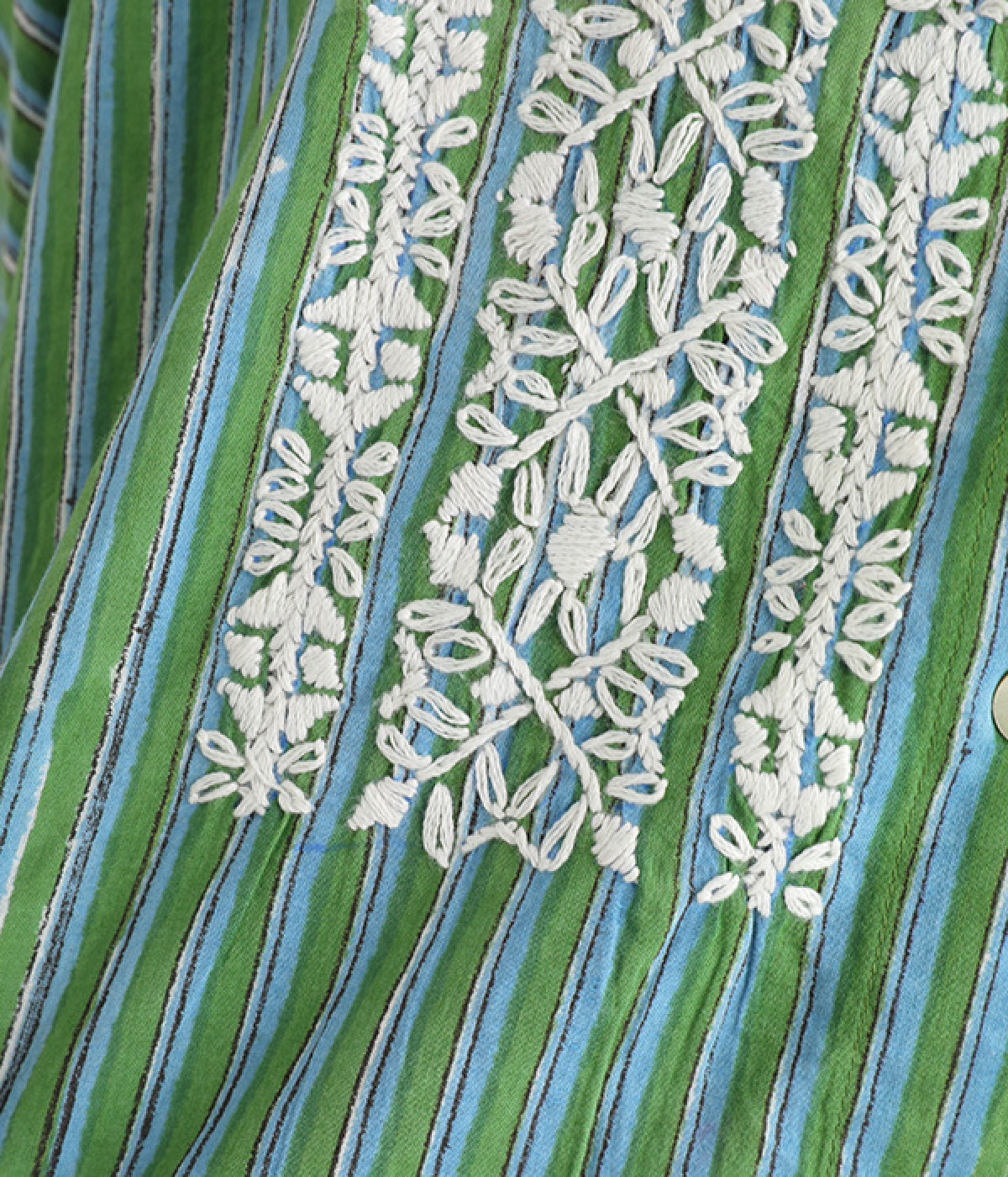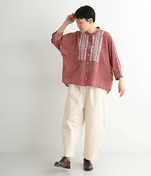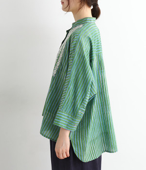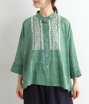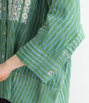 軽くやわらかなコットンの薄手生地にあしらった、インド伝統のラクノウ刺しゅうがポイント。ストライプのブロックプリントと緻密で立体感のある刺しゅうが目をひきます。