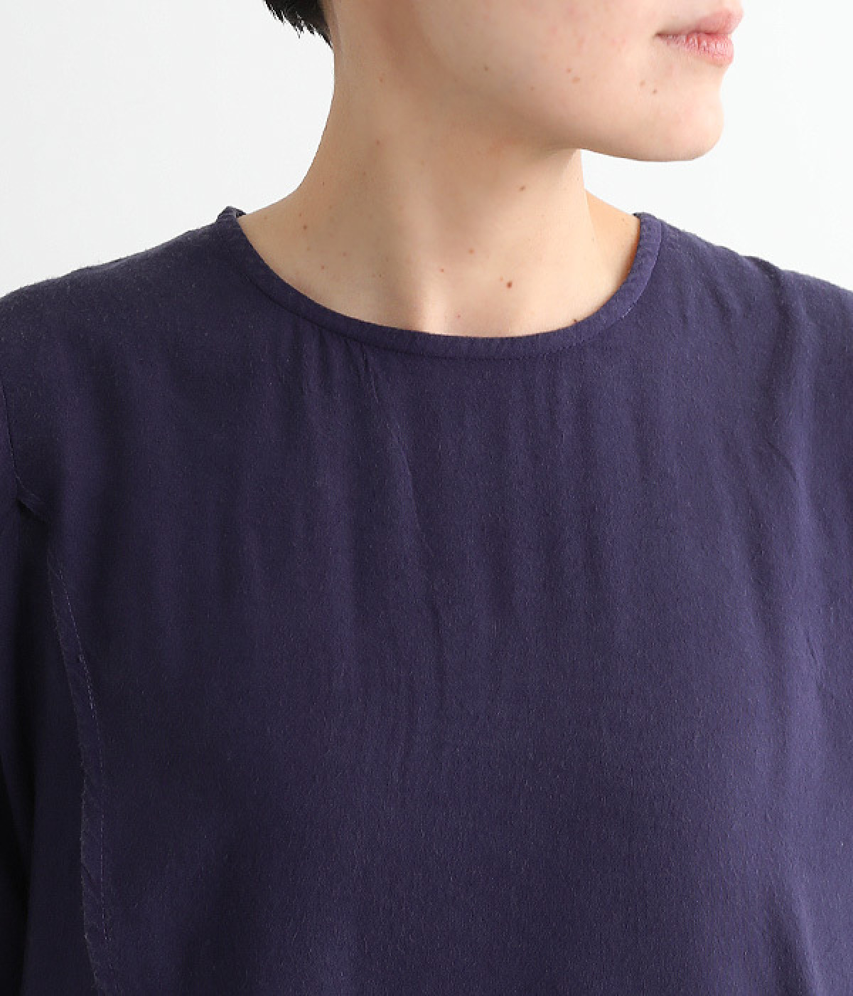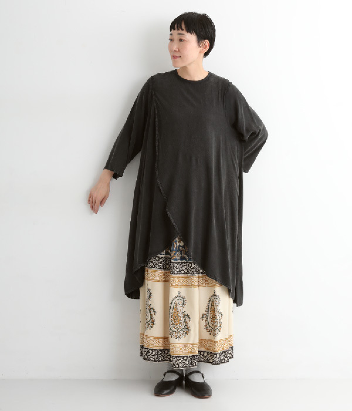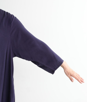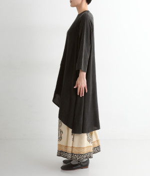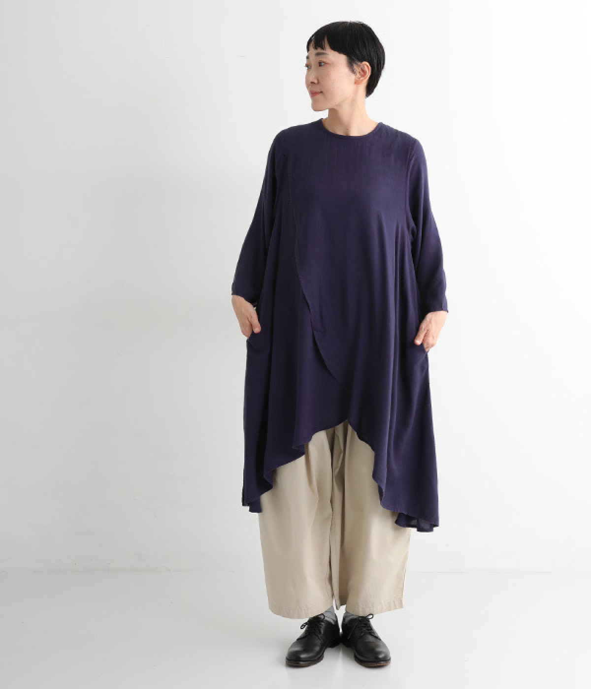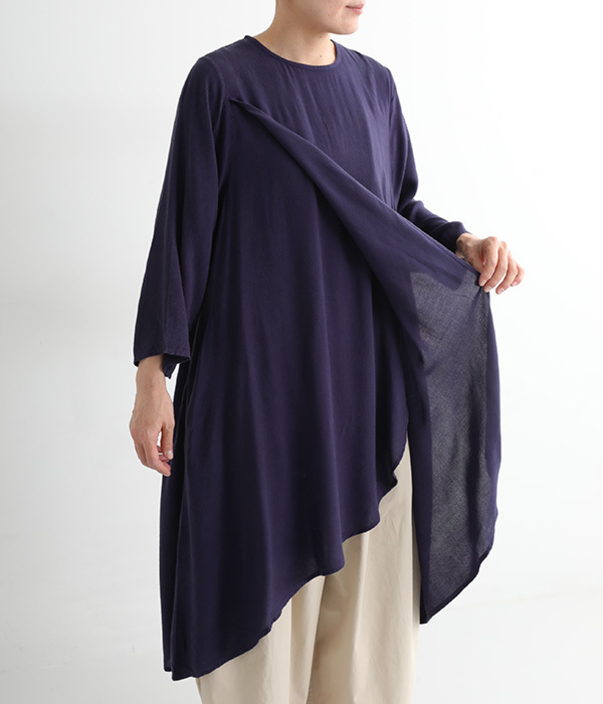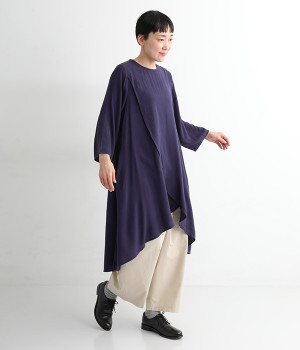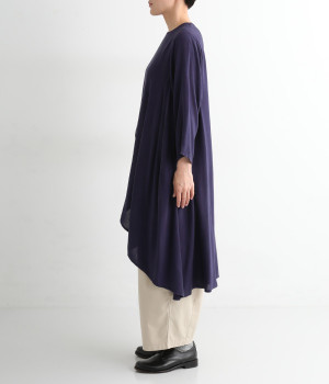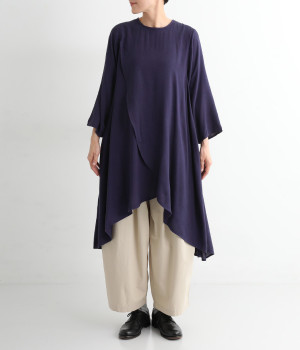 前身頃が重なった、動きのあるシルエットが魅力。シンプルながらもニュアンスたっぷりの装いが完成するチュニックです。柄のワンピースやスカートを裾からのぞかせたレイヤードスタイルもおすすめ。