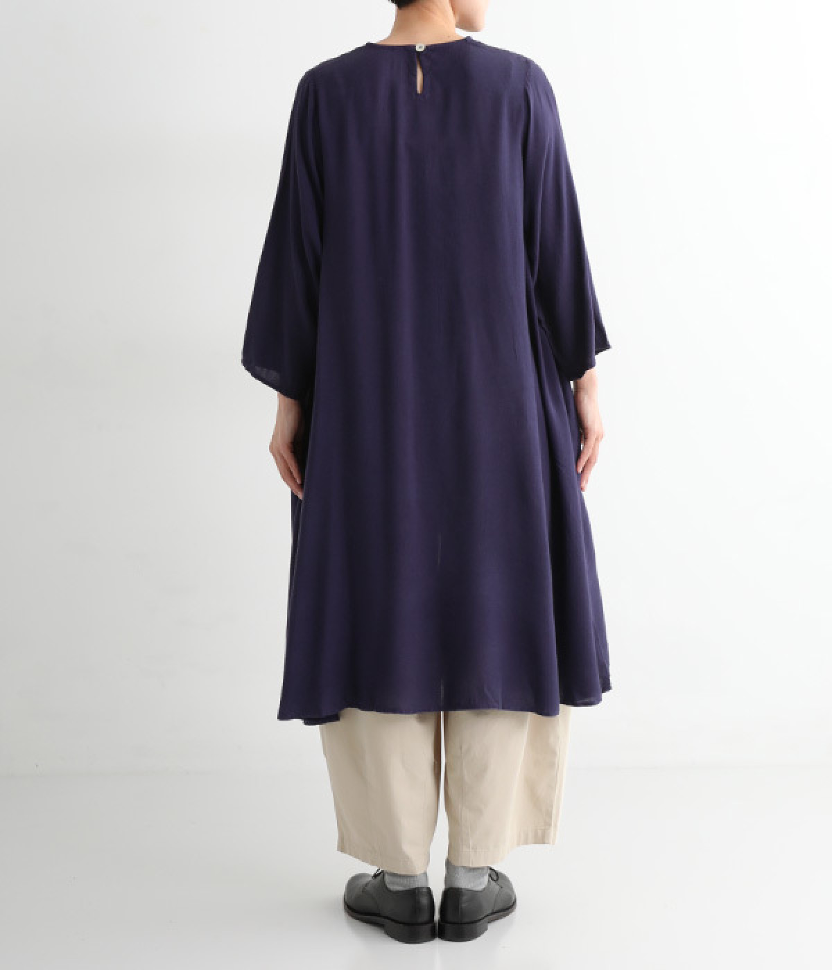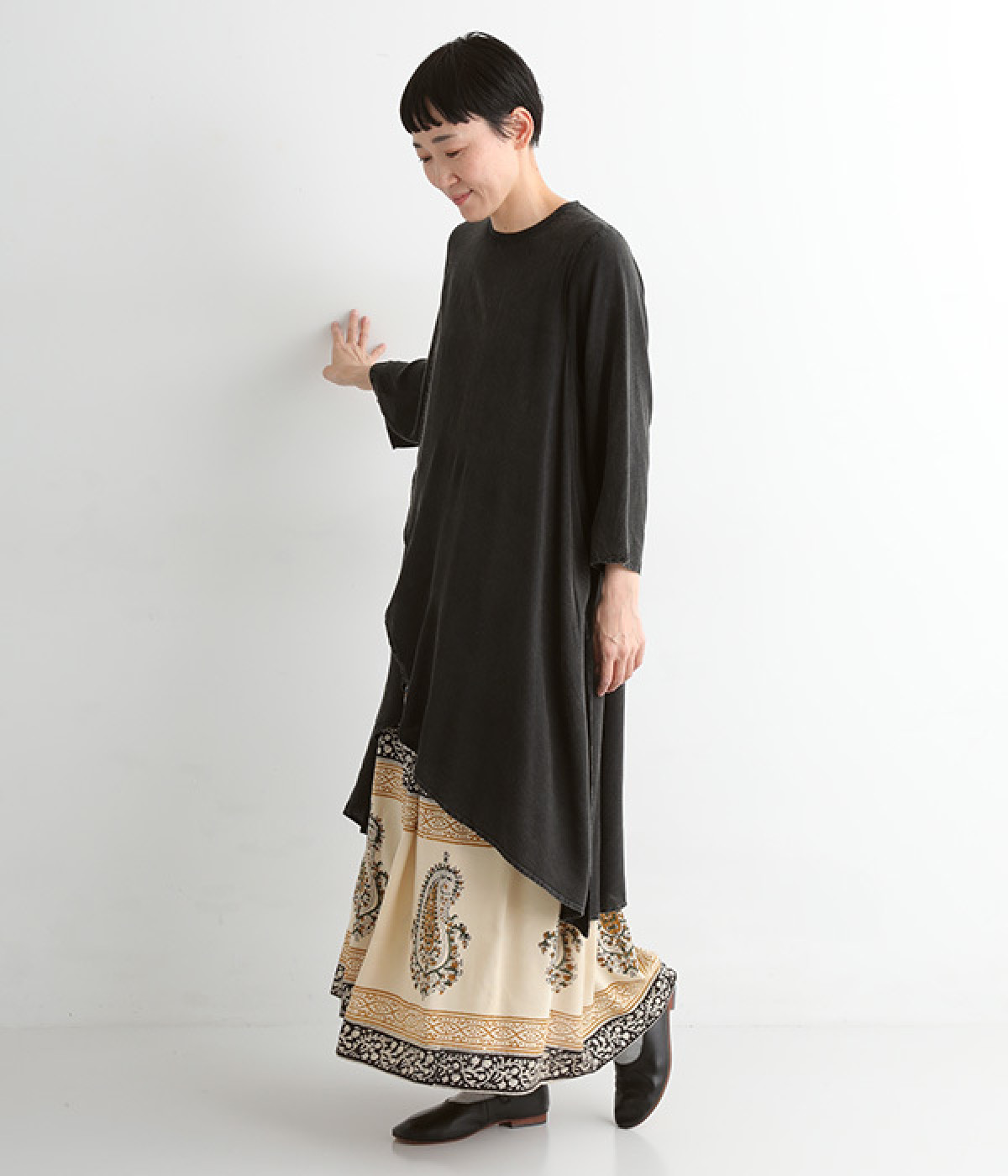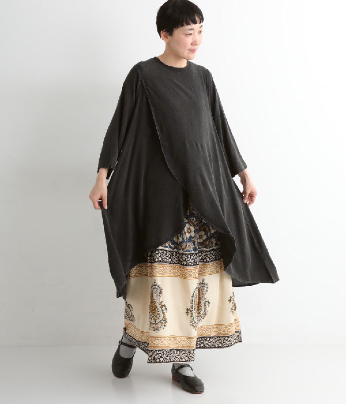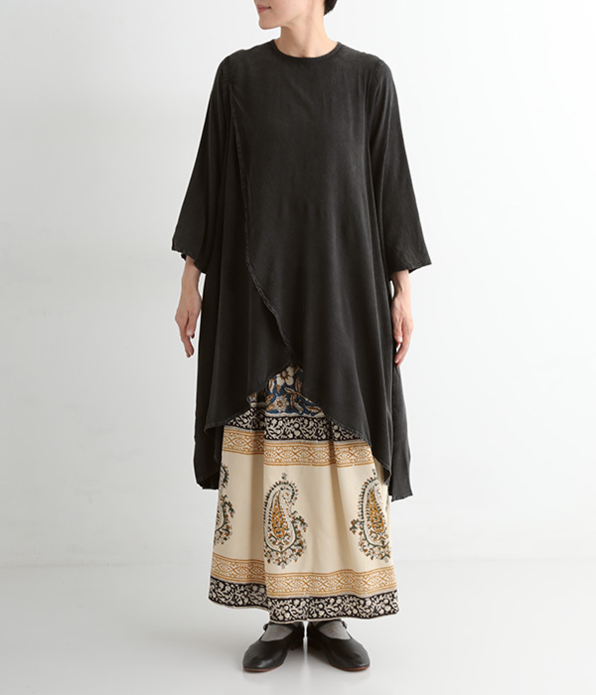 前身頃が重なった、動きのあるシルエットが魅力。シンプルながらもニュアンスたっぷりの装いが完成するチュニックです。柄のワンピースやスカートを裾からのぞかせたレイヤードスタイルもおすすめ。