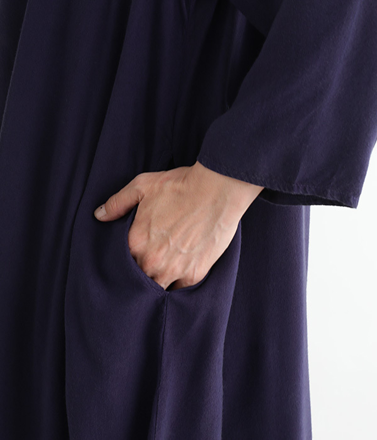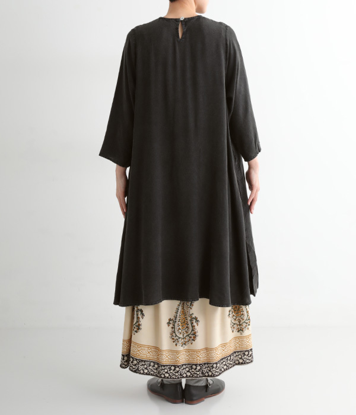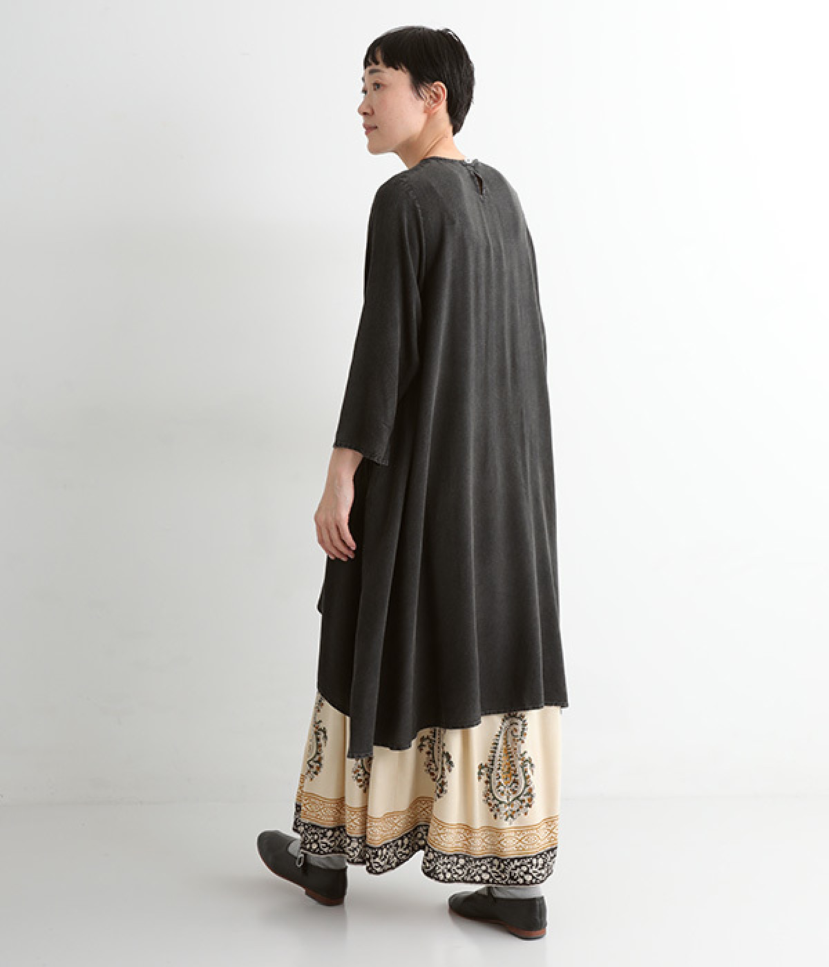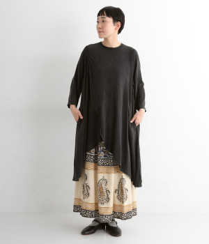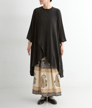 ストーンウォッシュ加工でヴィンテージのような風合いを出した生地。レーヨンならではのしなやかな落ち感があり、広がりすぎないきれいなドレープを描きます。