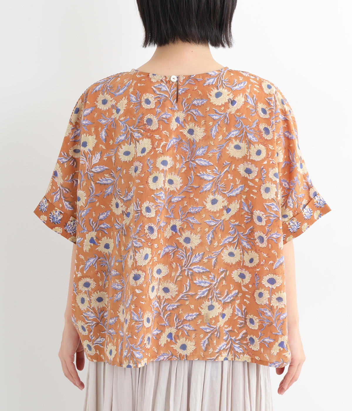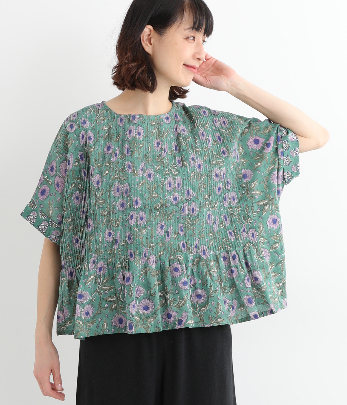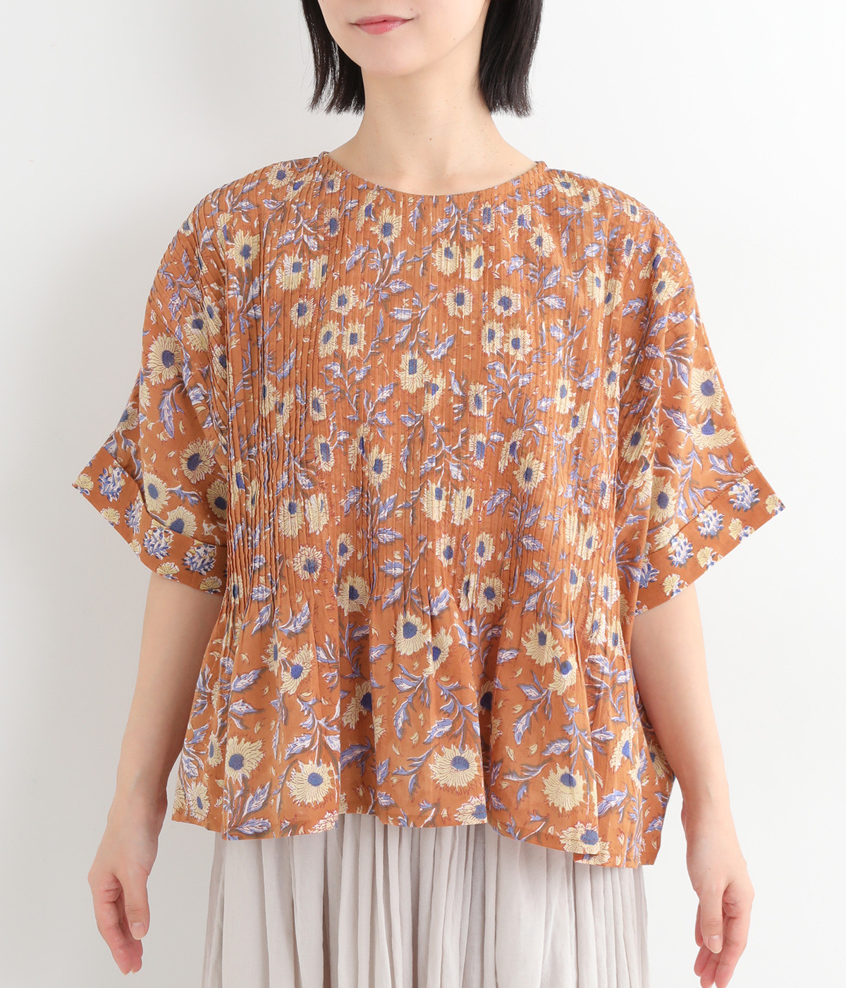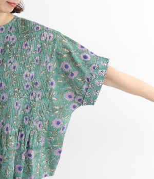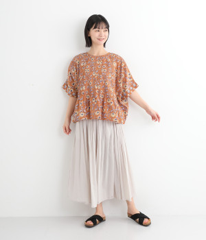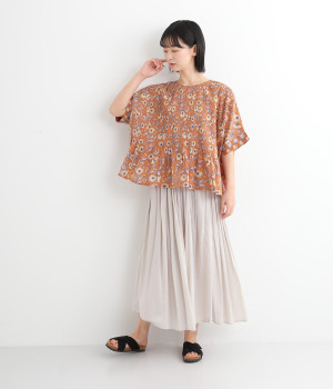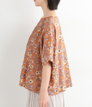 草花モチーフのブロックプリントが鮮やかに映えるブラウス。フロントのピンタックが表情に奥行きを生み出します。ゆったりとした身頃に、ふわりと広がるやわらかなシルエット。ほどよいリラックス感と品の良さを兼ね備え、毎日に寄り添う一枚に。