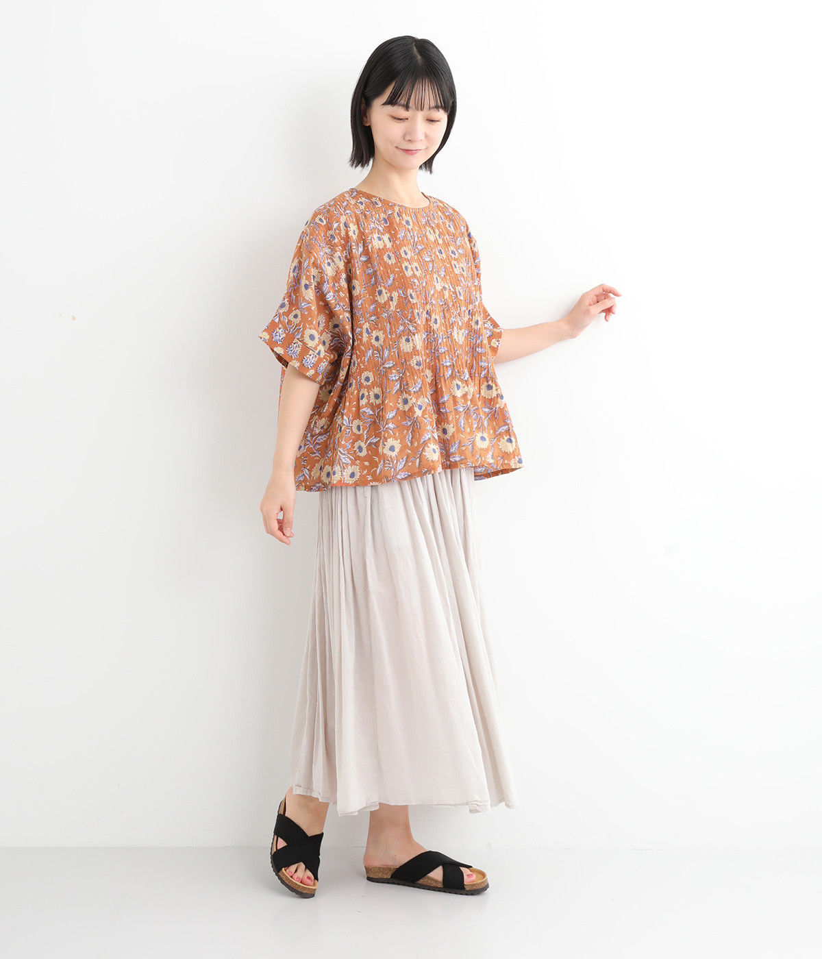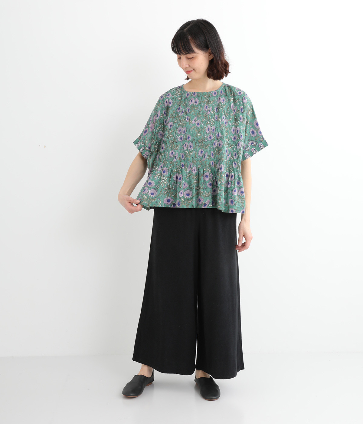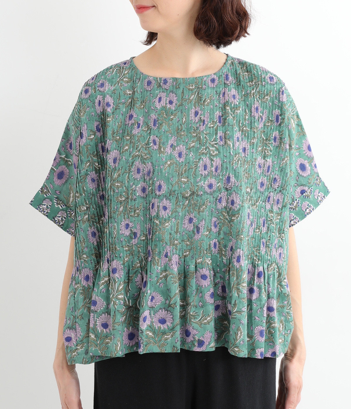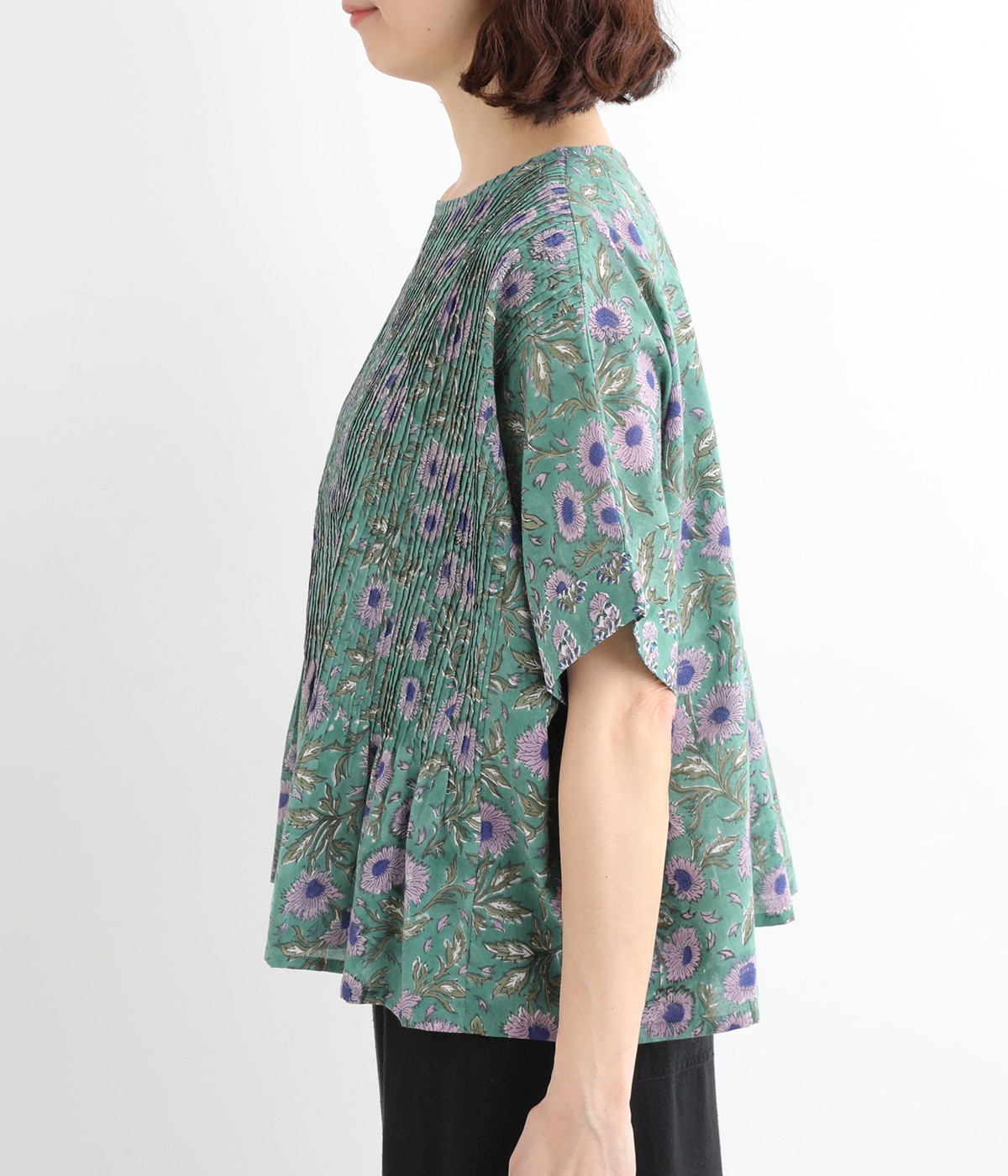 草花モチーフのブロックプリントが鮮やかに映えるブラウス。フロントのピンタックが表情に奥行きを生み出します。ゆったりとした身頃に、ふわりと広がるやわらかなシルエット。ほどよいリラックス感と品の良さを兼ね備え、毎日に寄り添う一枚に。