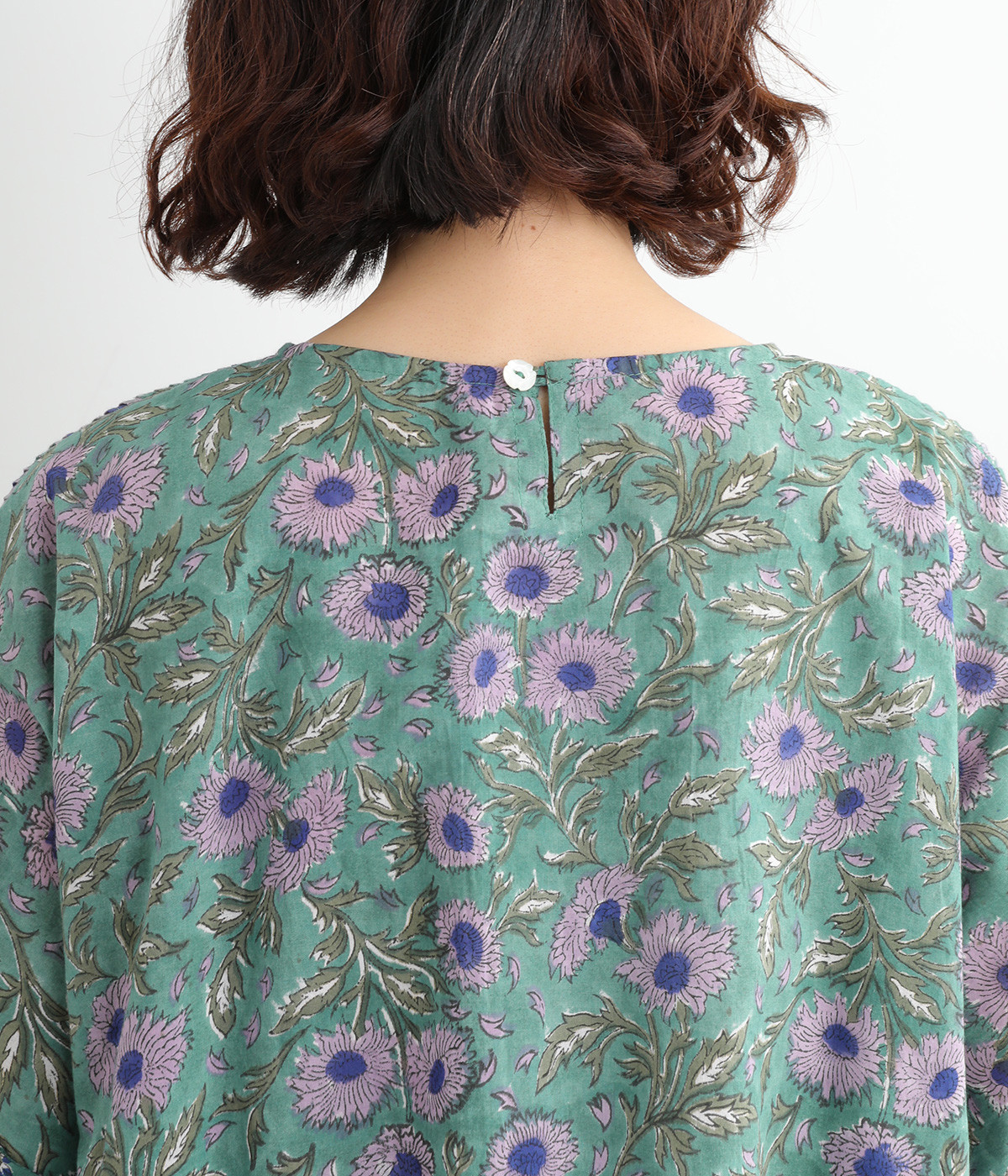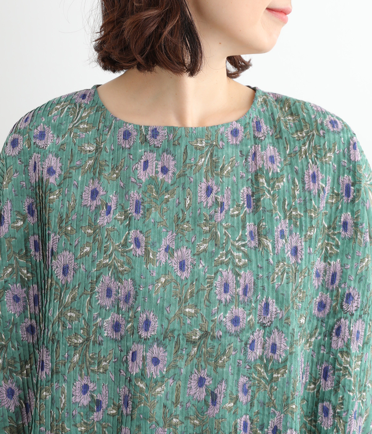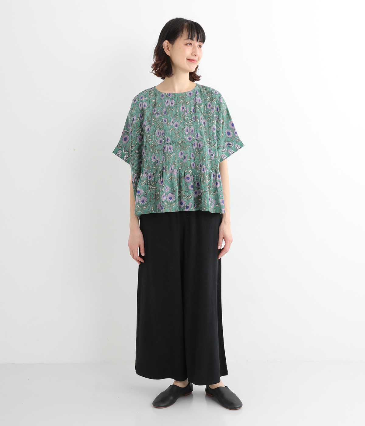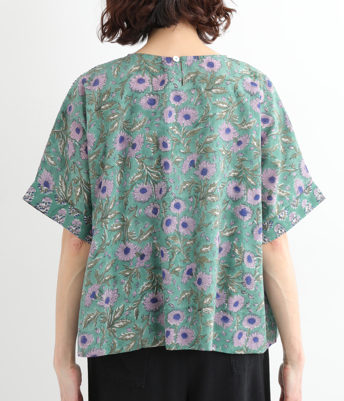 草花モチーフのブロックプリントが鮮やかに映えるブラウス。フロントのピンタックが表情に奥行きを生み出します。ゆったりとした身頃に、ふわりと広がるやわらかなシルエット。ほどよいリラックス感と品の良さを兼ね備え、毎日に寄り添う一枚に。