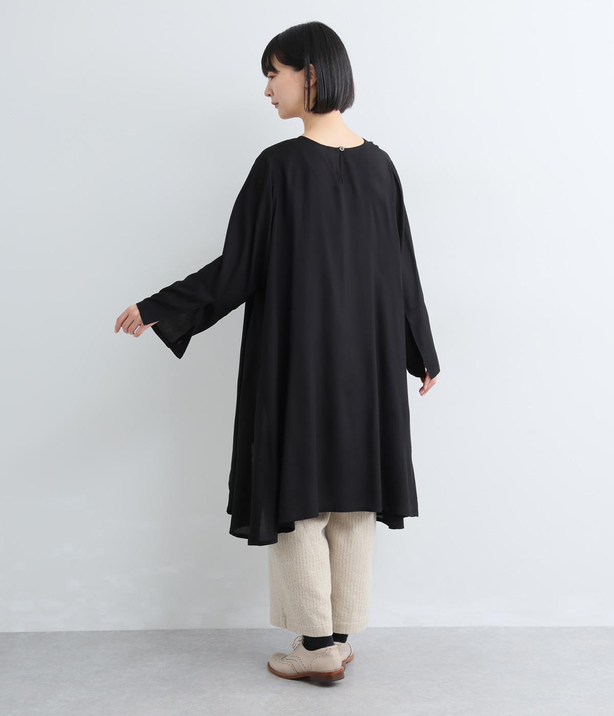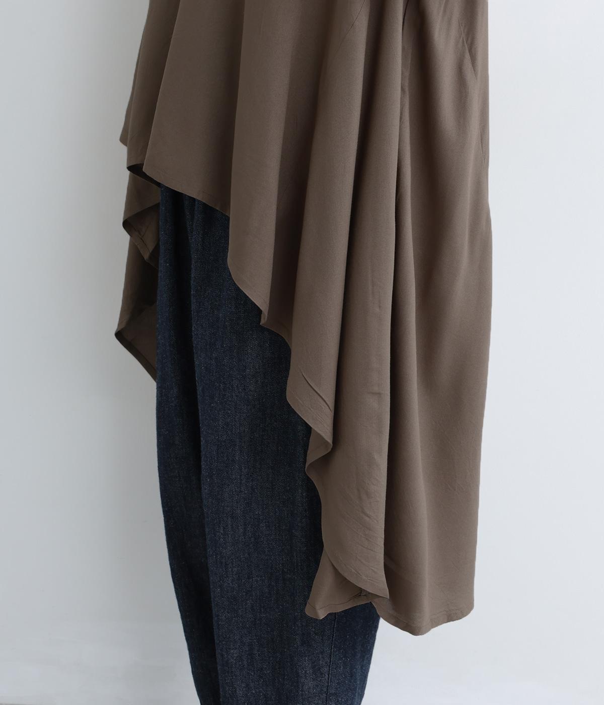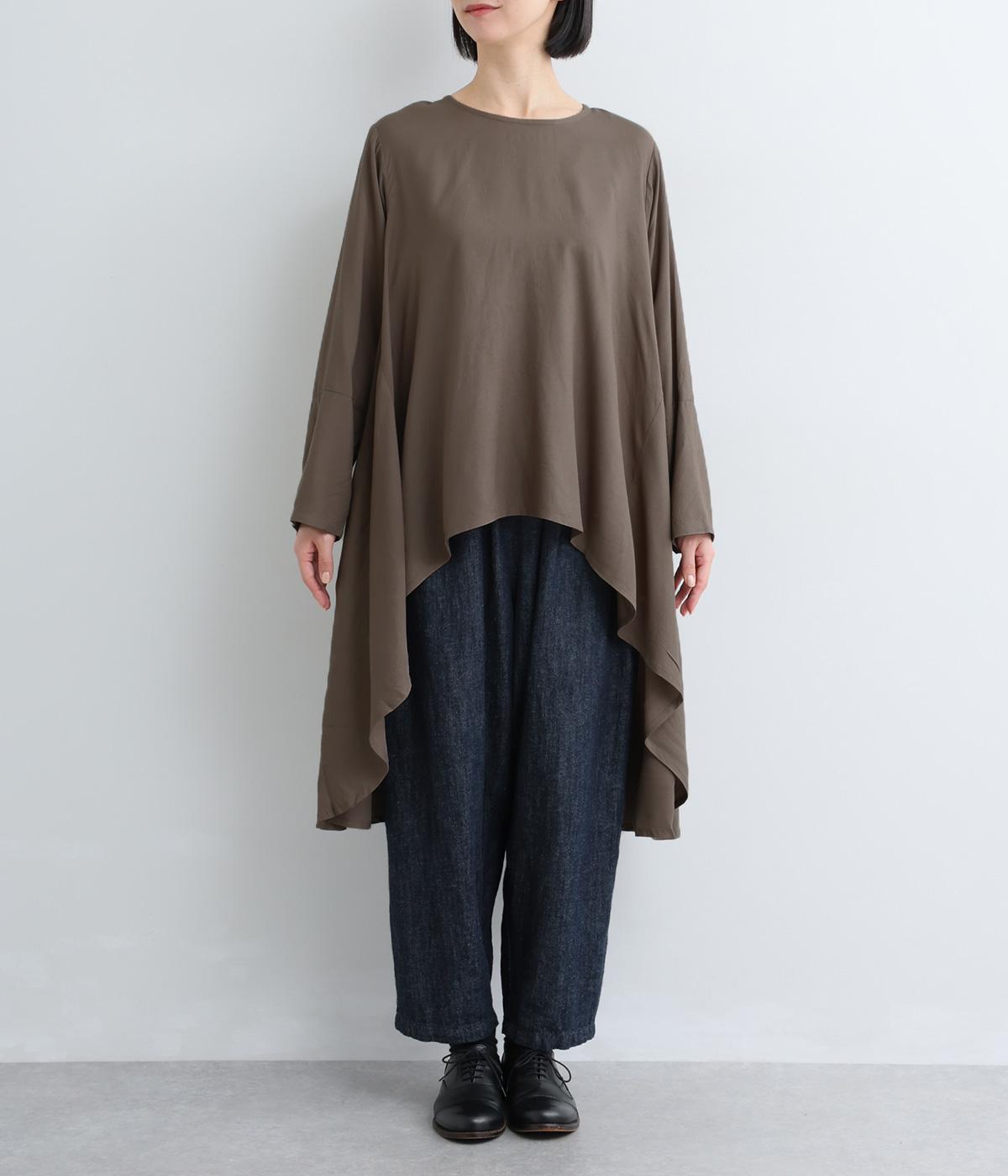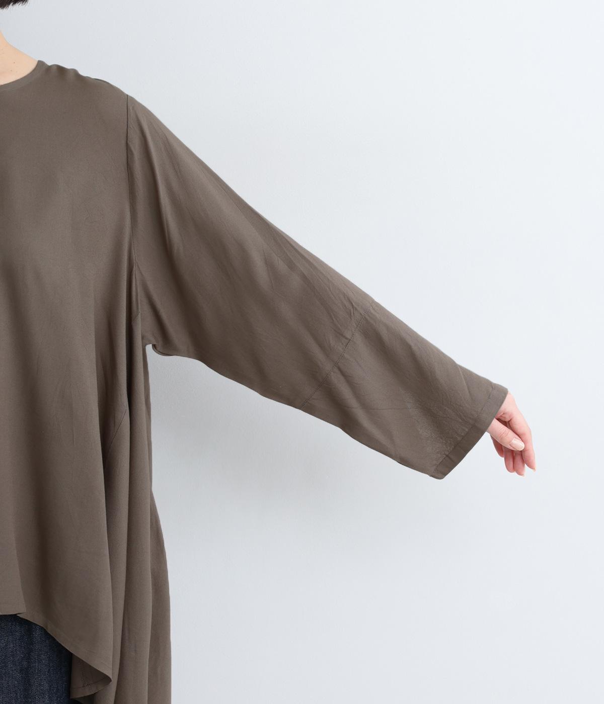 なめらかなとろみのレーヨン生地を使用しました。やわらかい肌なじみで心地よい着用感です。軽やかで、季節を通して着られる素材感です。