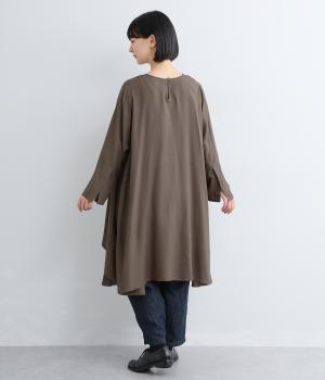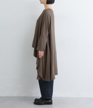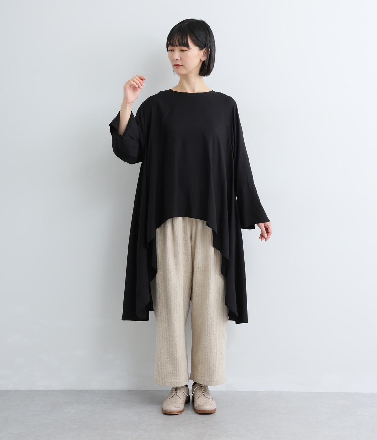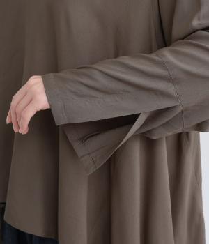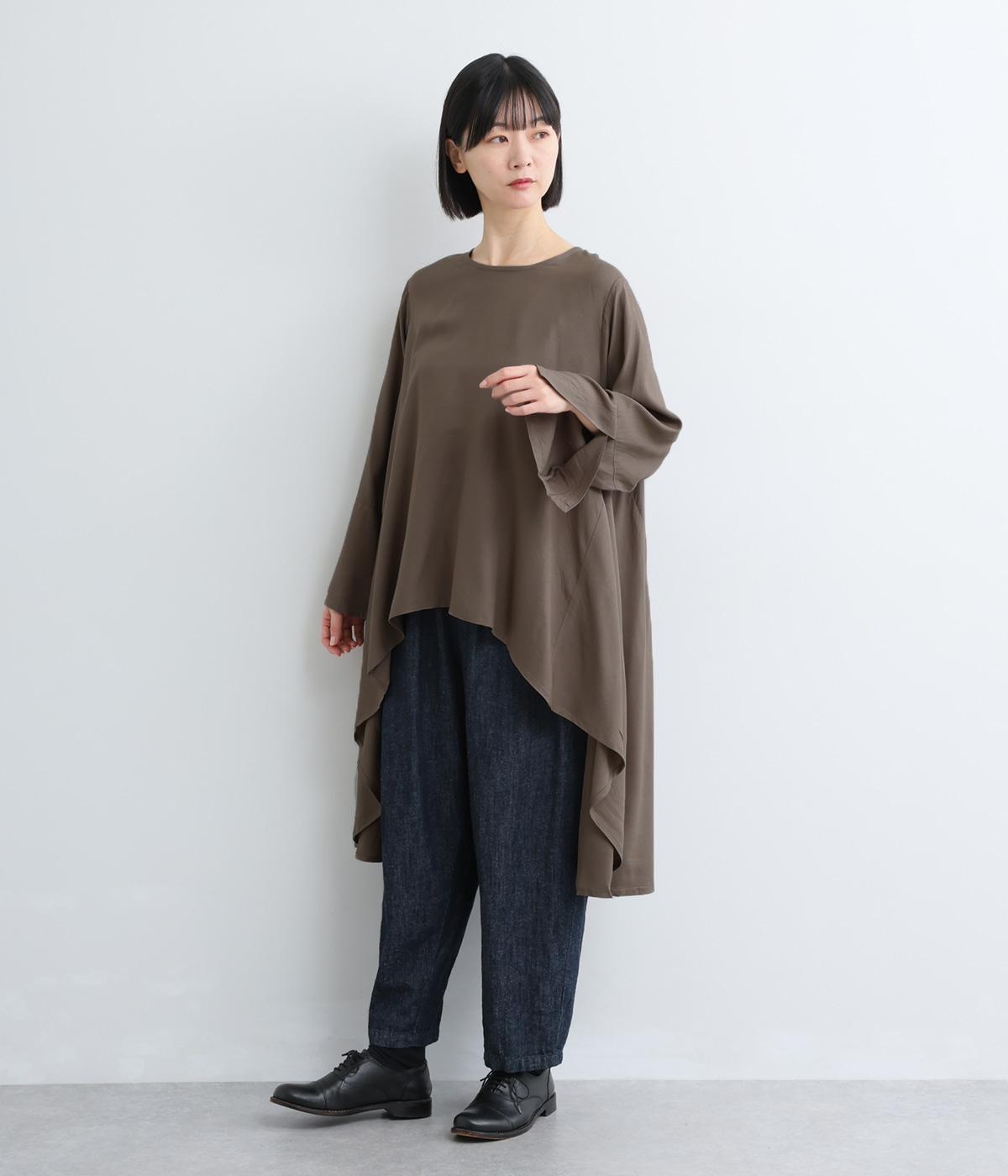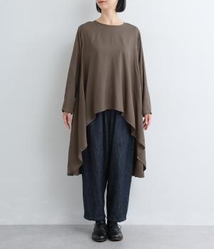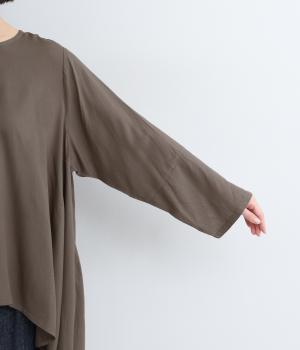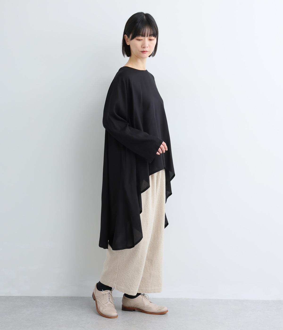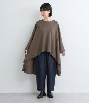 アシンメトリーな裾のラインが立体的なシルエットを描くプルオーバーです。サッと着るだけで華やかなスタイリングが完成します。こなれ感のあるワイド幅の袖はスリットを入れて抜け感をプラスしました。