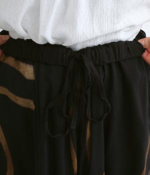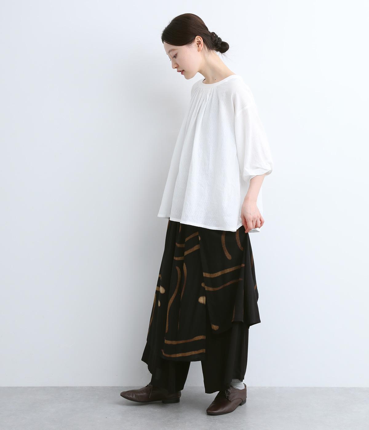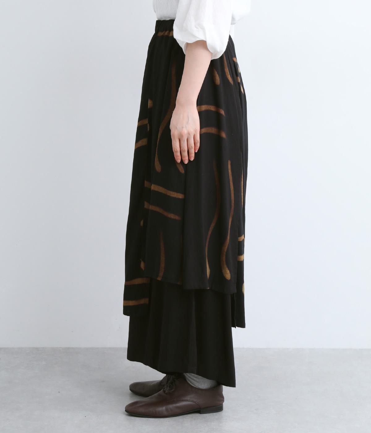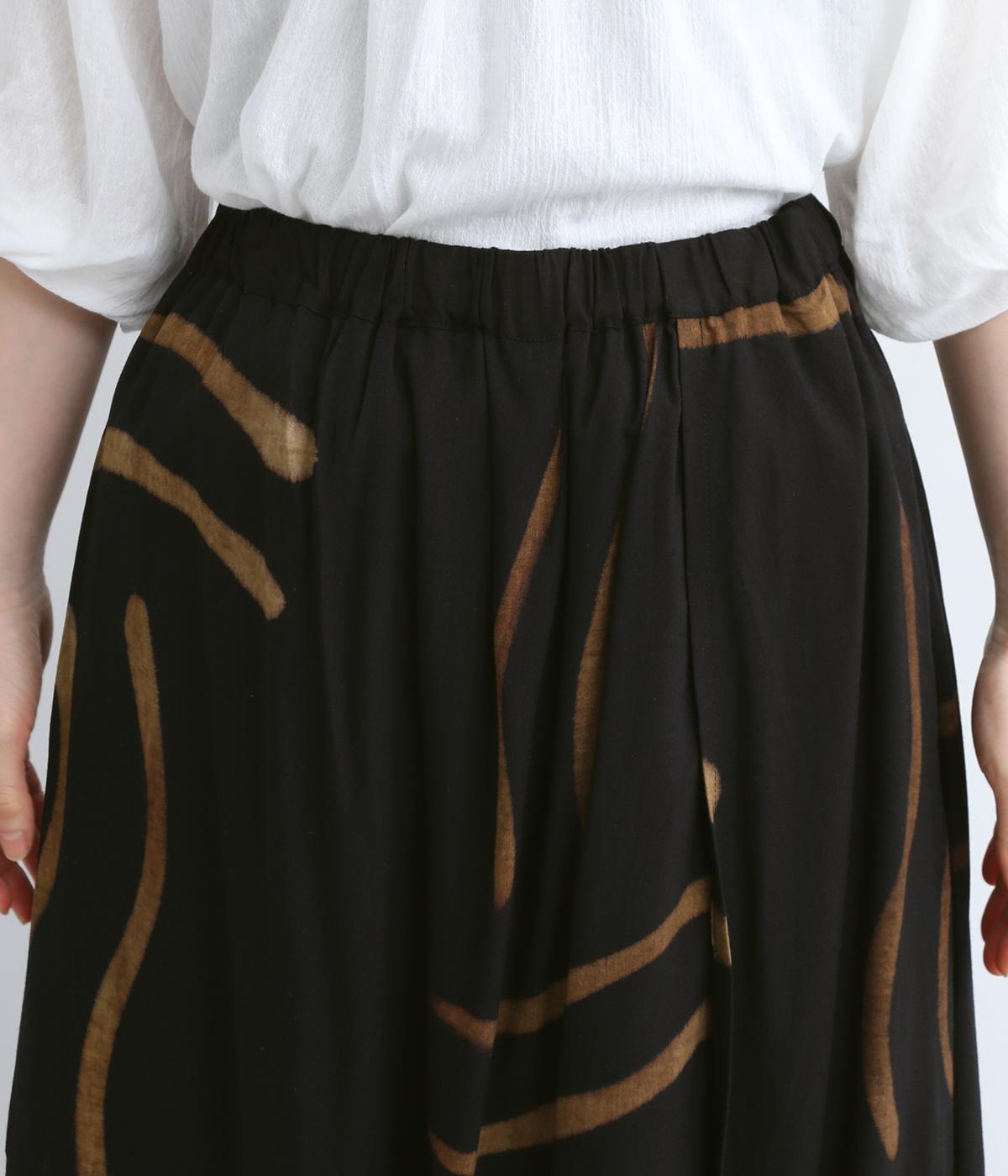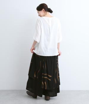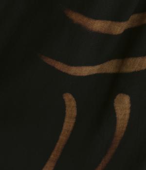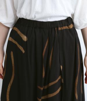 薄手でやわらかく肌あたりのいいレーヨン生地を使用しています。手描き風のラインペイントが独特のムードを演出。シックながら華やかな印象です。