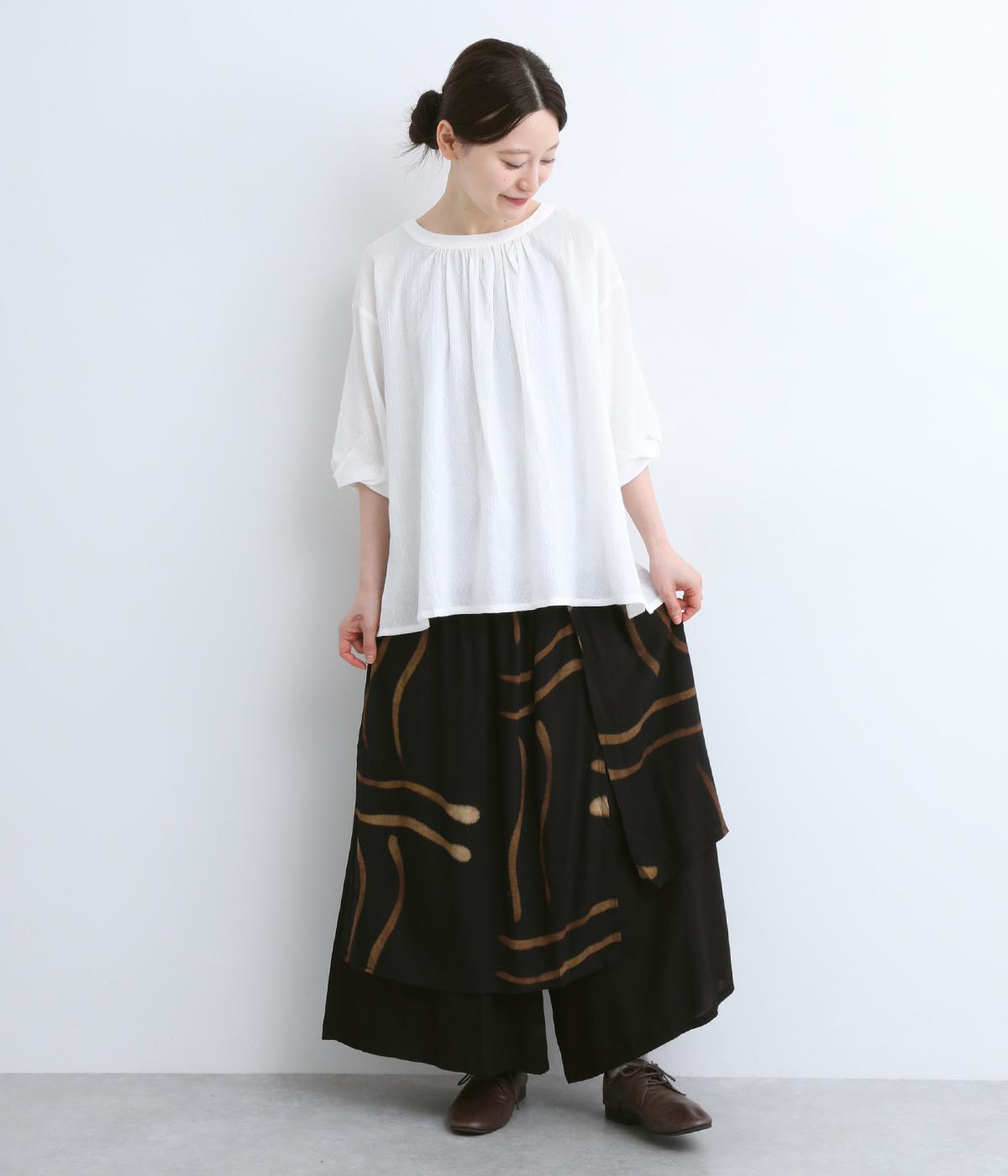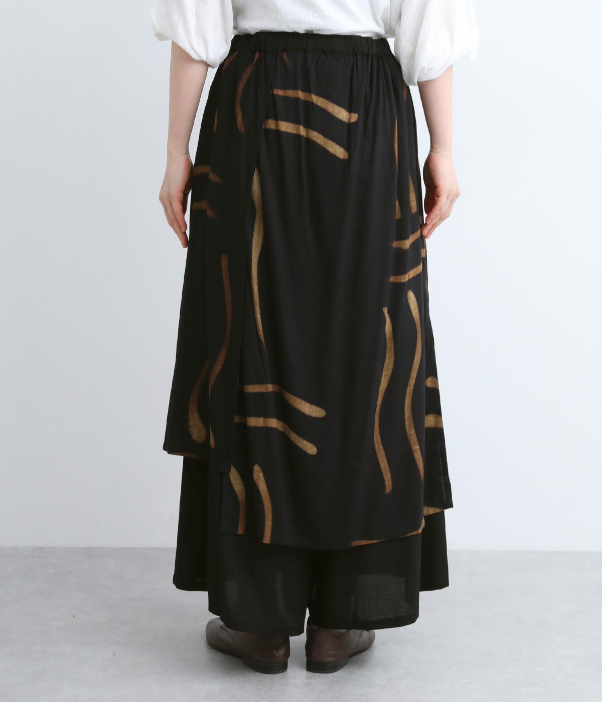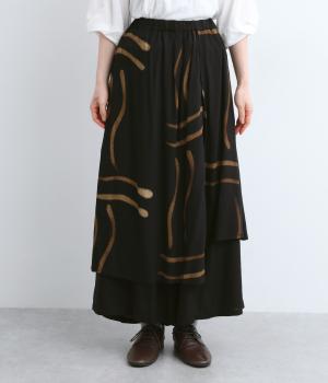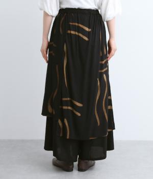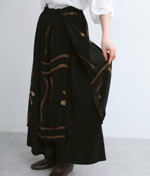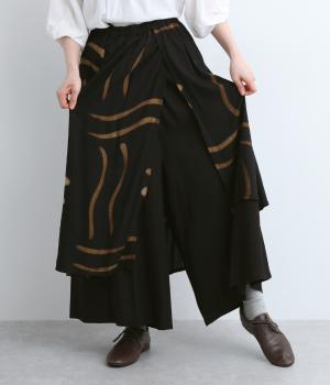 ラップスカートを重ねたようなデザインが特徴的でシンプルなトップス合わせでも個性的な装いが完成。ワイドパンツ仕様なのでアクティブなデイリーシーンにも対応してくれます。ウエストは総ゴム&内紐のイージータイプです。