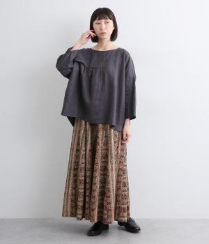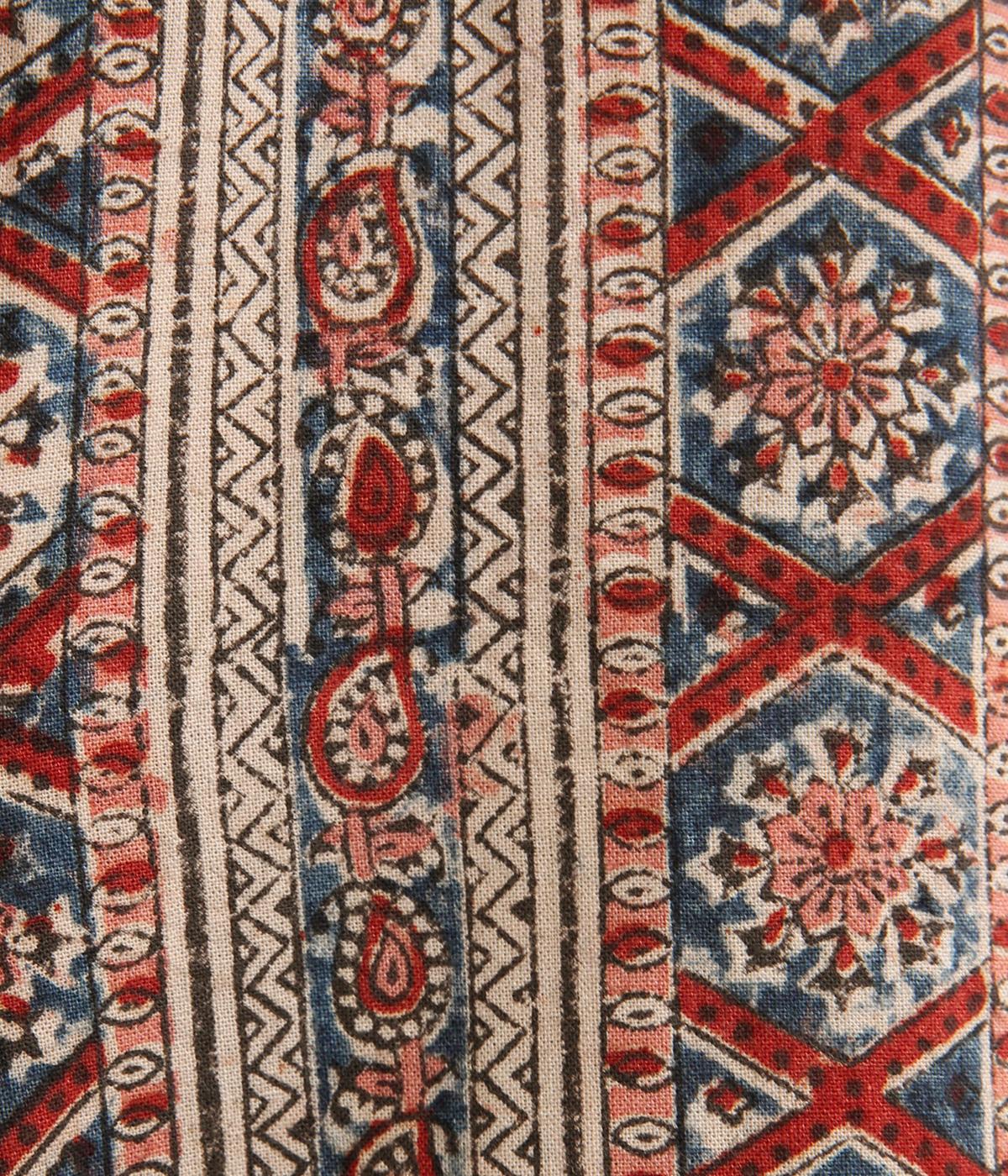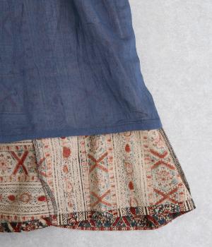 インド伝統の手紡ぎ、手織りのカディ生地で仕立てました。プリントは自然染料の落ち着いた色味が特徴で、柄の一つ一つを木版のブロックで手押しで描きだしています。