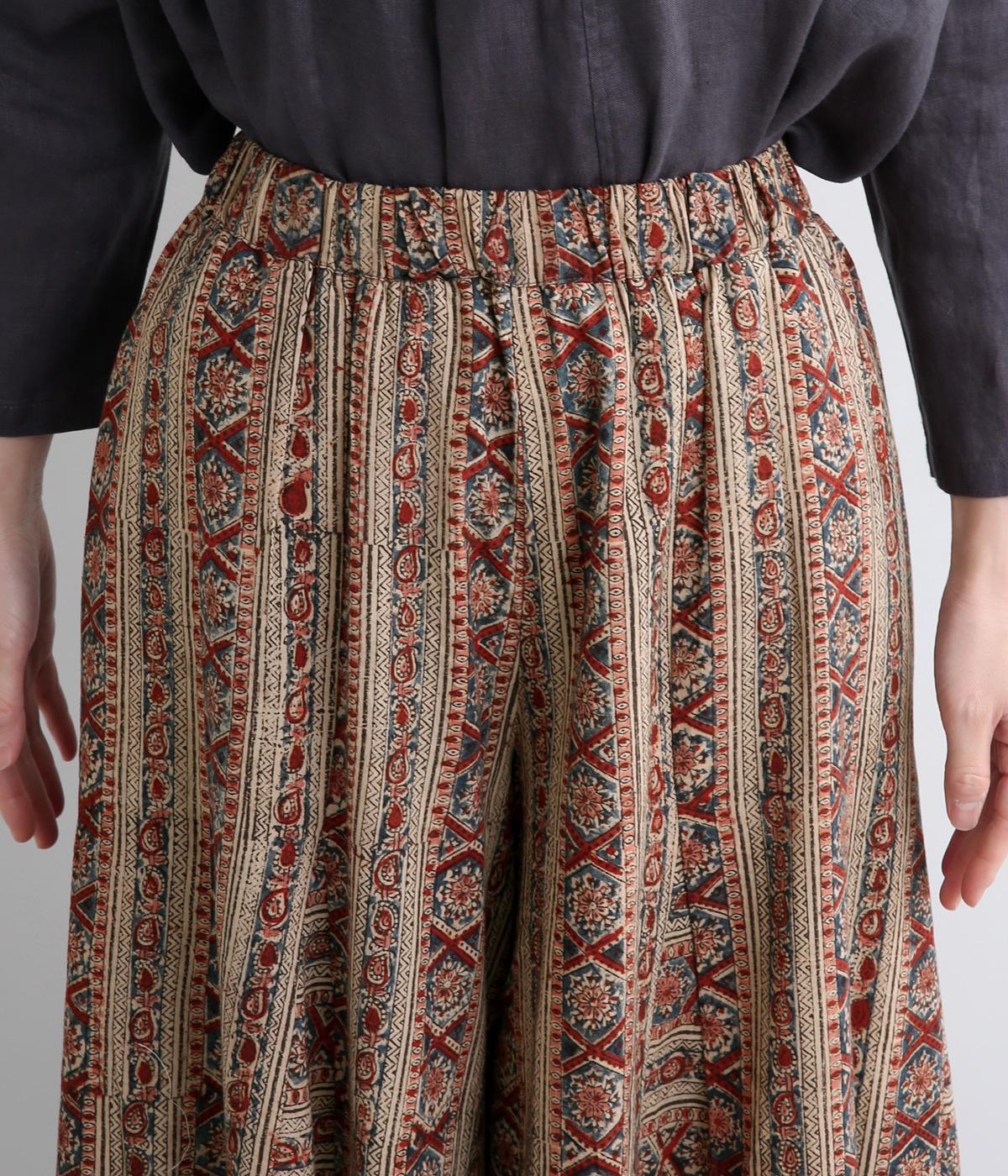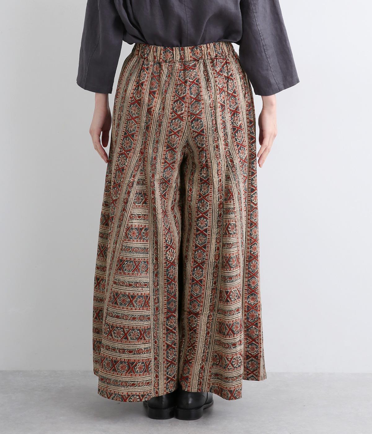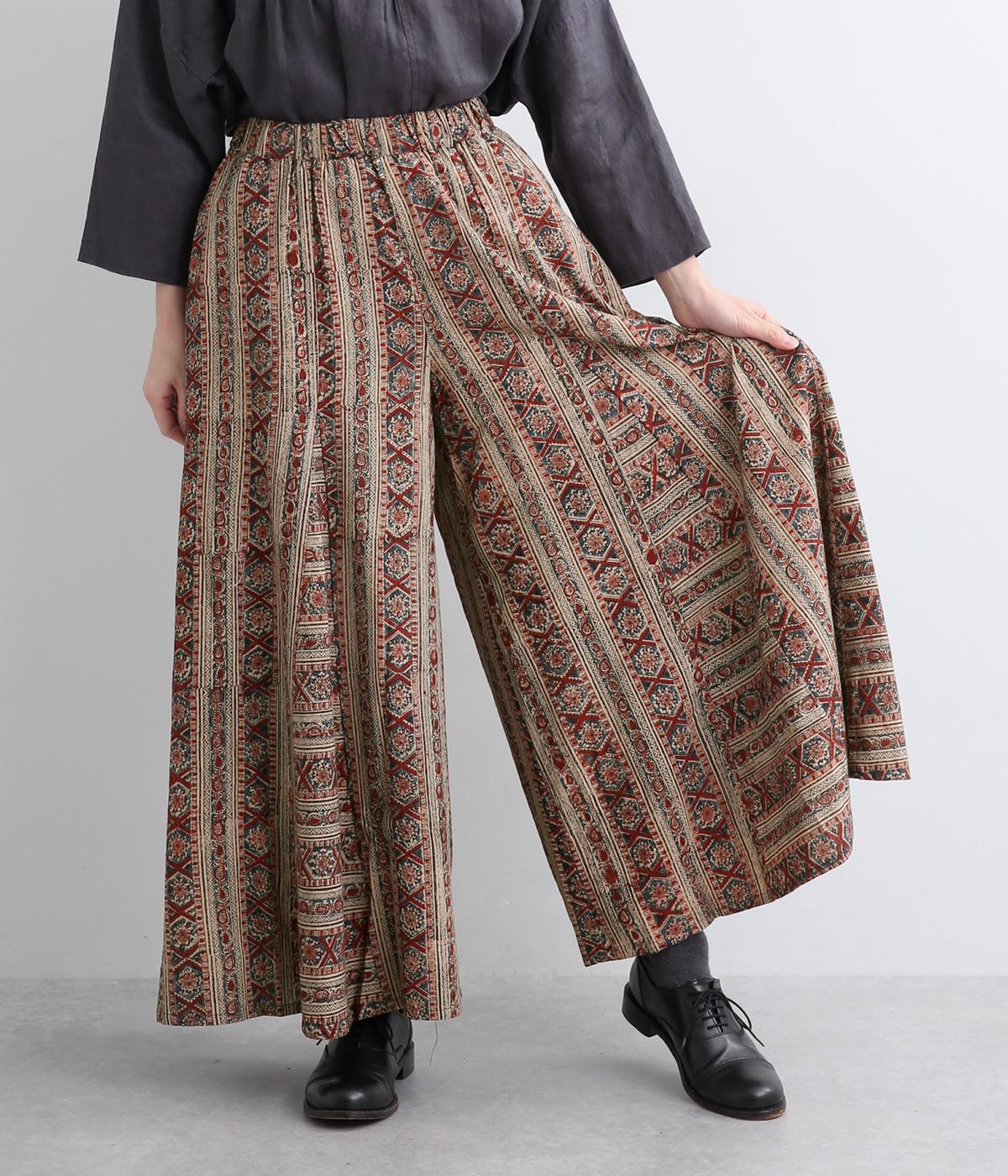 細かな柄をインドのカラムカリプリントで表現したワイドパンツです。裾幅が広くスカートのようにも見えるフレアなデザイン。ウエストは締めつけを感じにくい総ゴム仕様です。