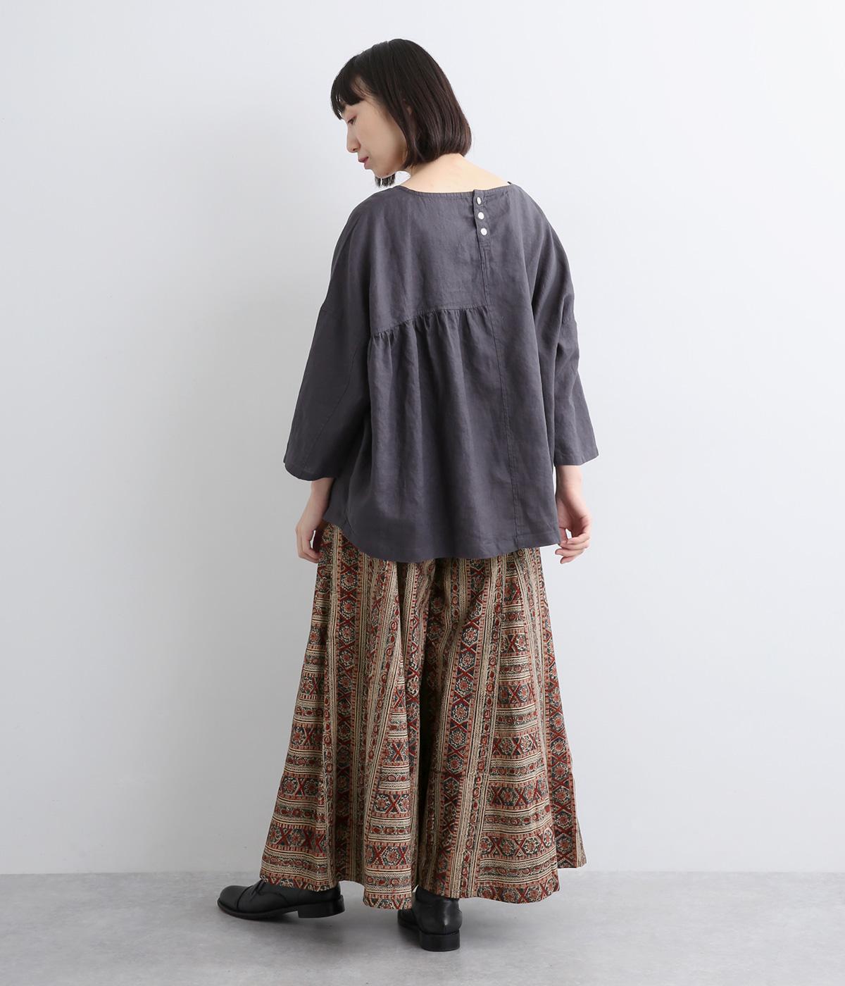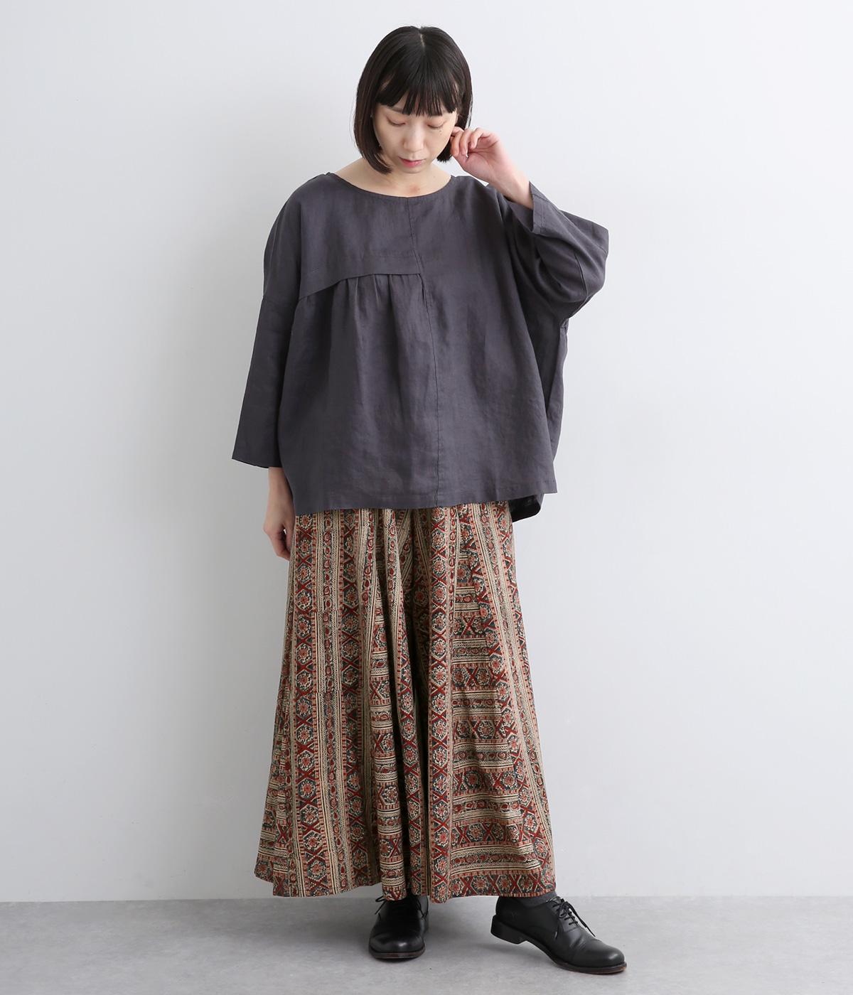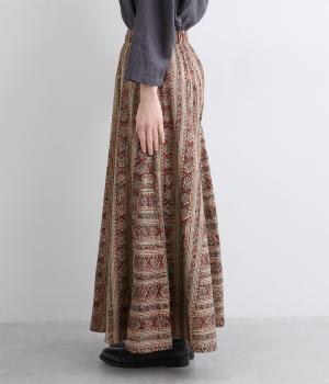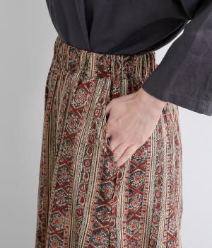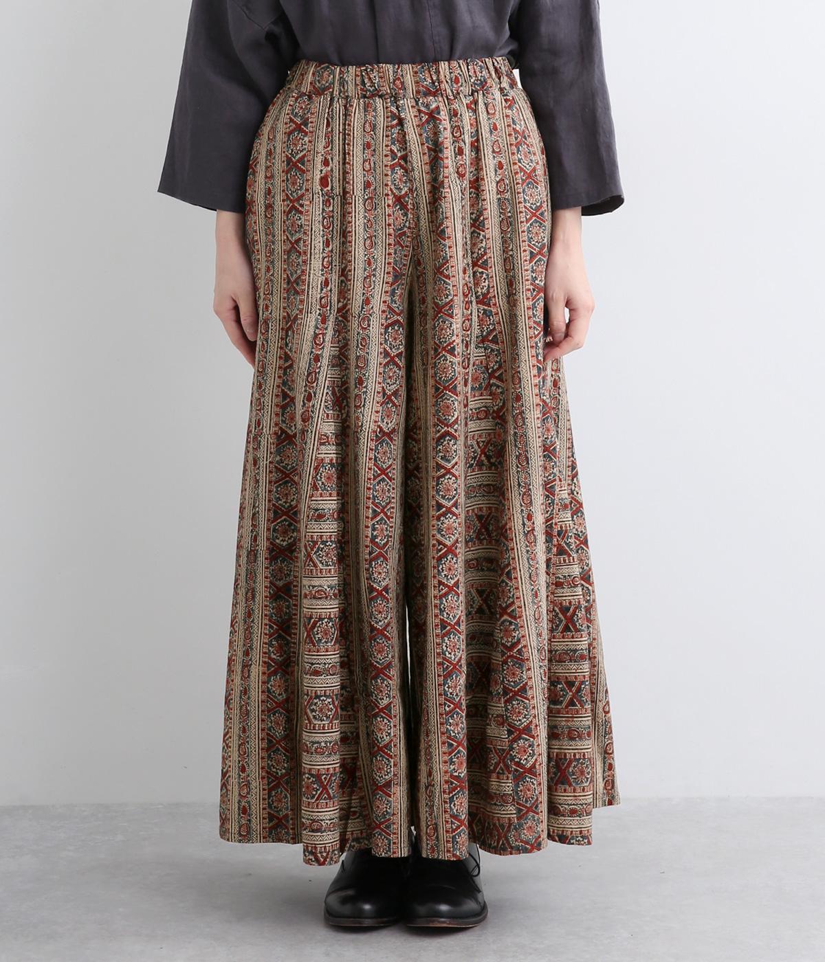 細かな柄をインドのカラムカリプリントで表現したワイドパンツです。裾幅が広くスカートのようにも見えるフレアなデザイン。ウエストは締めつけを感じにくい総ゴム仕様です。