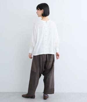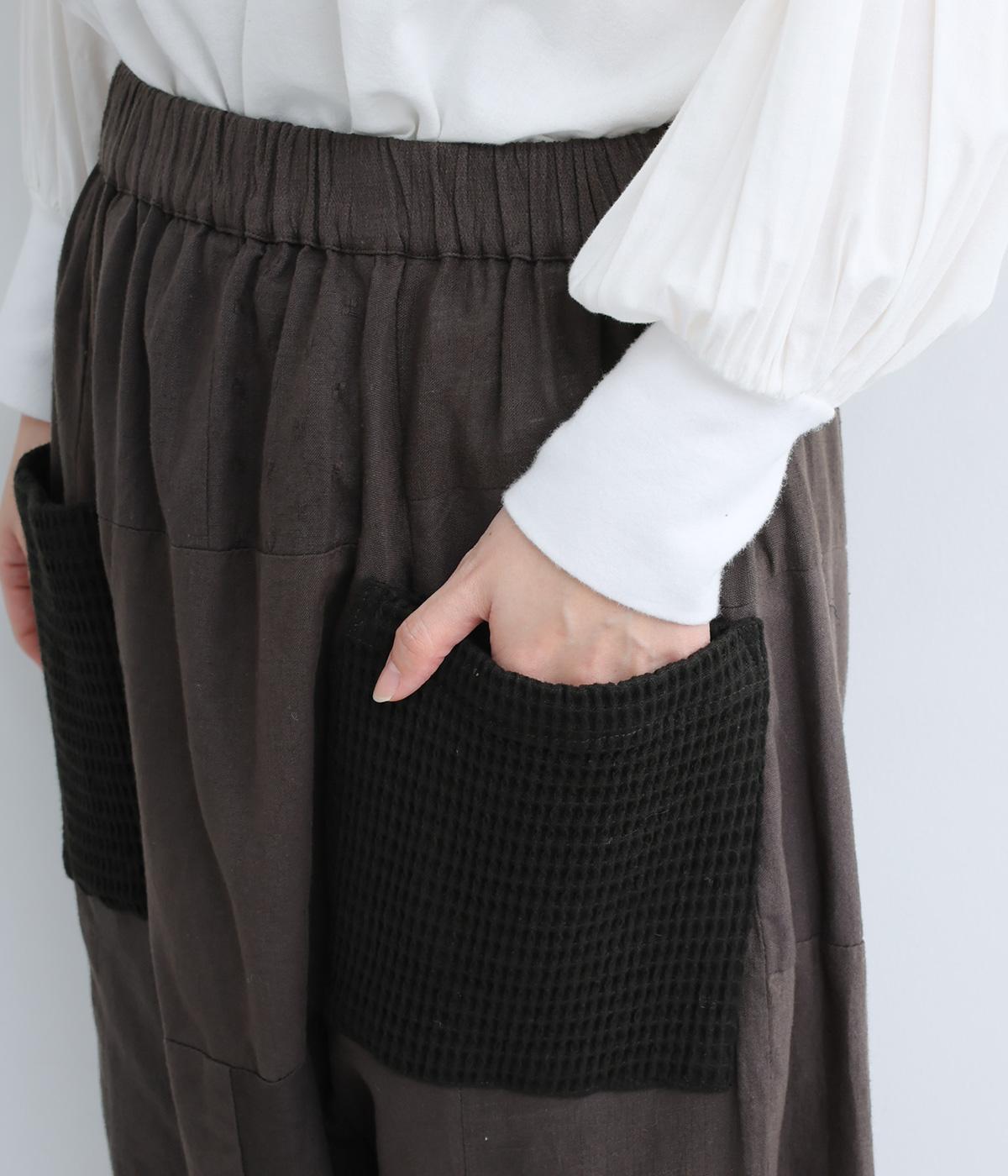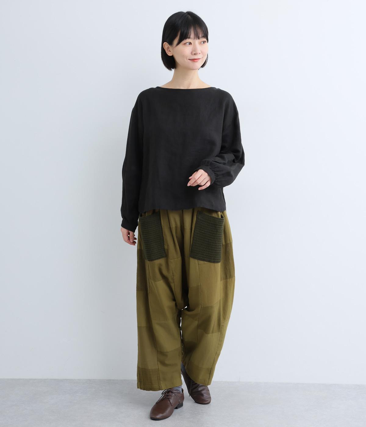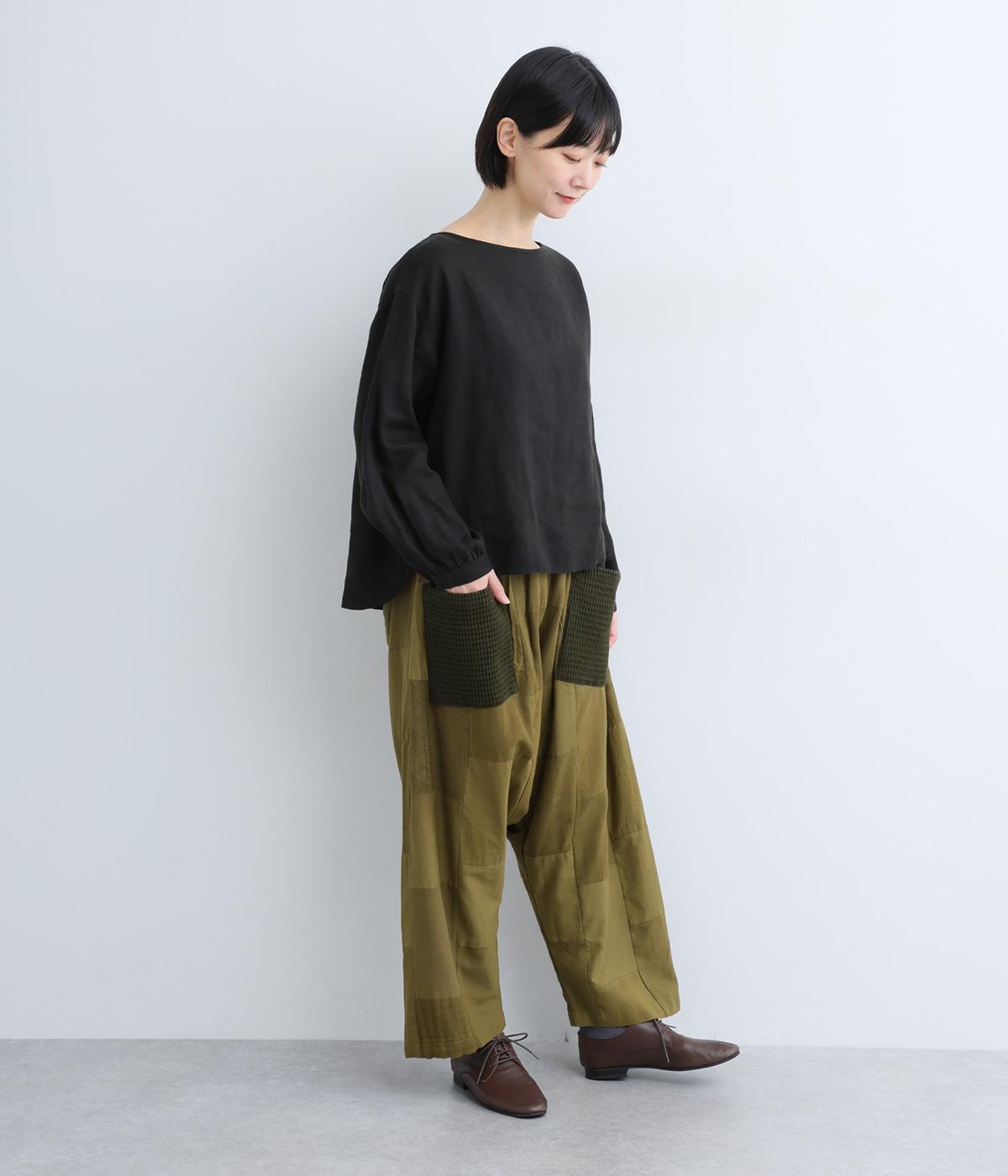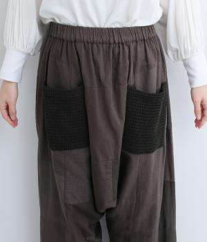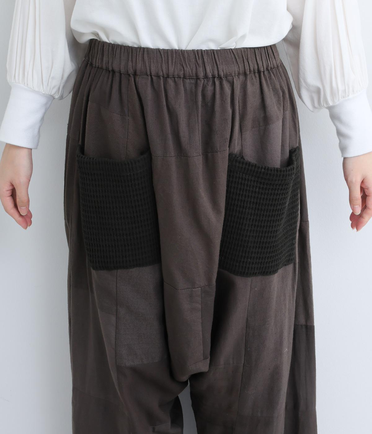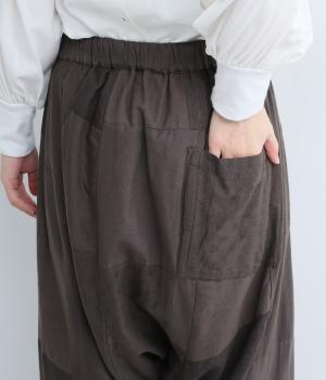 パッチワークがアクセントの、ゆったりとしたサイジングを堪能できるパンツです。腰まわりのギャザーとストレートのシルエットが美しい落ち感を表現。ウエストラインは総ゴムで安心感も◎。パッチワークの独特な立体感で、体型を選ばず着用できます。