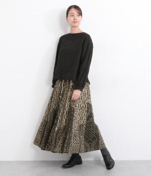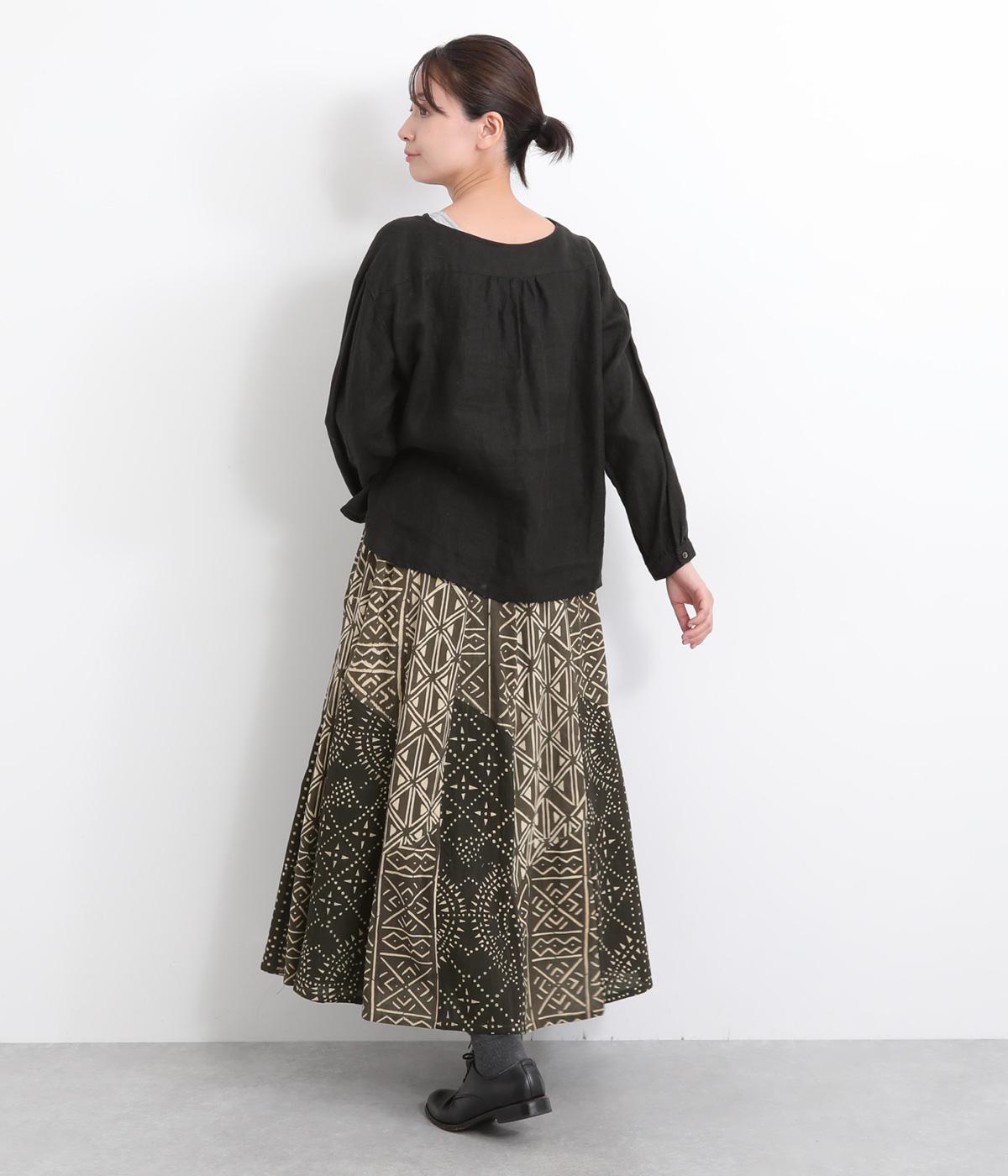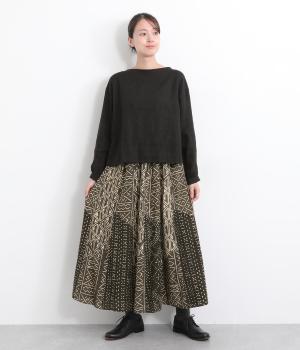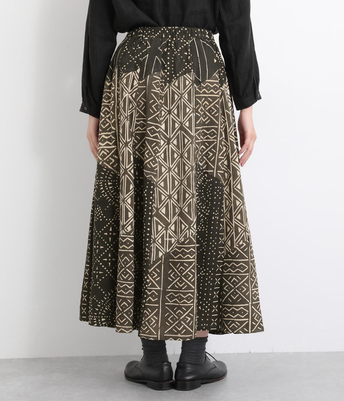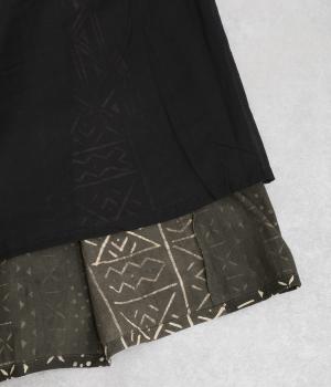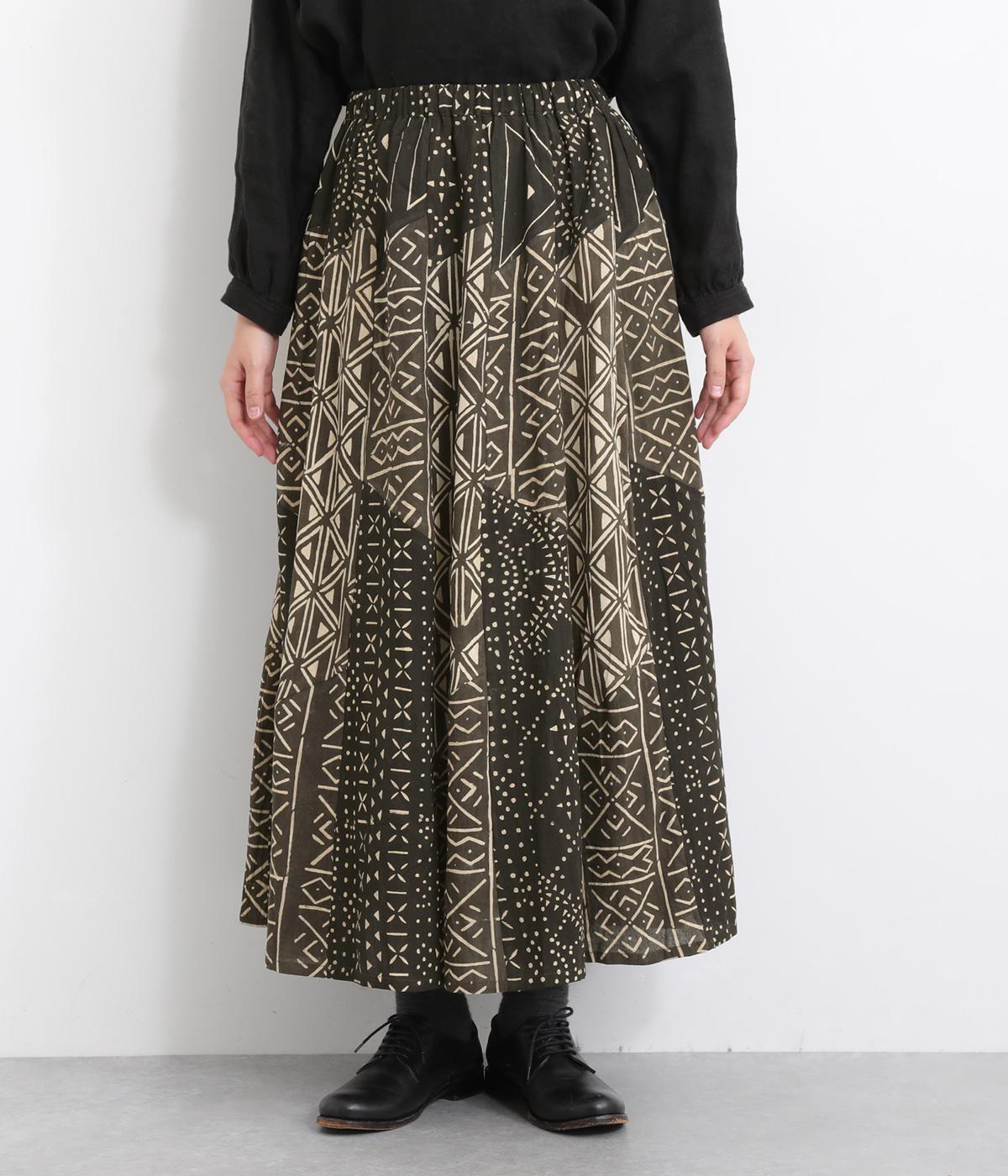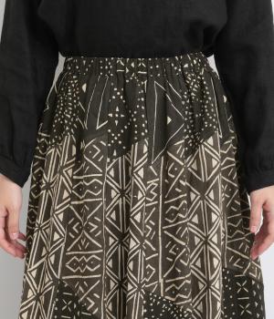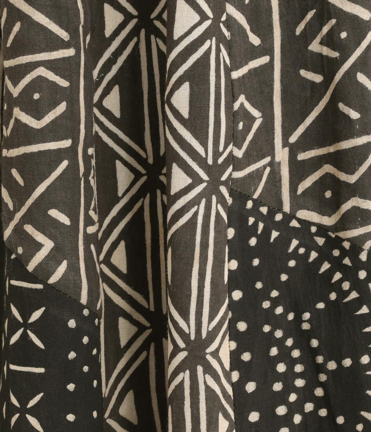 【素材】アフリカで最も有名な布のひとつである、ボゴランフィニと呼ばれる泥染布を使用しています。ドライな質感が特徴的で、軽やかな裏地つきで肌あたりも◎。【デザイン】黒地に白の幾何学模様が邪気から身を守ってくれるものだと考えられており、さまざまなメッセージが込められているテキスタイルが存在感のあるスカート。パッチワークのように切り替えを入れながらもまとまりがあります。ウエスト総ゴムに内紐入り。【ボゴランフィニ】(Bogolan Fini)ボゴランフィニは、西アフリカのマリ南西部に住むバンバラ族に伝わる伝統的な布で、邪気を寄せ付けないお守りとして着られていました。 ボゴは「泥」、ランは「~で作られる」、フィニは「布」をあらわし、ボゴランフィニは「泥を使って染め上げられた布」という意味です。