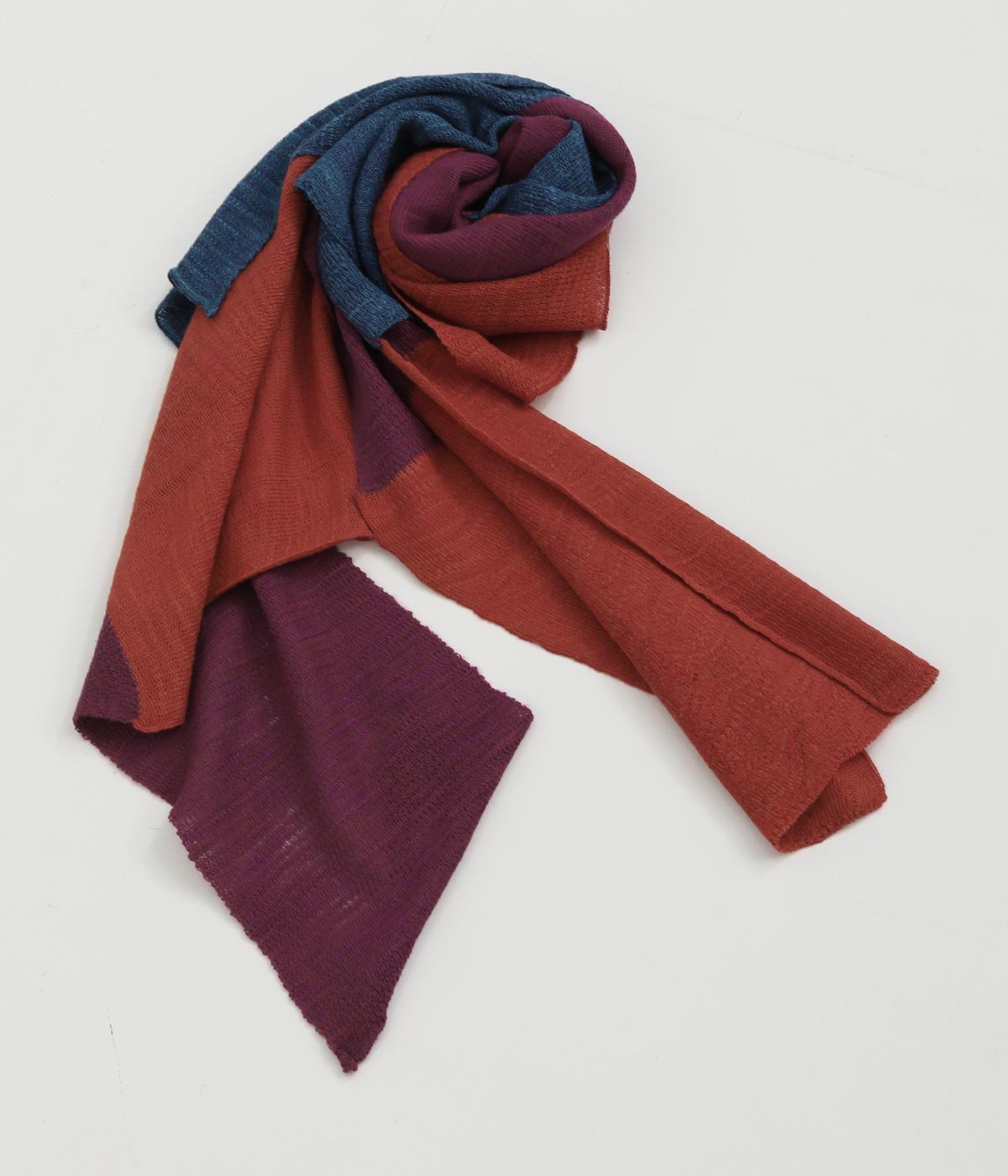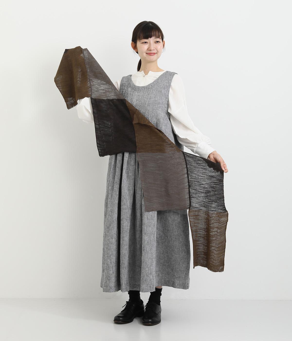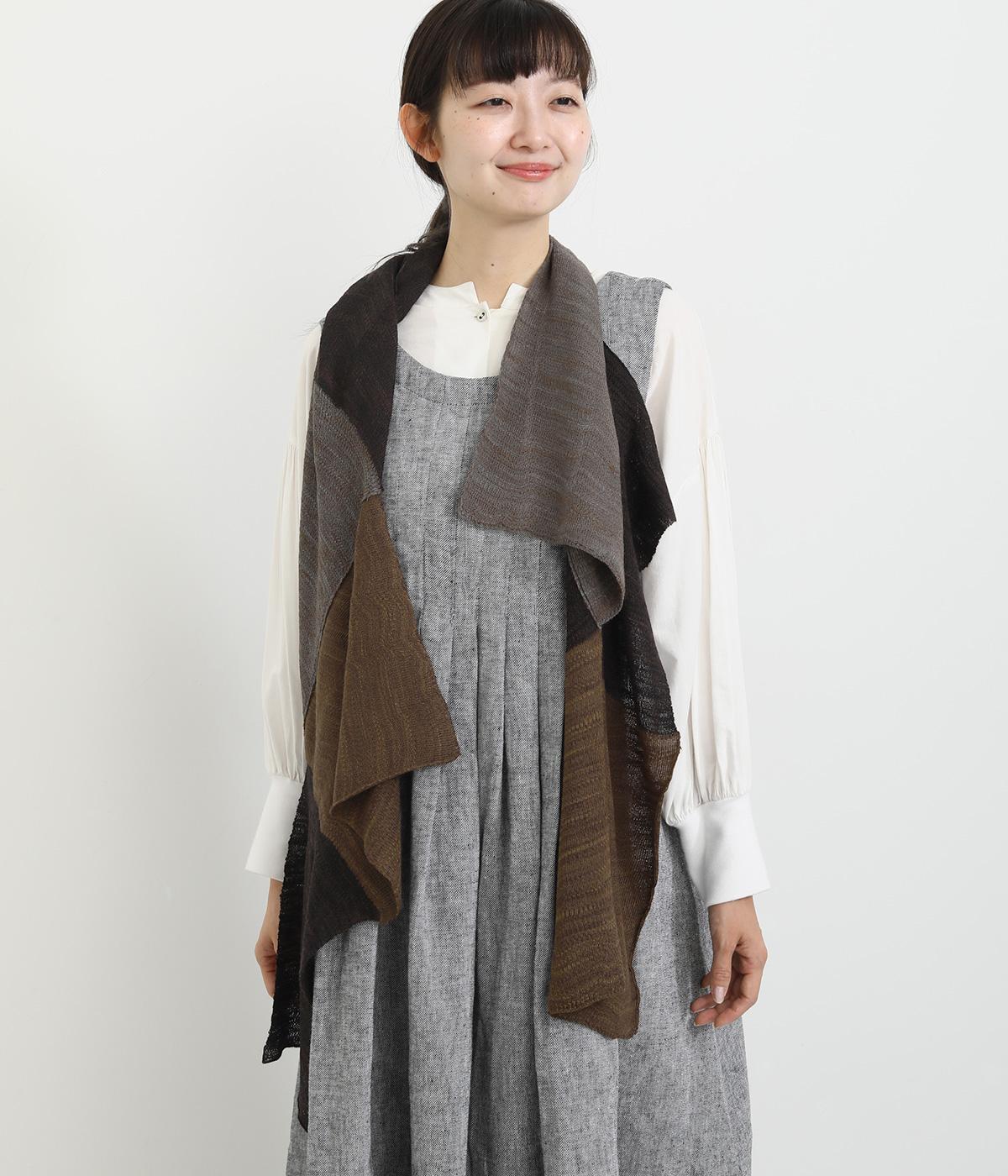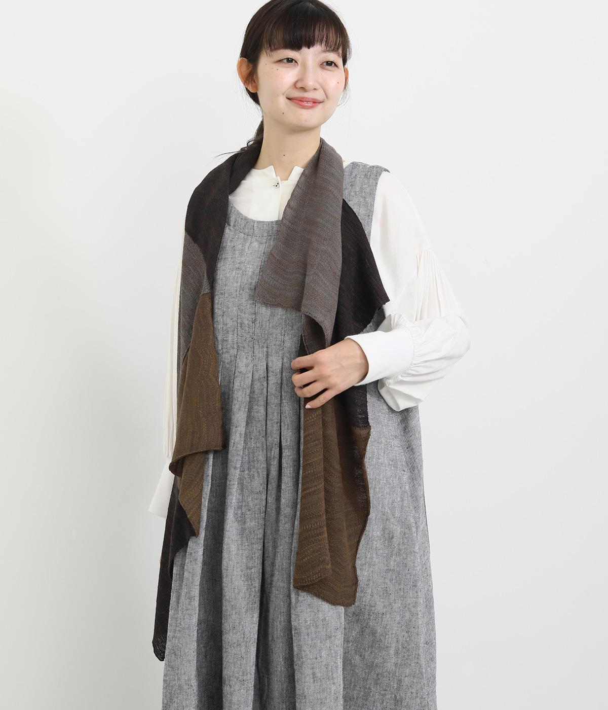 肩からかけたときに独特なラインを描くパッチワークストール。シンプルなスタイリングも一気に個性的な雰囲気に仕上がります。首元にぐるっと巻けば落ち着いた表情になり、アレンジ自在に楽しるアイテムです。