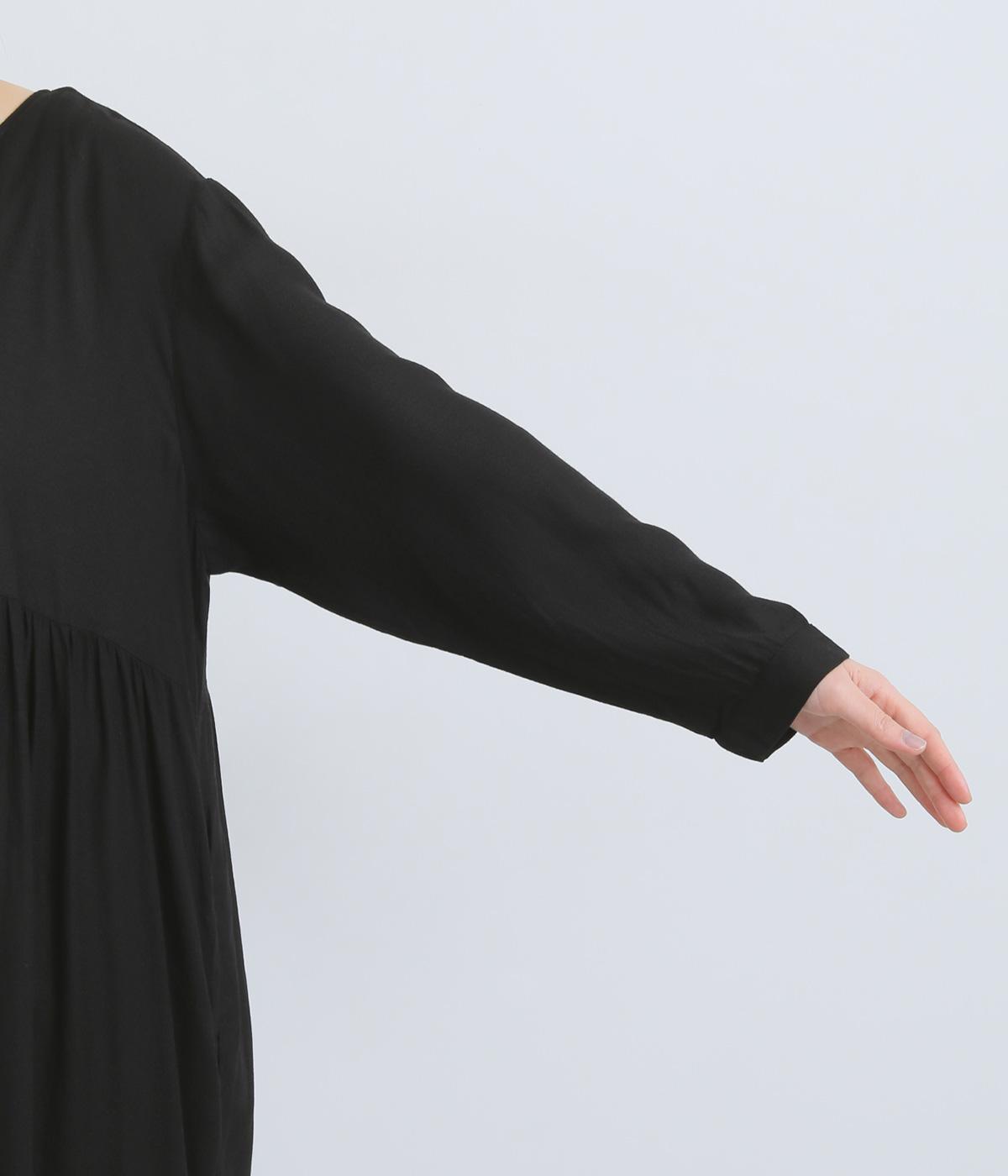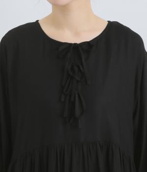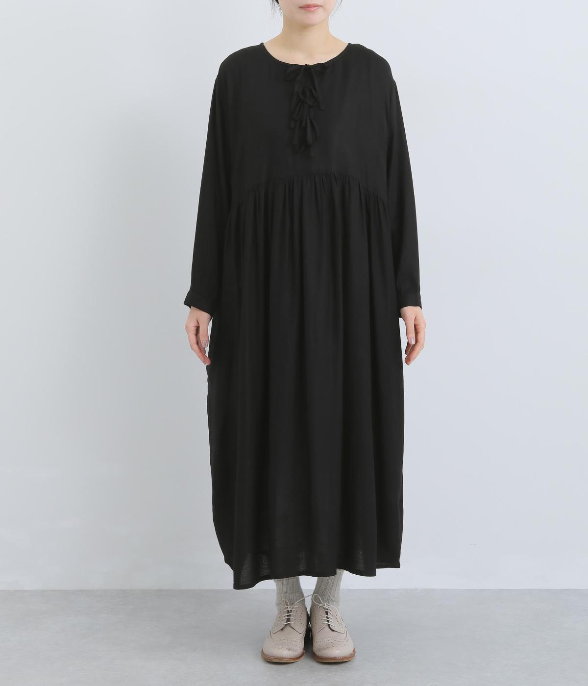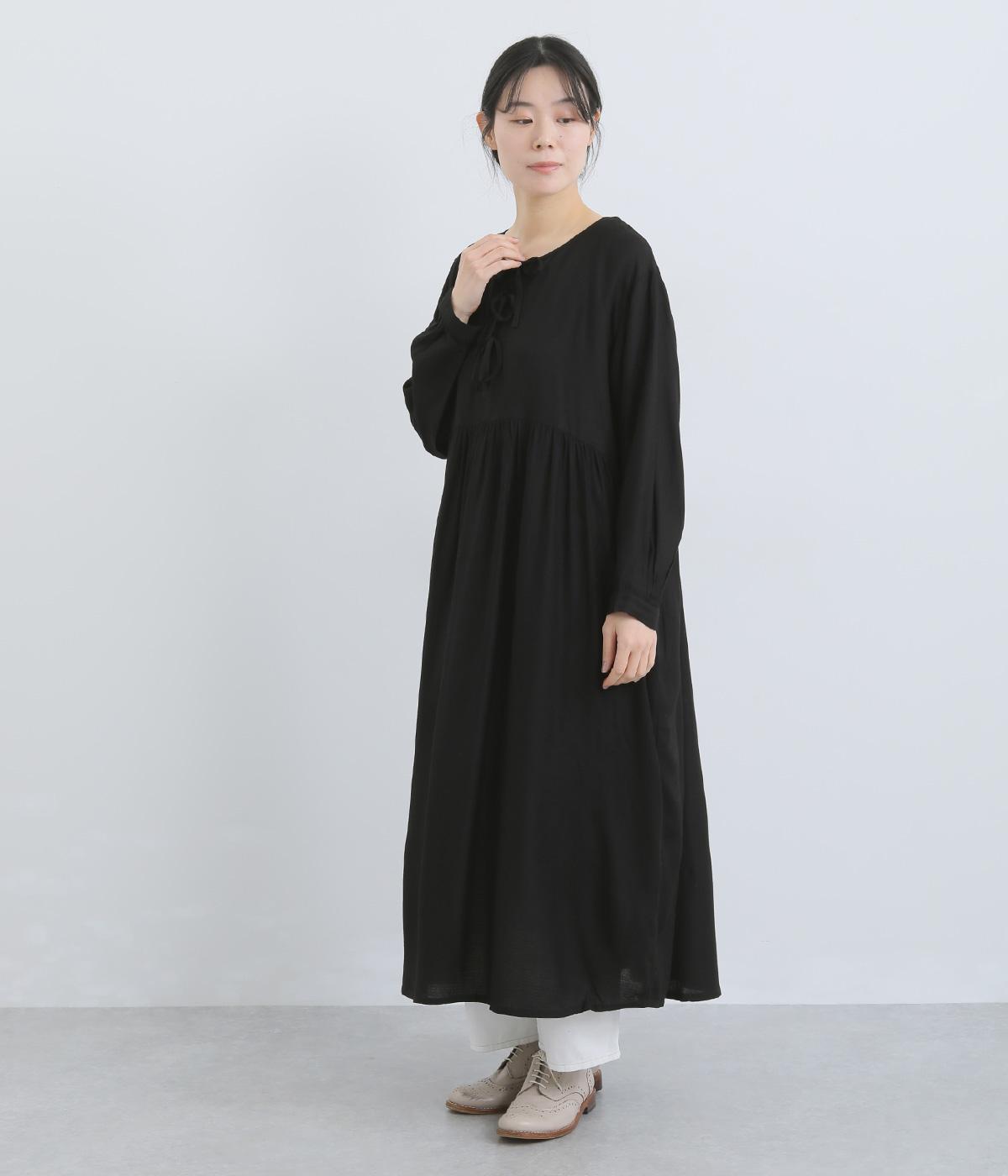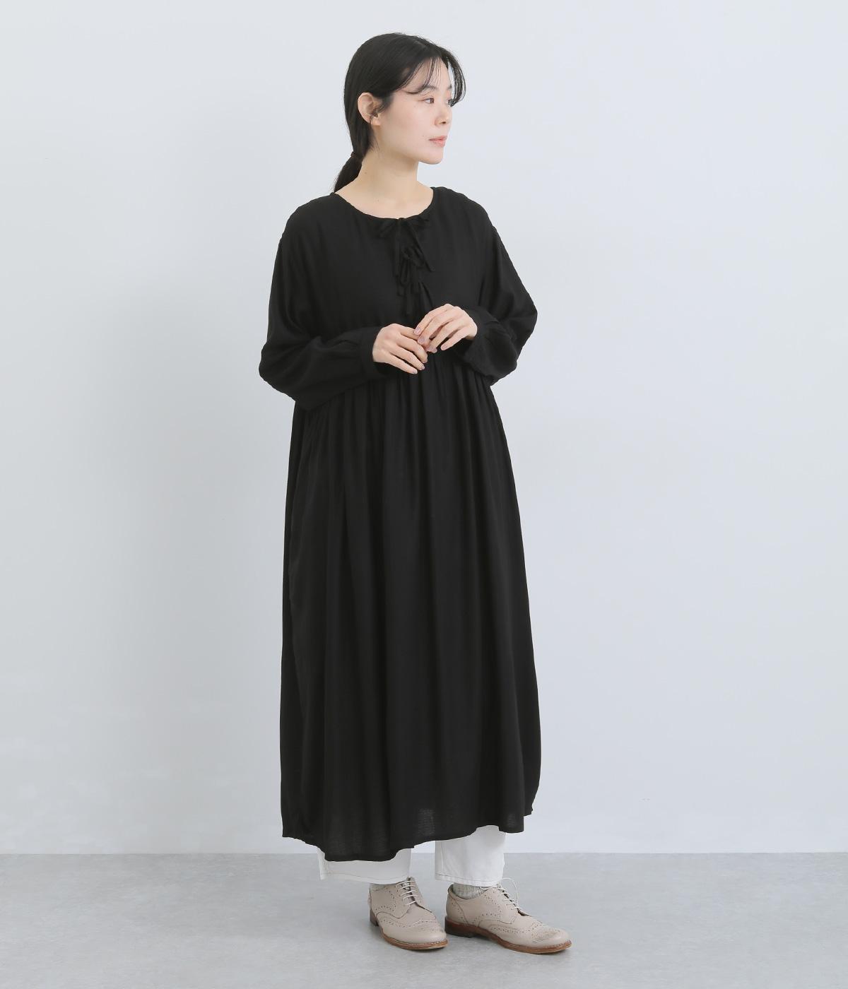 胸元のリボンディテールがモードな雰囲気に甘さを足したワンピース。シンプルながらもレーヨンの素材感がひかり、ドレープによる自然な陰影がブラックアイテムに表情をもたらします。ゆとりのあるシルエットで着心地も抜群。
