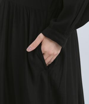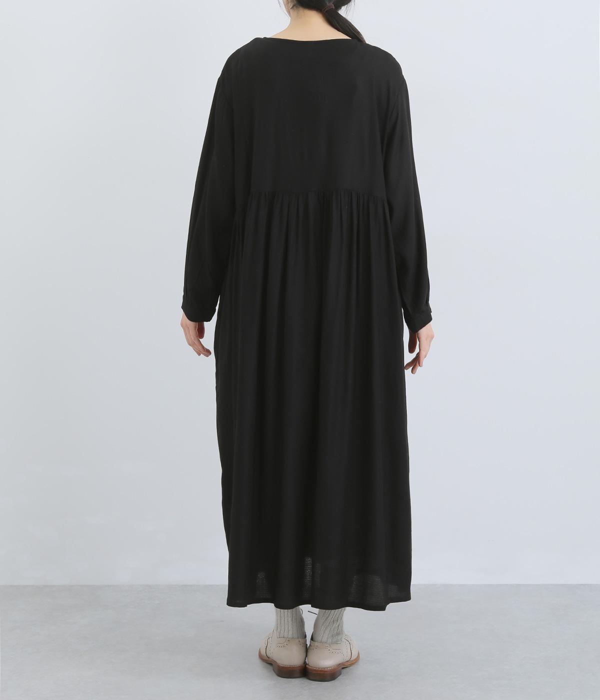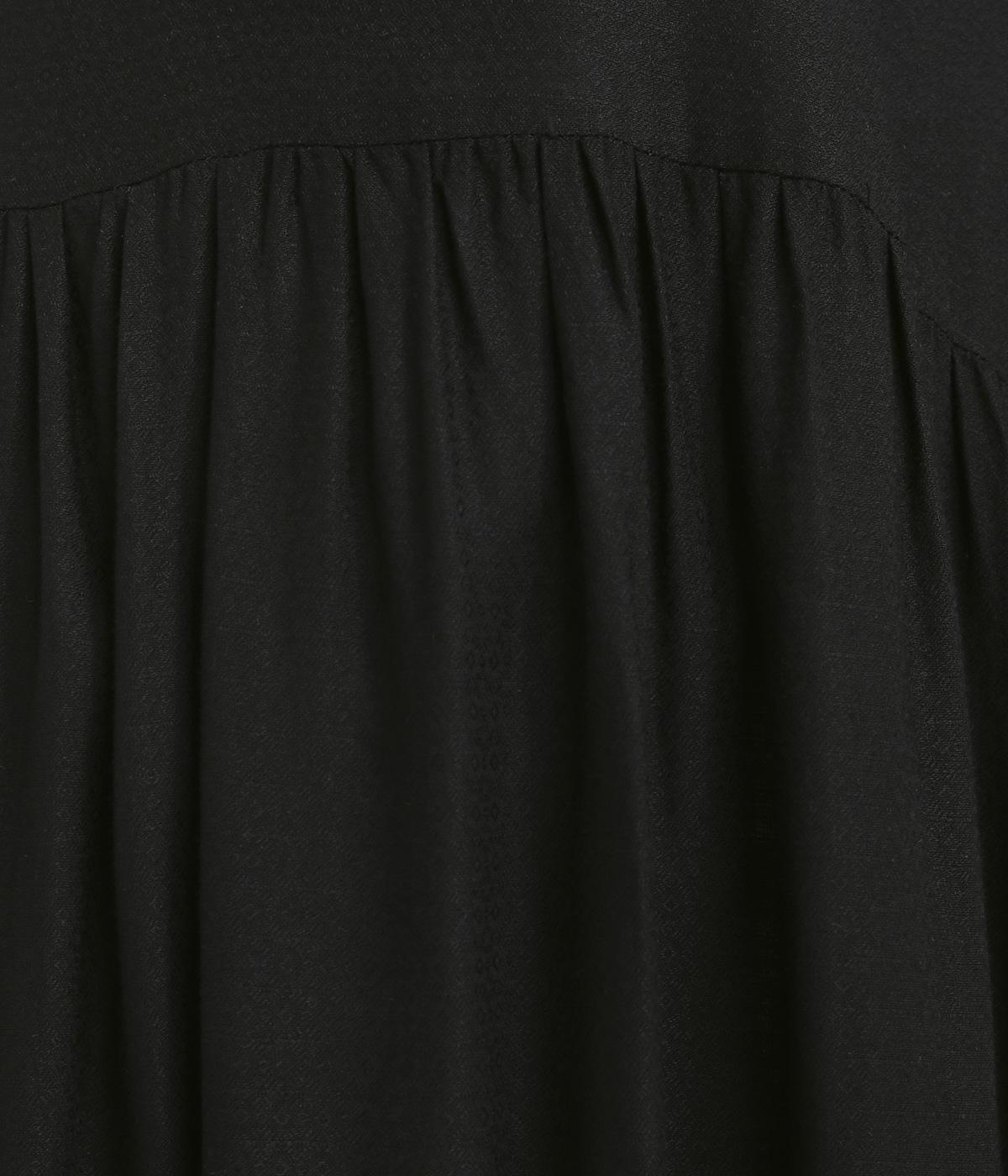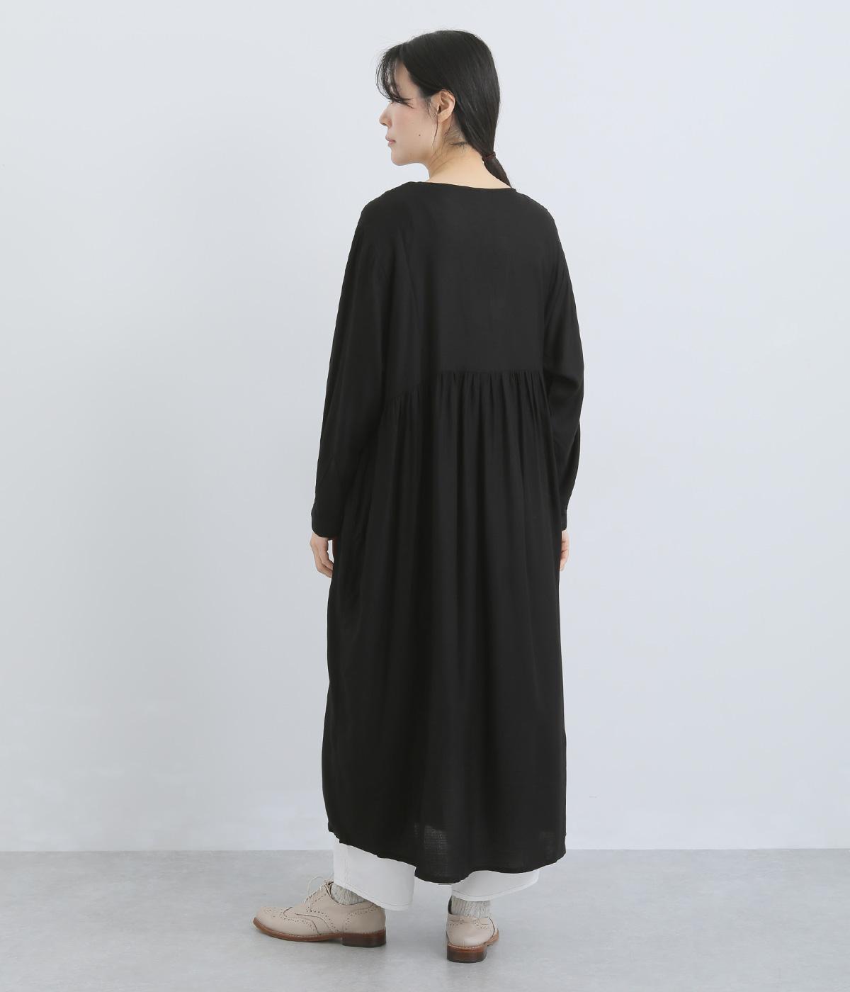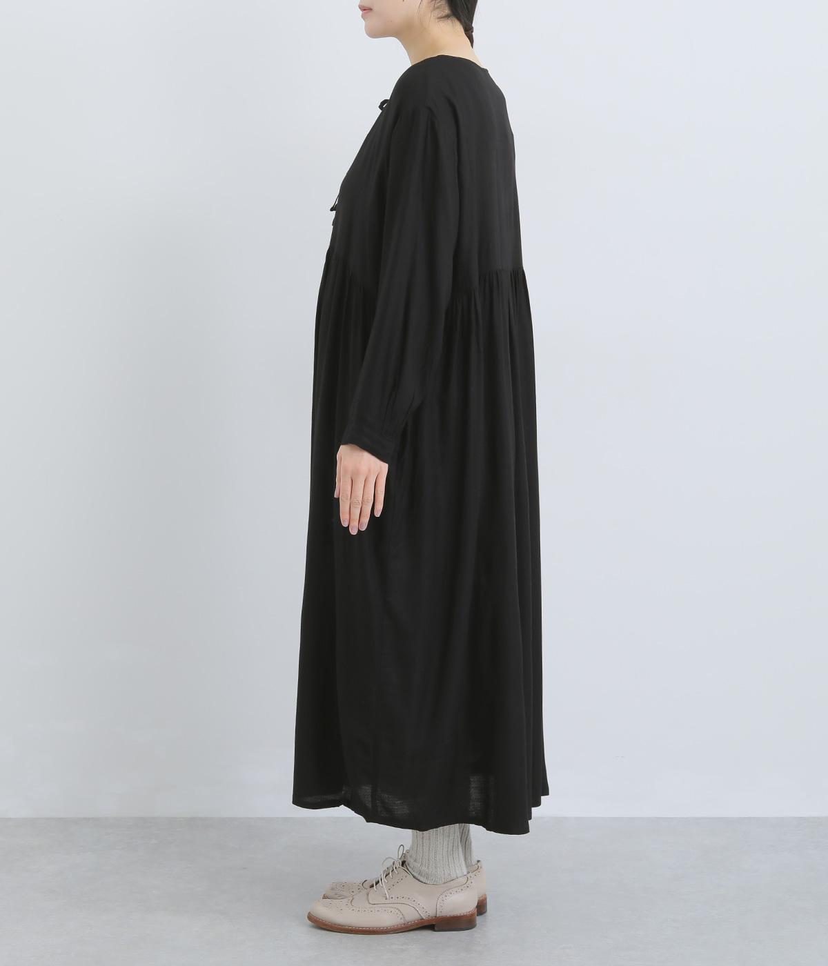 胸元のリボンディテールがモードな雰囲気に甘さを足したワンピース。シンプルながらもレーヨンの素材感がひかり、ドレープによる自然な陰影がブラックアイテムに表情をもたらします。ゆとりのあるシルエットで着心地も抜群。