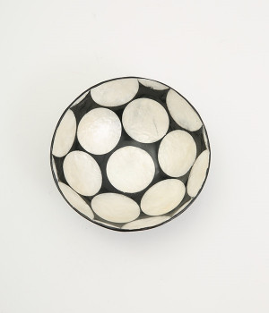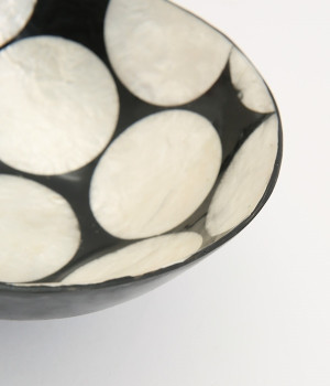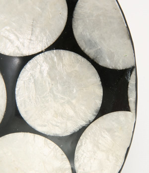 水玉柄が印象的なシェルのラウンドトレイです。黒をベースに白蝶貝のキラキラと光る様子が、モダンで上品な雰囲気。アクセサリーや鍵などのちょっとした小物入れにぴったりのサイズです。合わせるインテリアを選ばず、玄関やリビングなどの棚に置いて置くだけでさりげない存在感を発揮。天然素材ならではの、世界にひとつだけの輝きを味わうことができます。