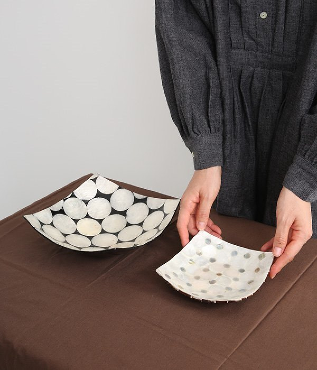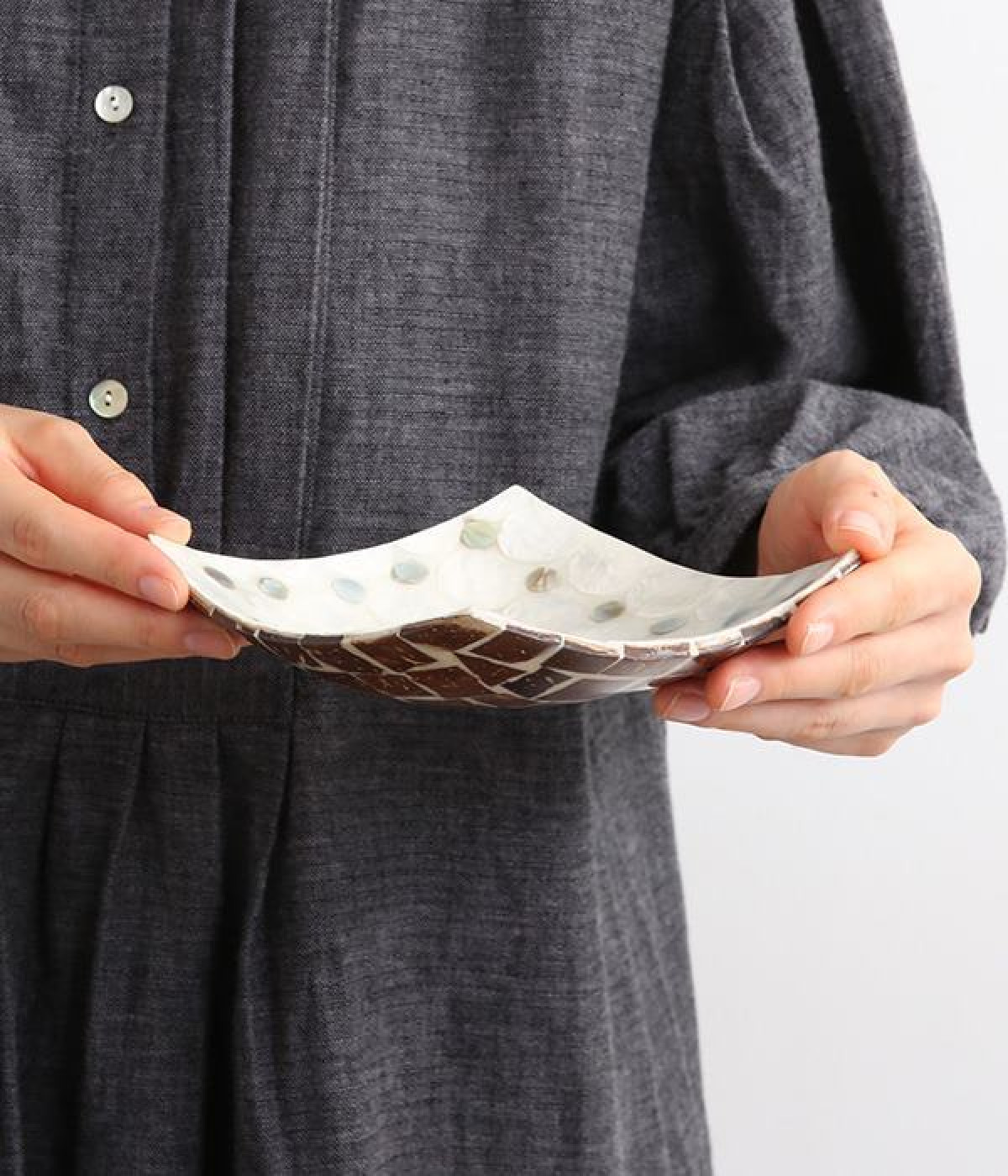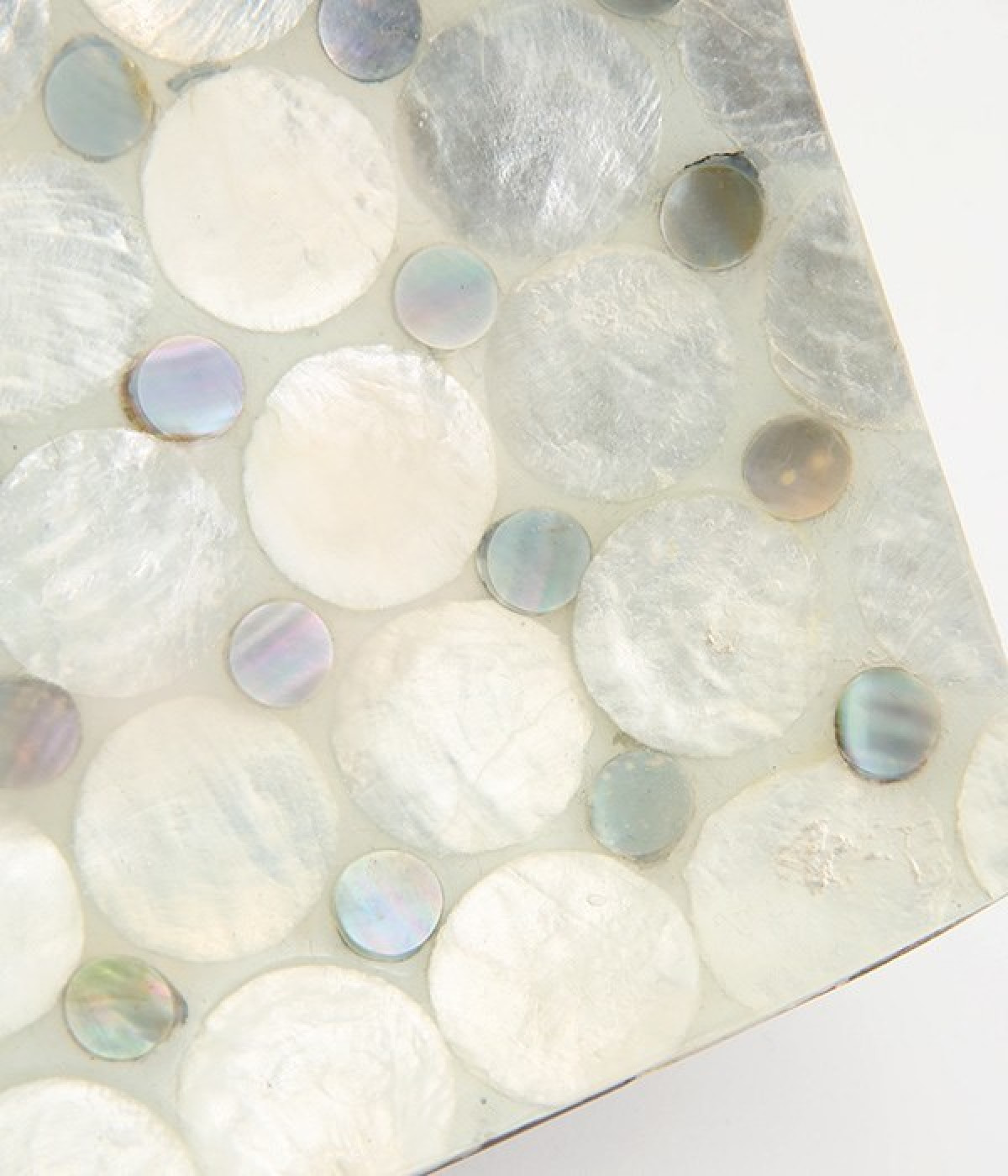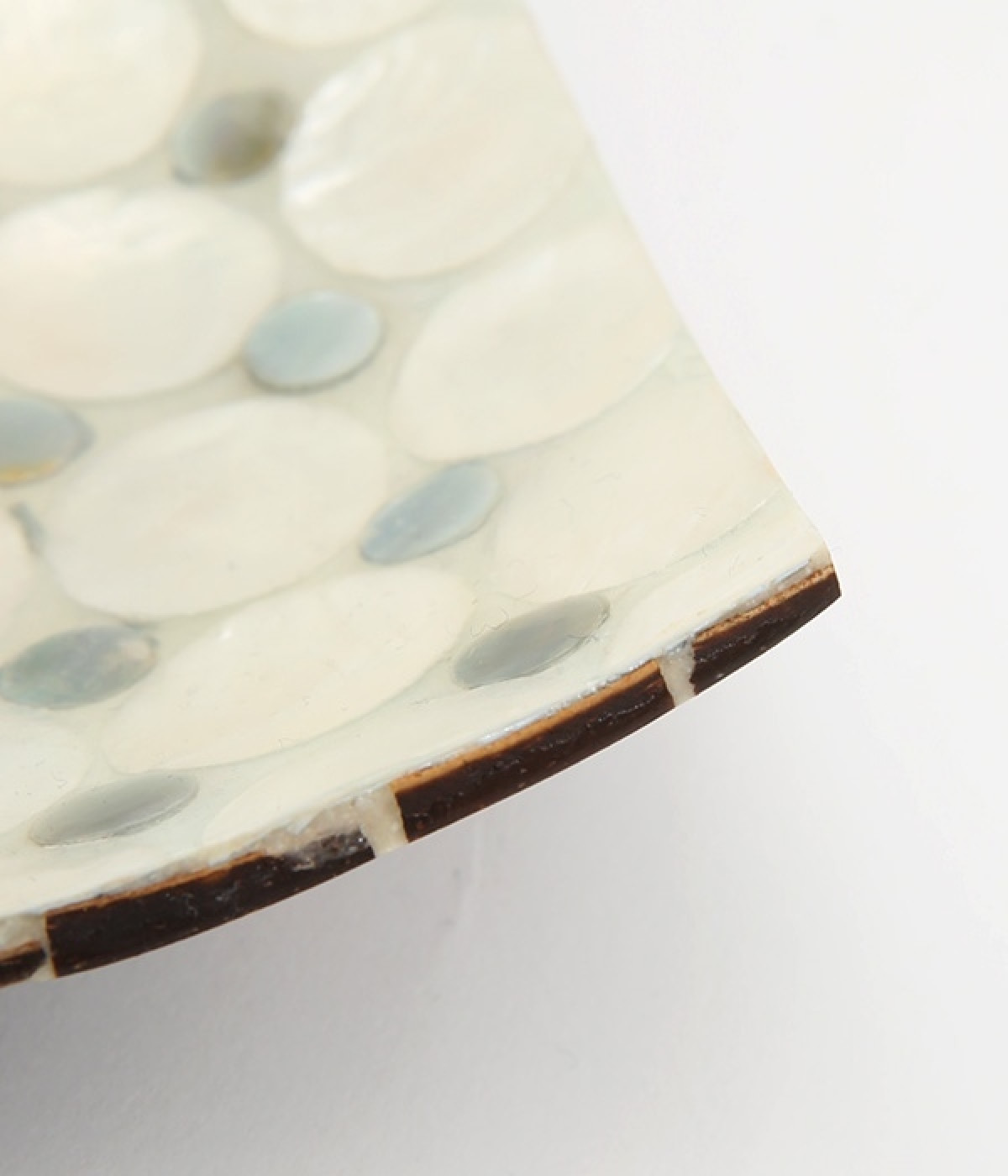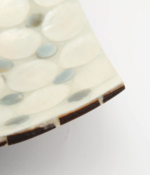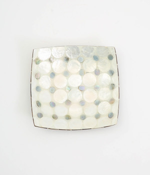 規則的に並んだドットのシェルの細工が素敵なスクエアトレイです。天然のカピスシェルを美しいモザイクタイル状にはめこんだデザイン。大小の色味の違うシェルが並んでキラキラと輝きます。お盆や小物入れとして使ったり、ホテルのようなパウダールームの演出をしたり、さまざまな用途で楽しめます。裏側にはココナッツウッドがモザイク状に並んだ、細部にまでこだわった仕上がり。天然素材ならではの、世界にひとつだけの輝きを堪能できます。