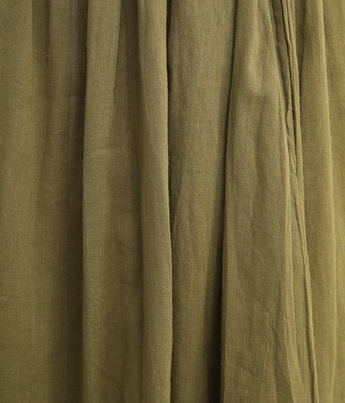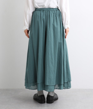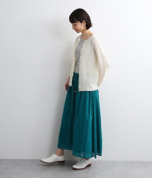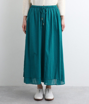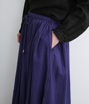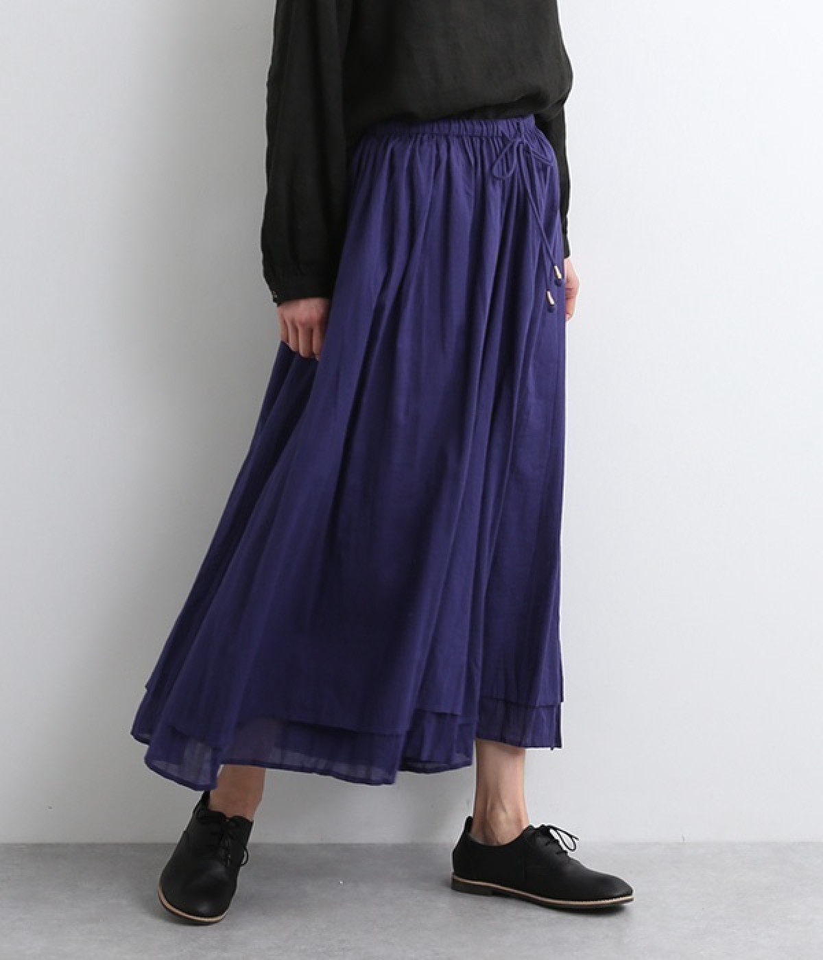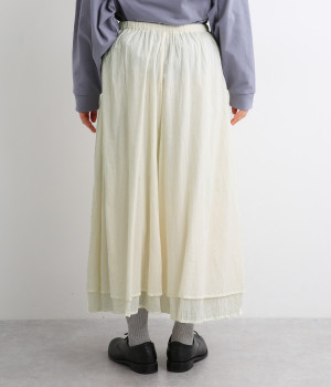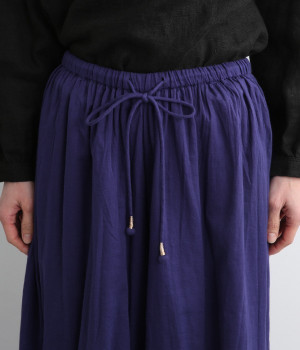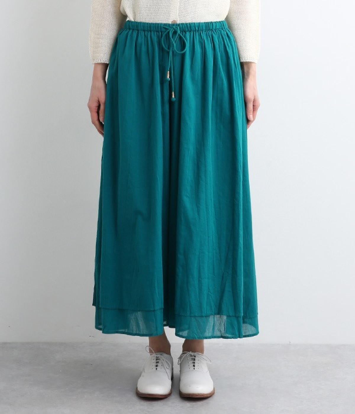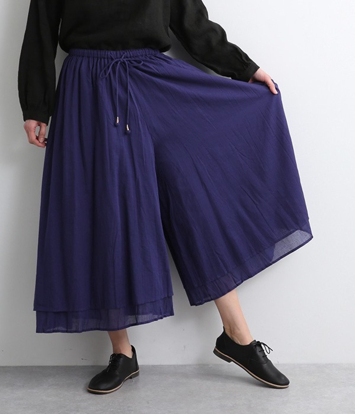 ふわっとした柔らかな風合いと、軽やかな肌触りが魅力のインド綿を使用したワイドギャザーパンツです。生地を二枚重ね合わせてレイヤードデザインに仕立てた、スカート見えするフレアなシルエットが特徴。ウエストまわりはゴムでコンパクトにフィットするラクなはき心地です。サイズの微調整もできる腰ひもの先端には金糸が巻かれており、ちょっぴりリッチなアクセントに。