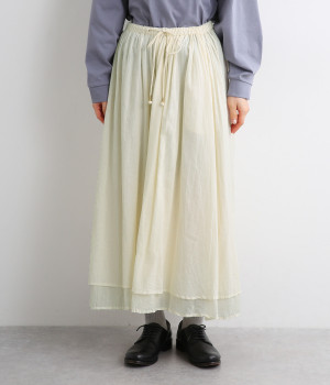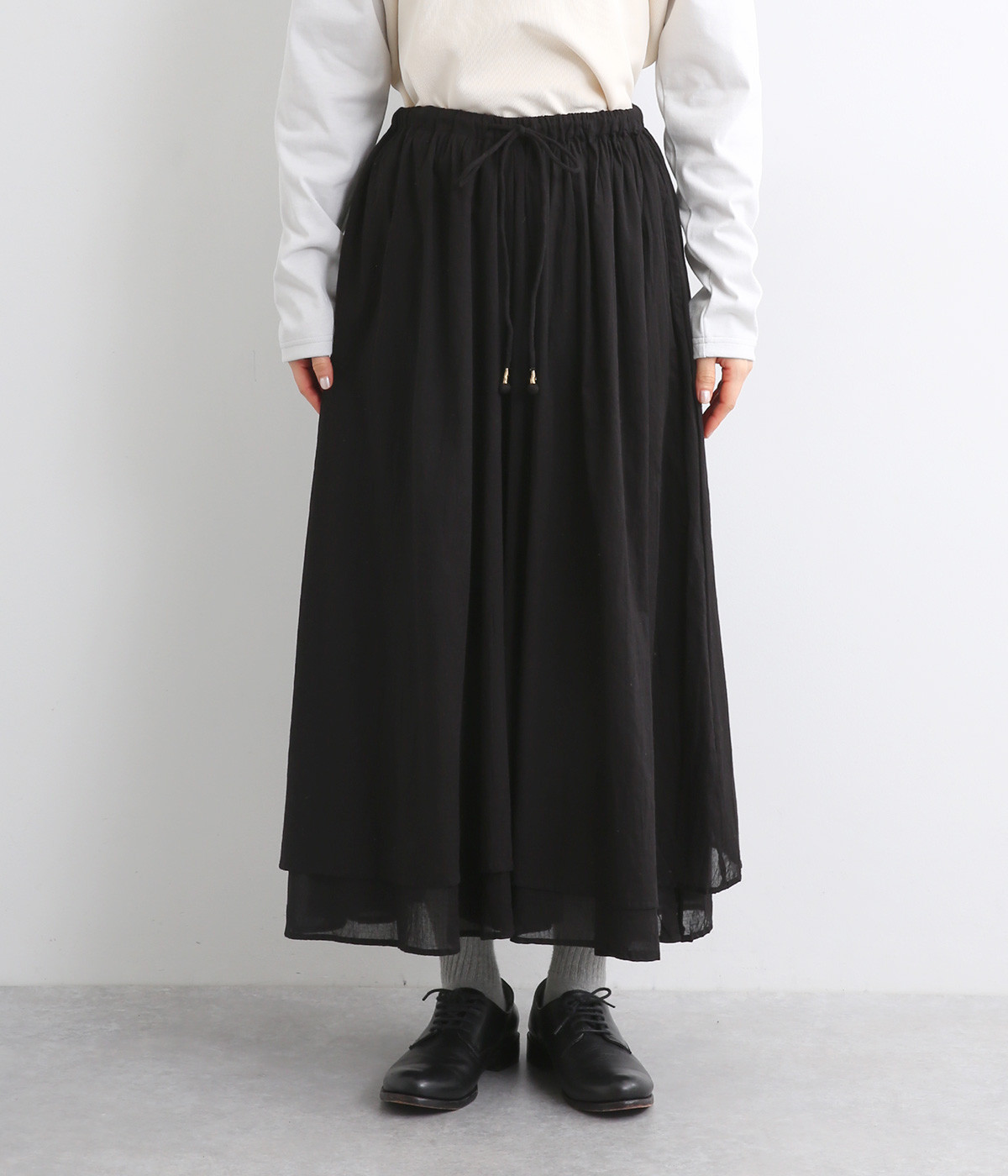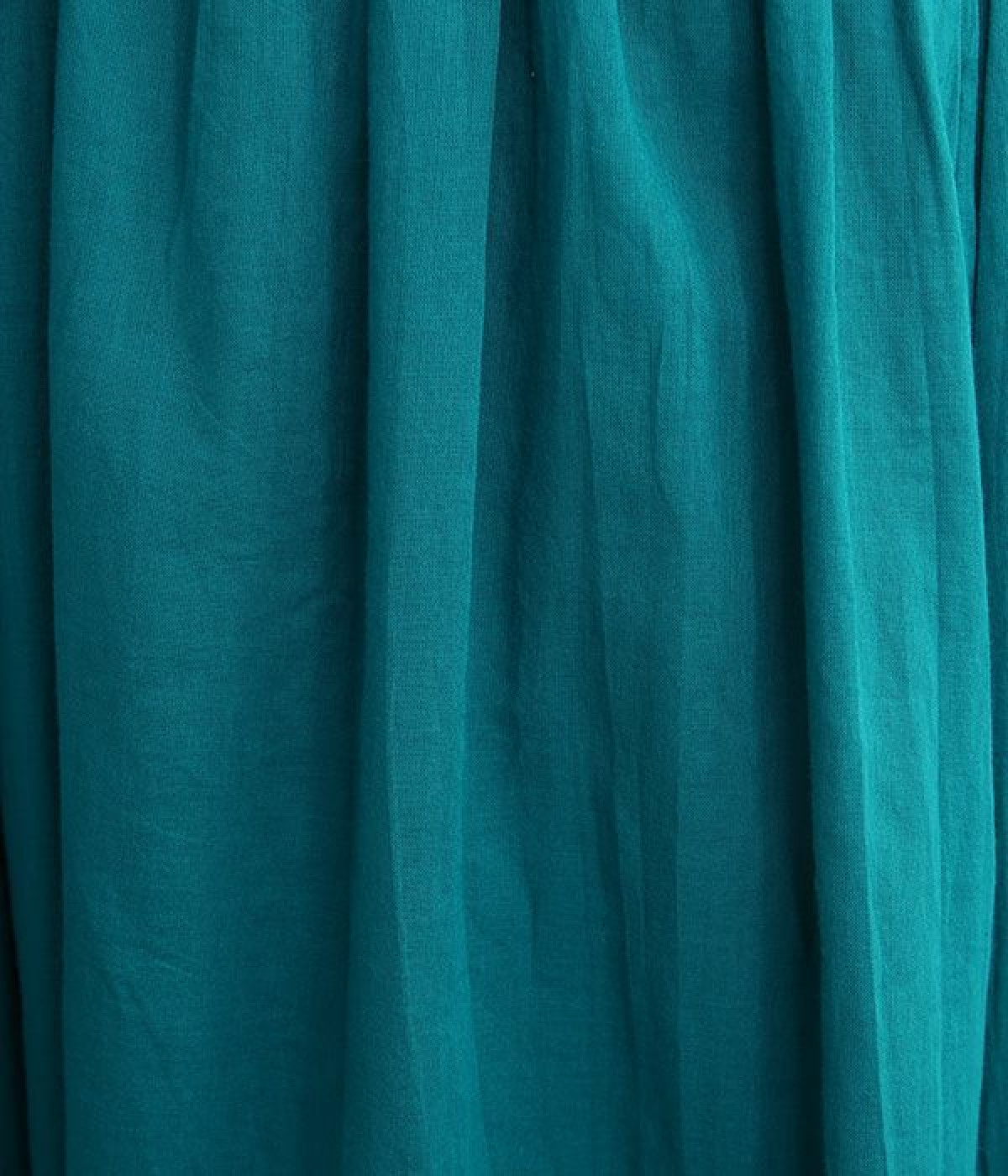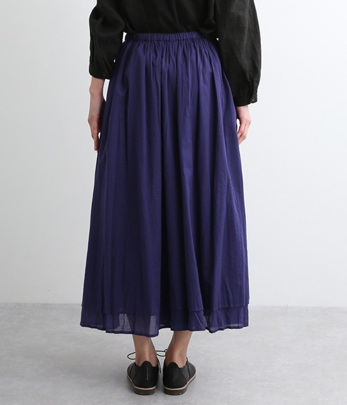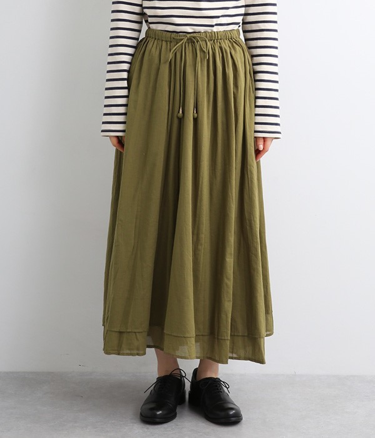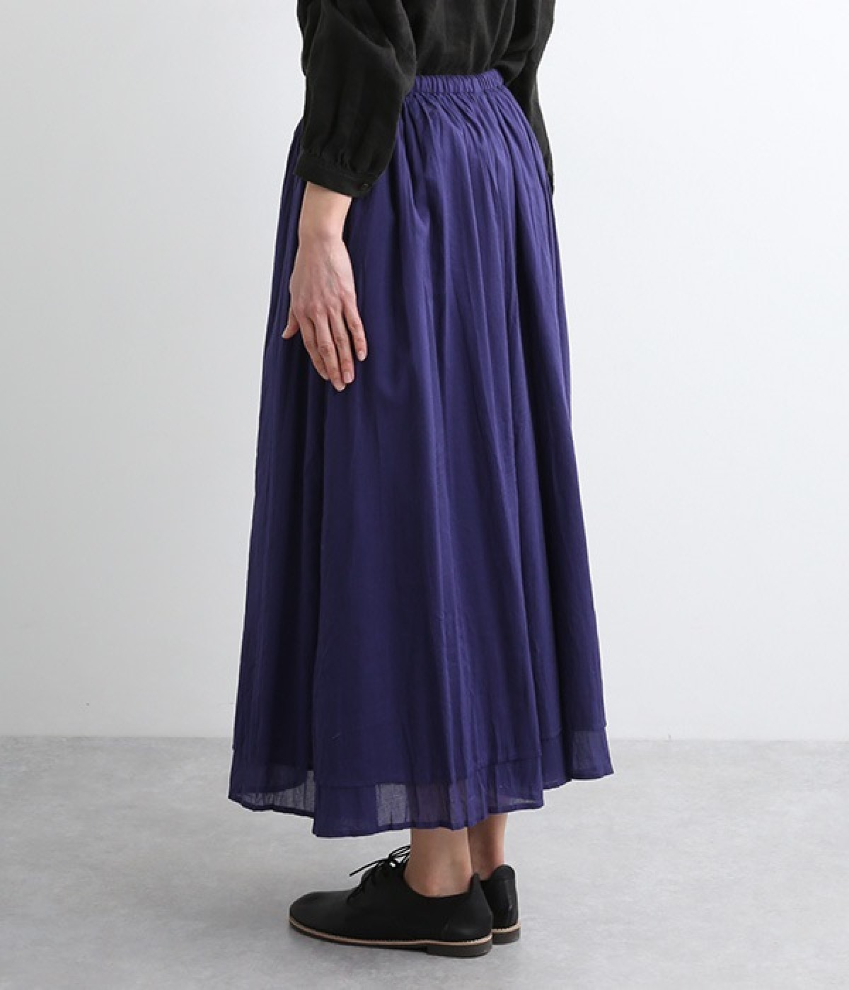 ふわっとした柔らかな風合いと、軽やかな肌触りが魅力のインド綿を使用したワイドギャザーパンツです。生地を二枚重ね合わせてレイヤードデザインに仕立てた、スカート見えするフレアなシルエットが特徴。ウエストまわりはゴムでコンパクトにフィットするラクなはき心地です。サイズの微調整もできる腰ひもの先端には金糸が巻かれており、ちょっぴりリッチなアクセントに。