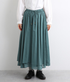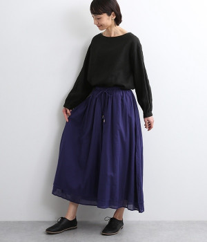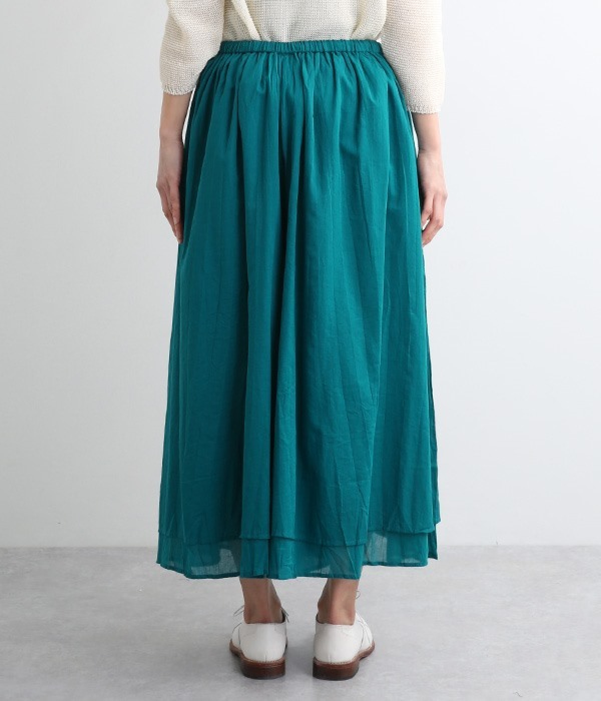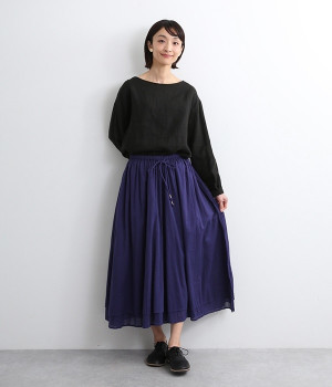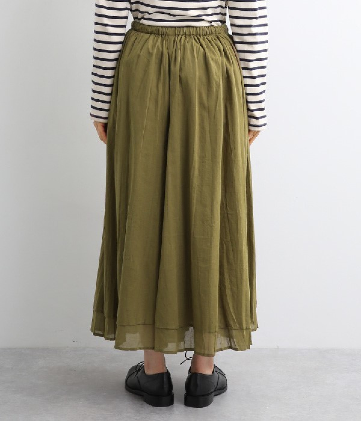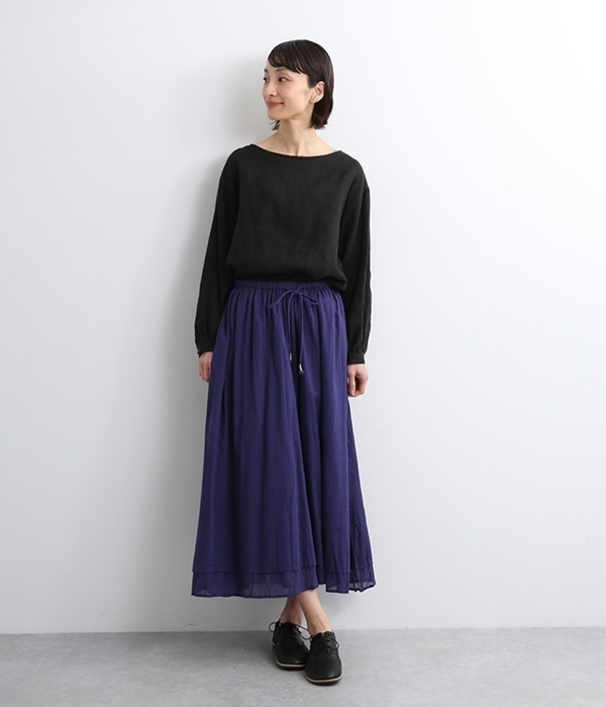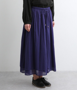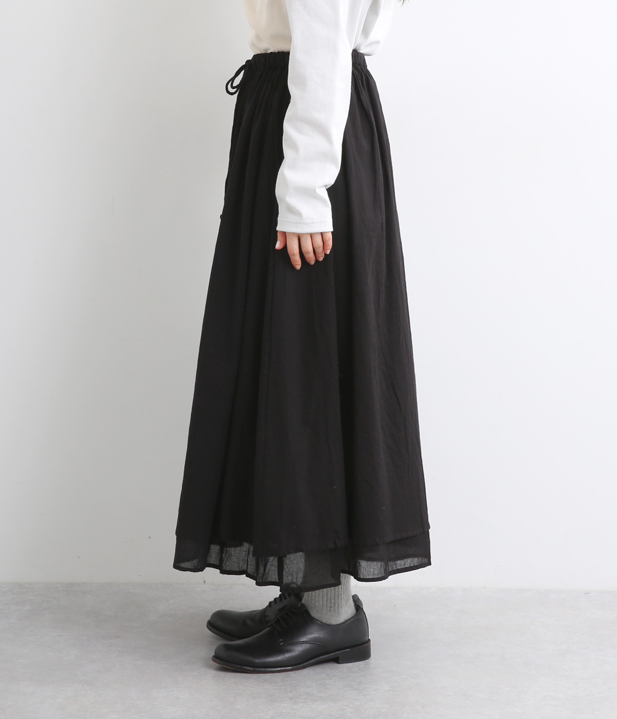 ふわっとした柔らかな風合いと、軽やかな肌触りが魅力のインド綿を使用したワイドギャザーパンツです。生地を二枚重ね合わせてレイヤードデザインに仕立てた、スカート見えするフレアなシルエットが特徴。ウエストまわりはゴムでコンパクトにフィットするラクなはき心地です。サイズの微調整もできる腰ひもの先端には金糸が巻かれており、ちょっぴりリッチなアクセントに。