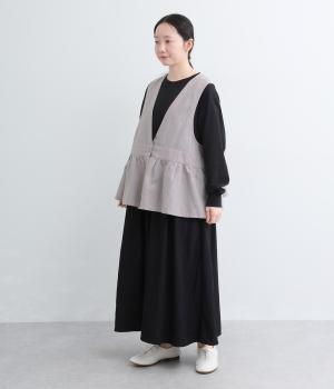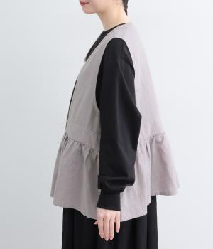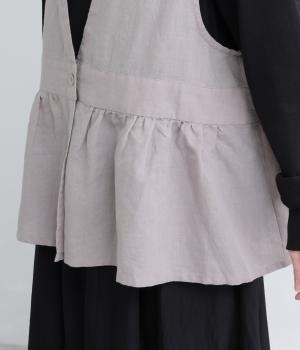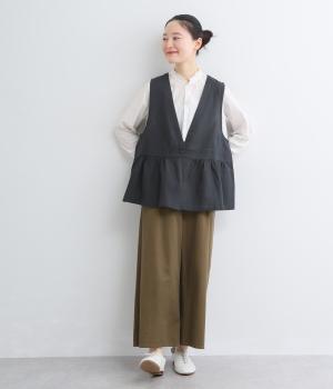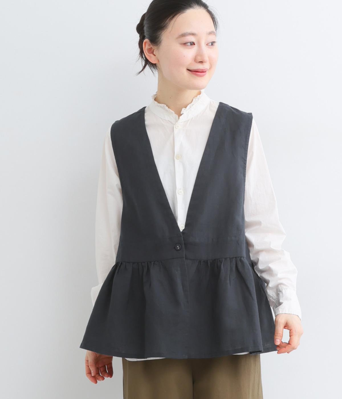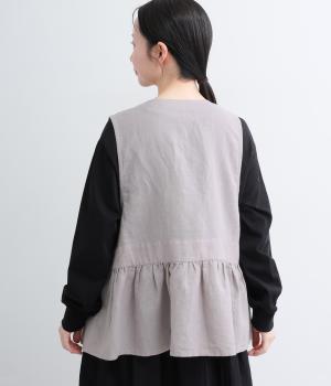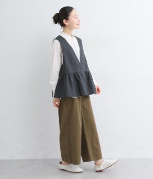 ウエストラインでベルト切り替えを入れ、ペプラム風のフレアシルエットに仕立てました。ギャザーの甘さとすっきりしたVネックのバランスが良く、シンプルなカットソー合わせでもさまになります。ひとつボタンを外してジレのように羽織っても◎。