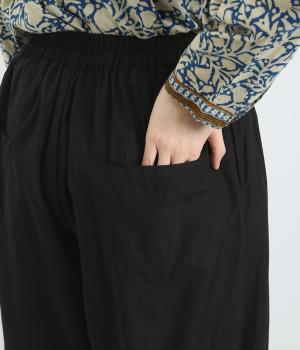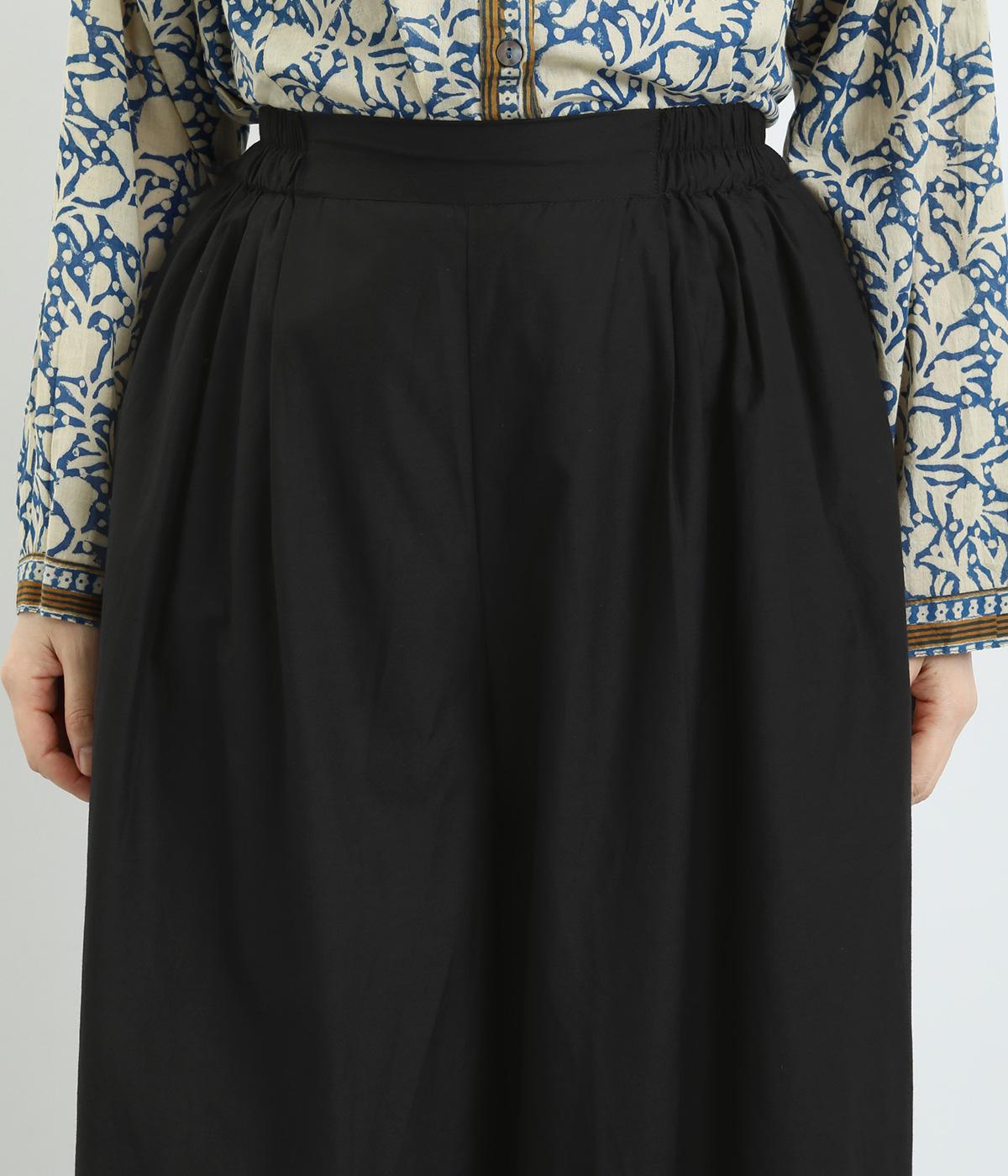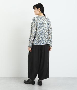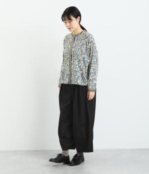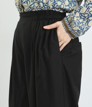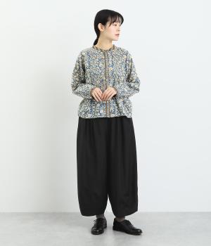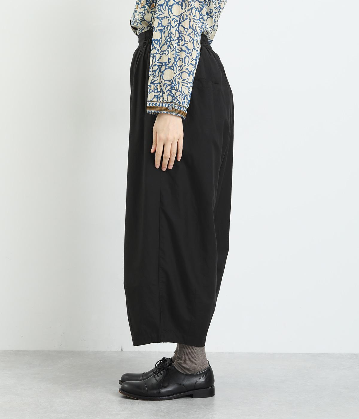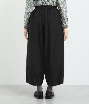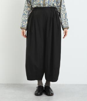 まるみのあるシルエットがかわいらしいタック入りのパンツです。上質なコットンとシルク素材でなめらかフォルムをつくりだし、こなれ感を演出。シンプルなトップスでも存在感のある着こなしに仕上がります。ウエストは後身ごろとサイドにゴム入りで安心感も抜群です。