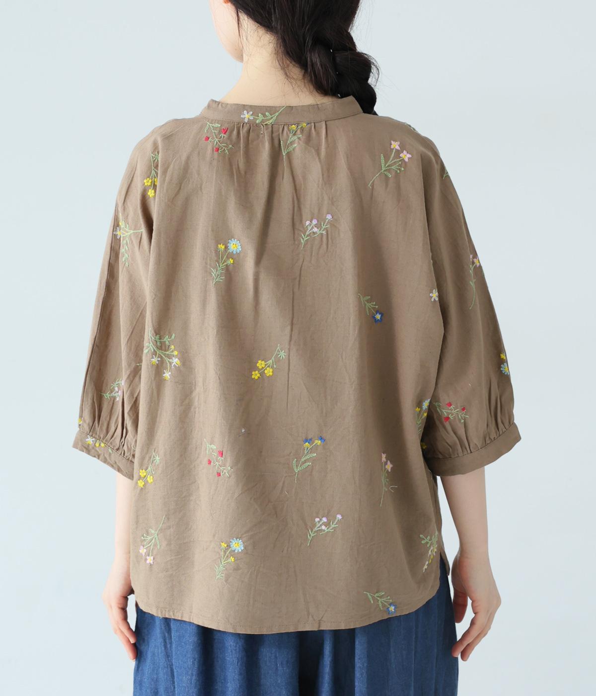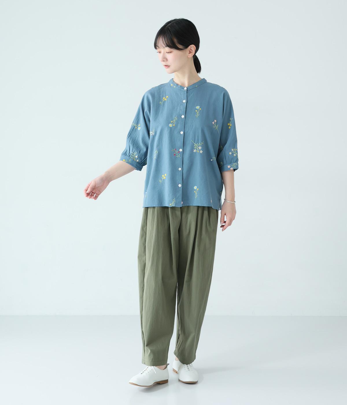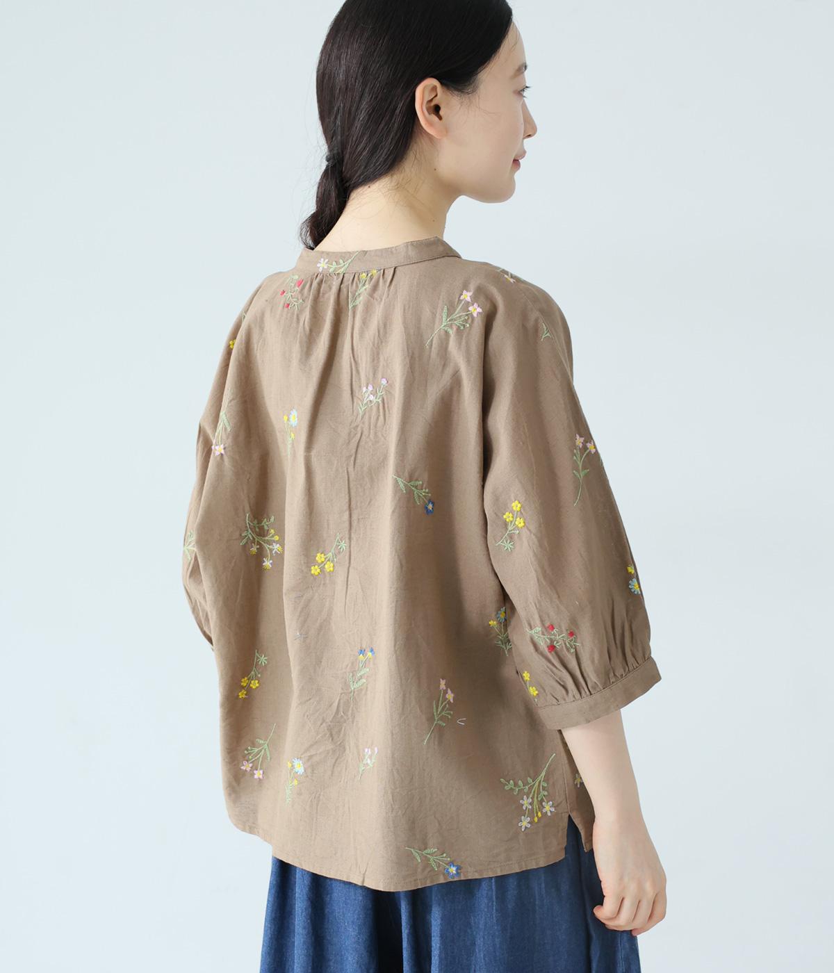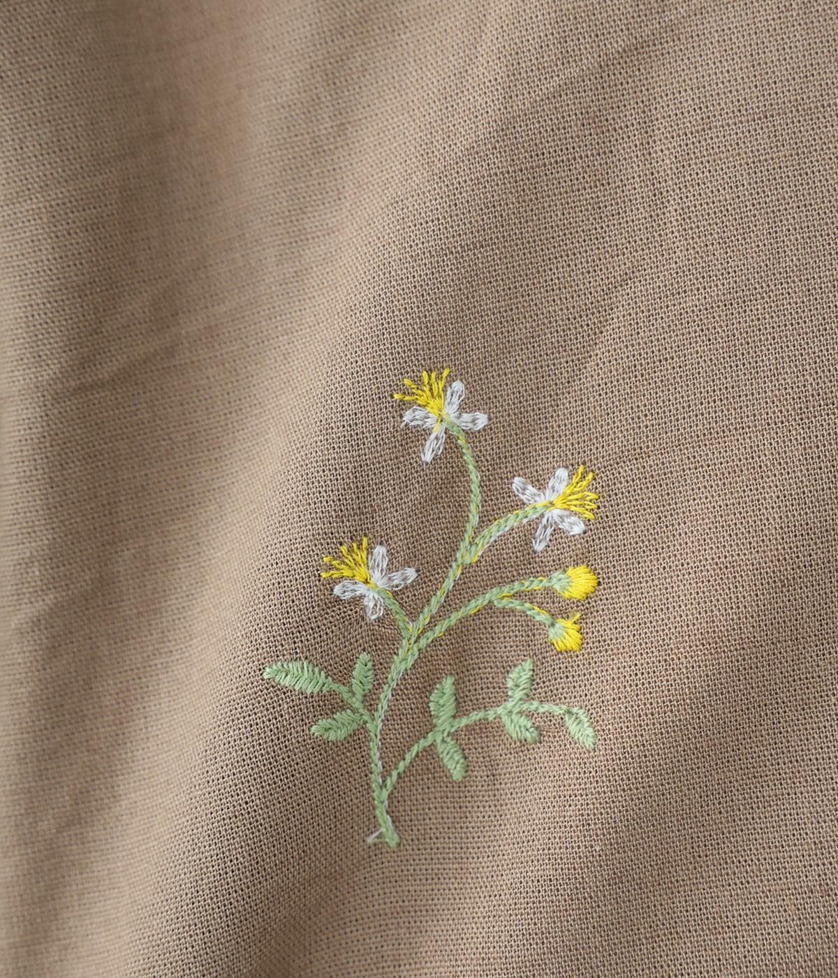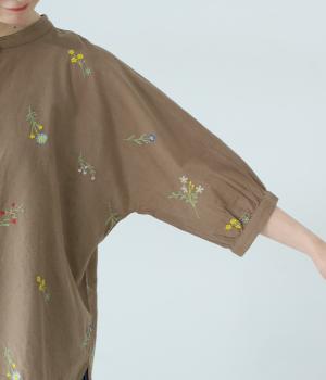 野花の刺しゅうが春らしいムードを運ぶブラウスです。ふんわりとした身頃と袖のシルエットに、首元はすっきりと整えました。愛らしい雰囲気ながら甘すぎず、カジュアルな装いにもマッチします。