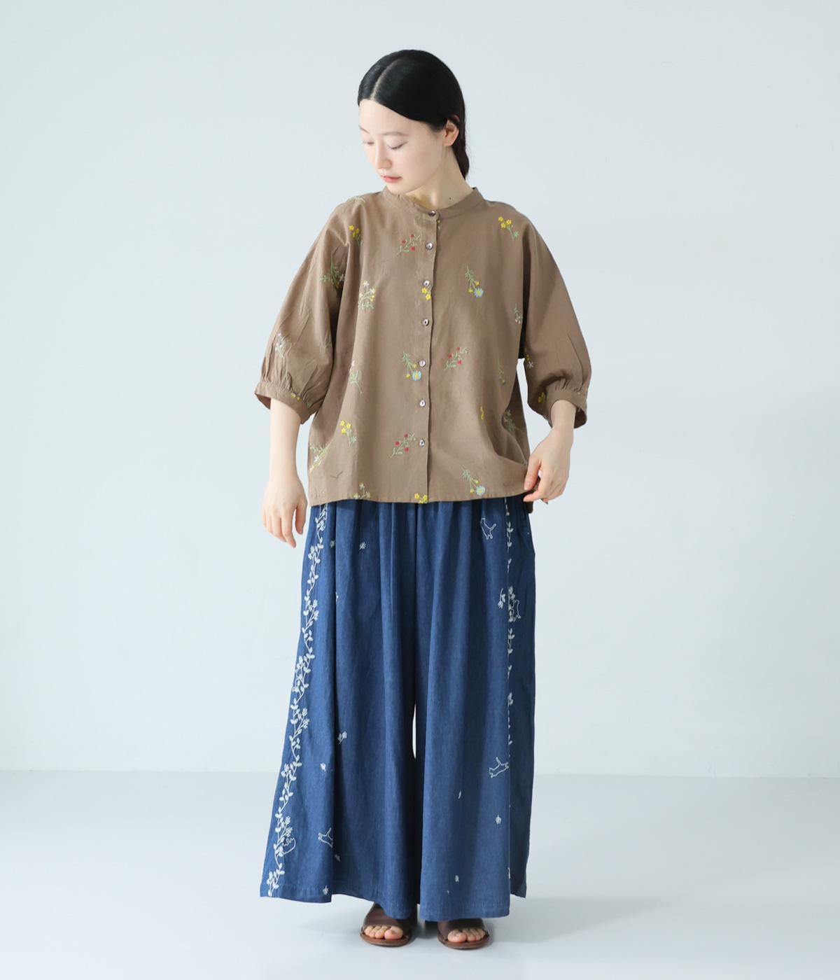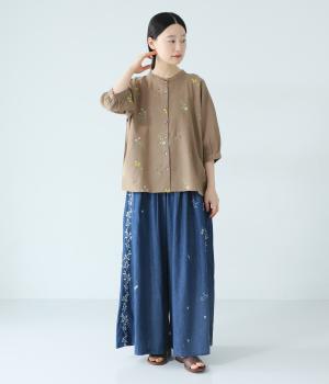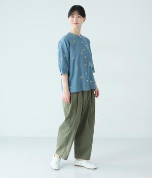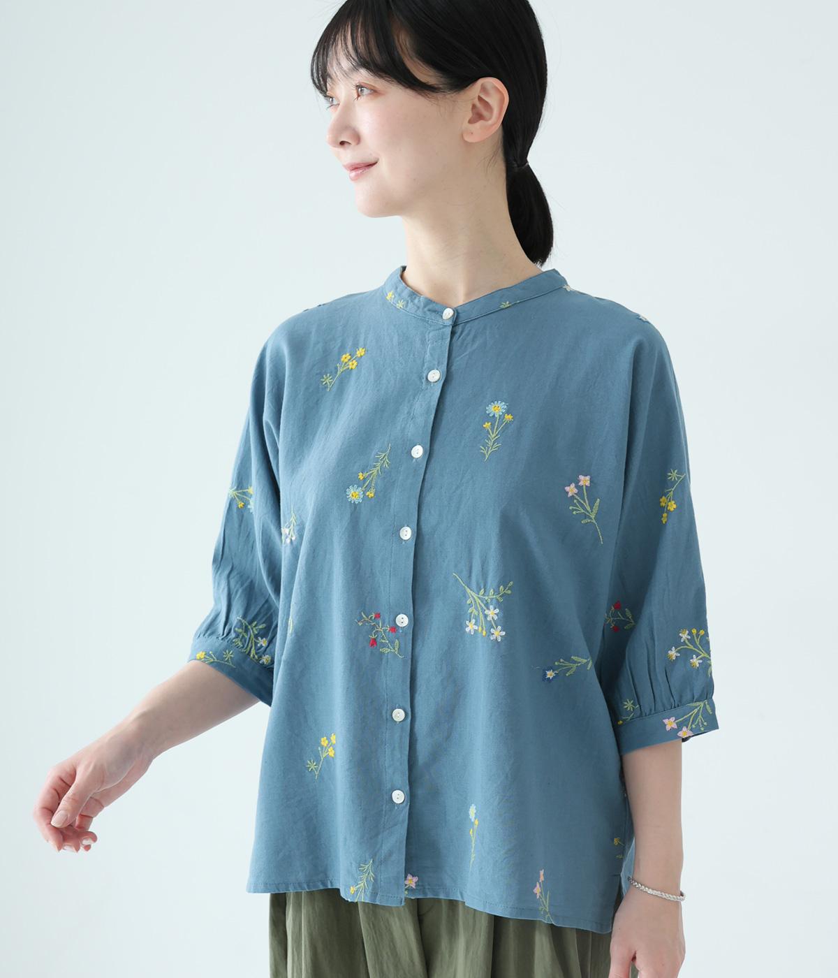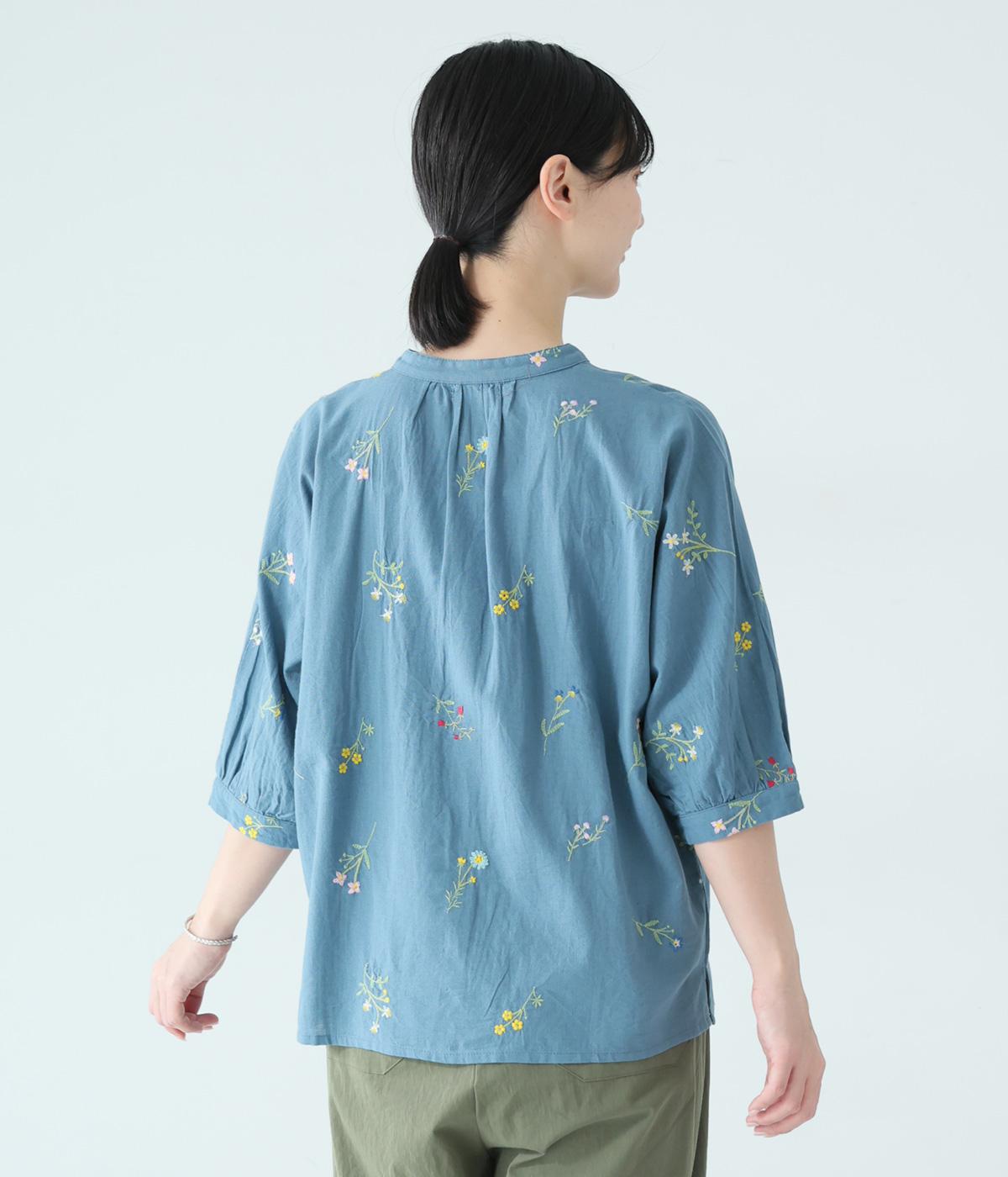 野花の刺しゅうが春らしいムードを運ぶブラウスです。ふんわりとした身頃と袖のシルエットに、首元はすっきりと整えました。愛らしい雰囲気ながら甘すぎず、カジュアルな装いにもマッチします。