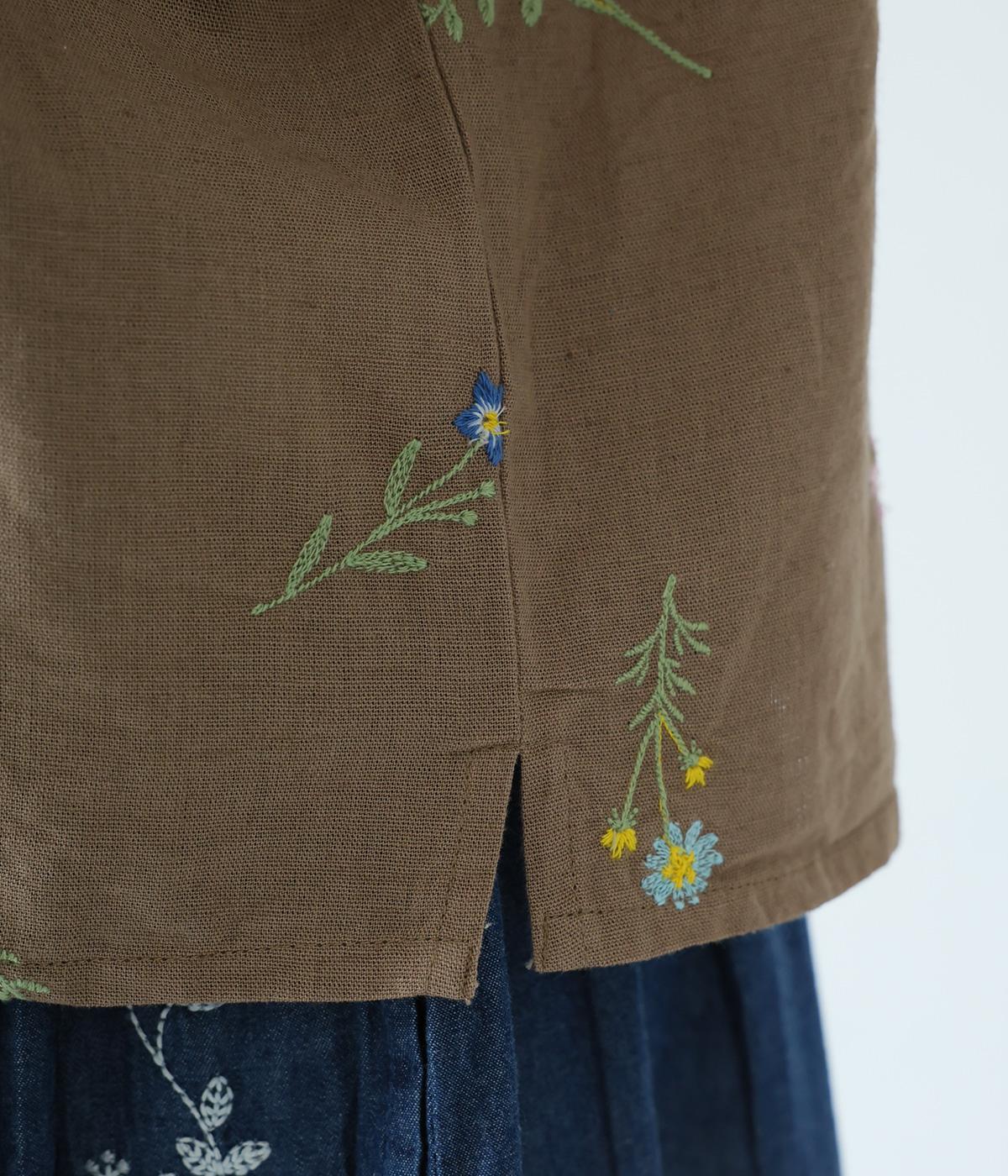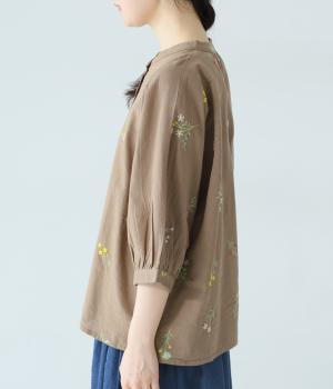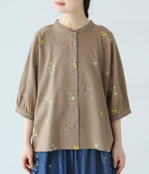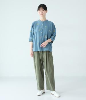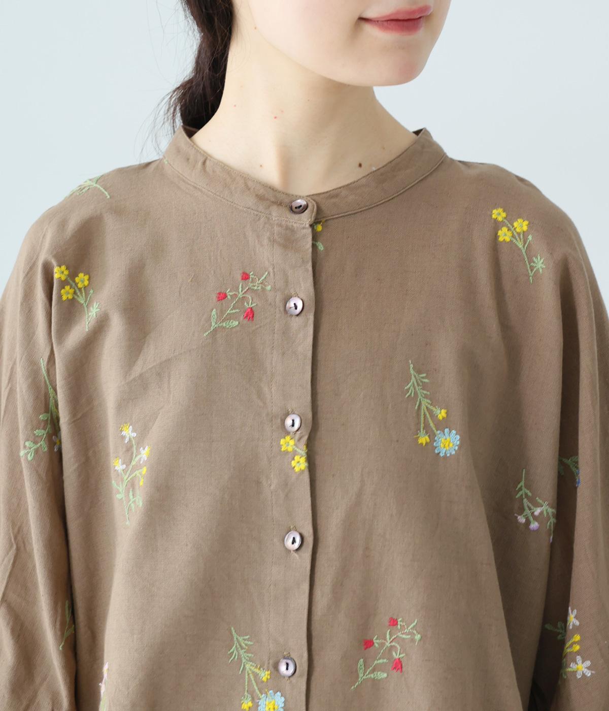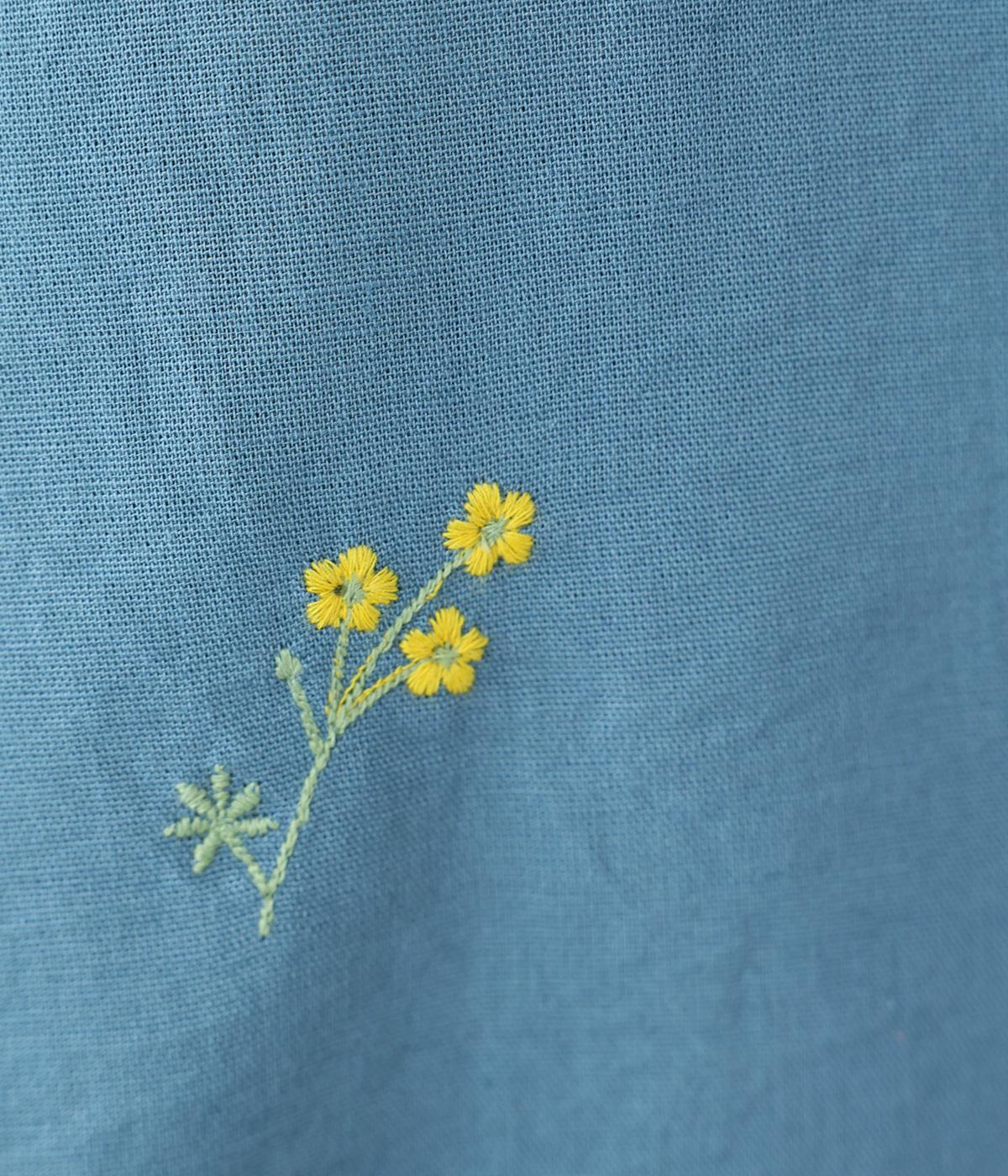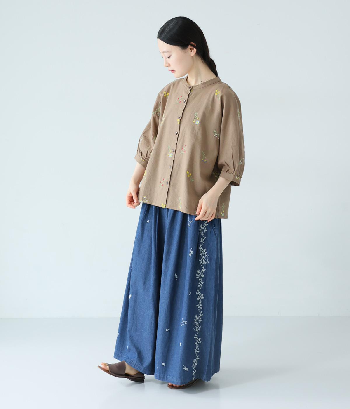 野花の刺しゅうが春らしいムードを運ぶブラウスです。ふんわりとした身頃と袖のシルエットに、首元はすっきりと整えました。愛らしい雰囲気ながら甘すぎず、カジュアルな装いにもマッチします。