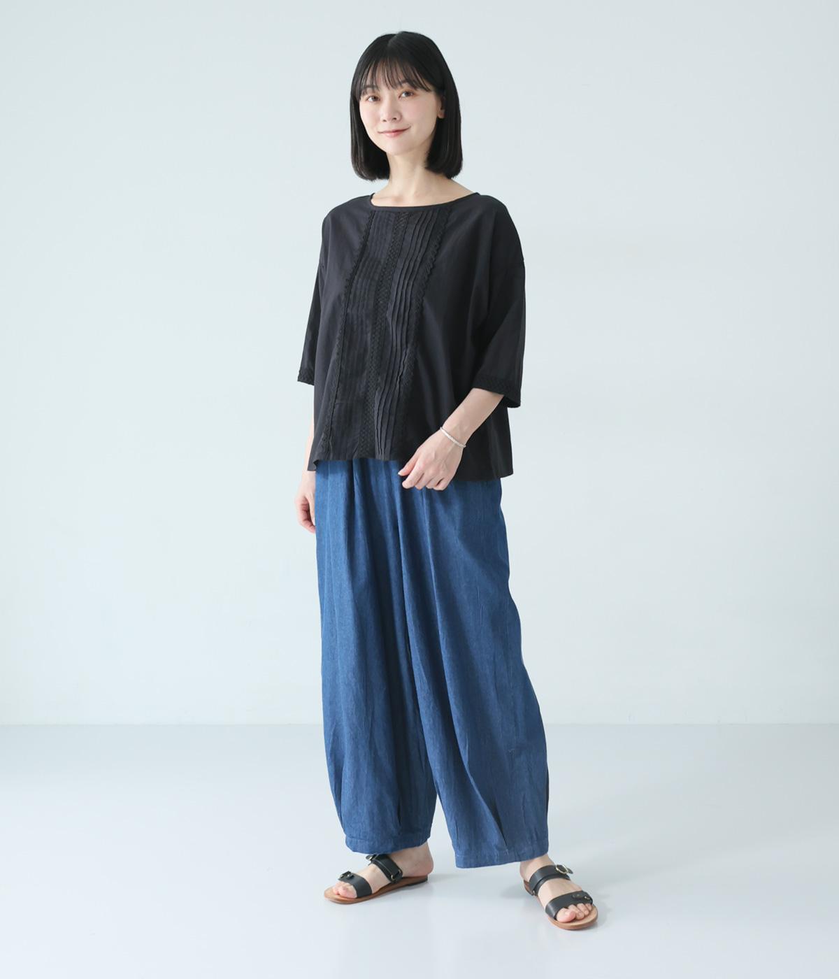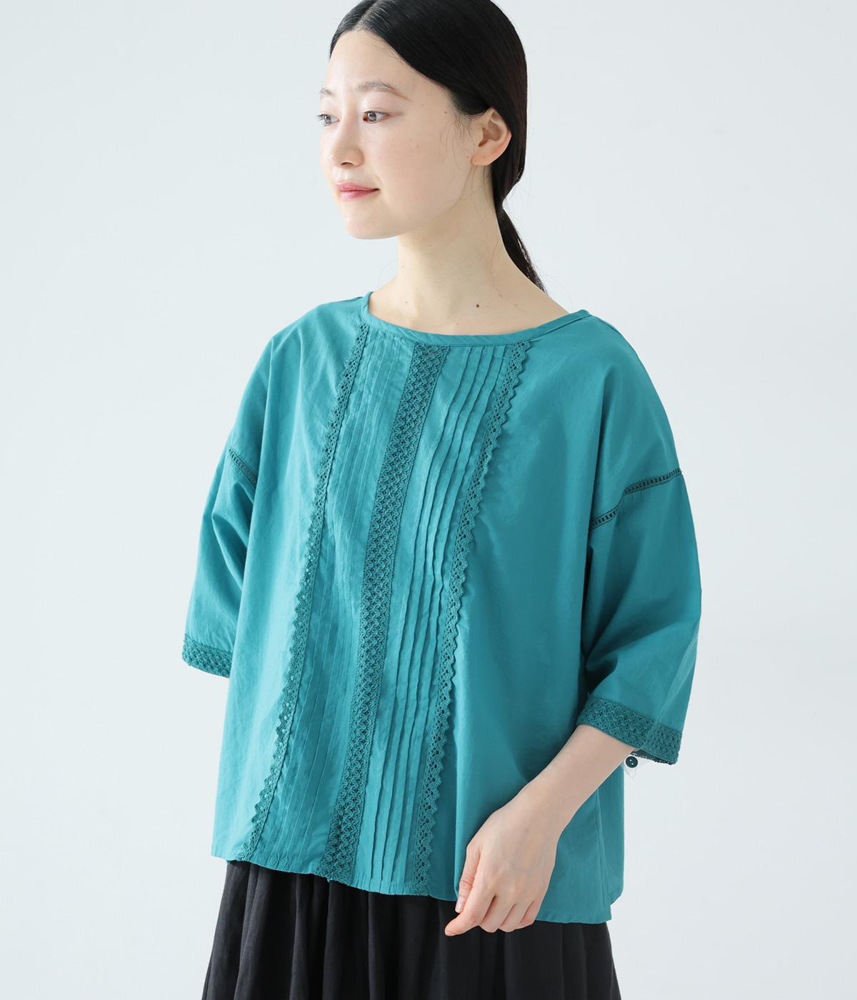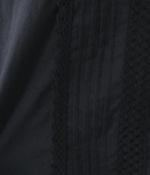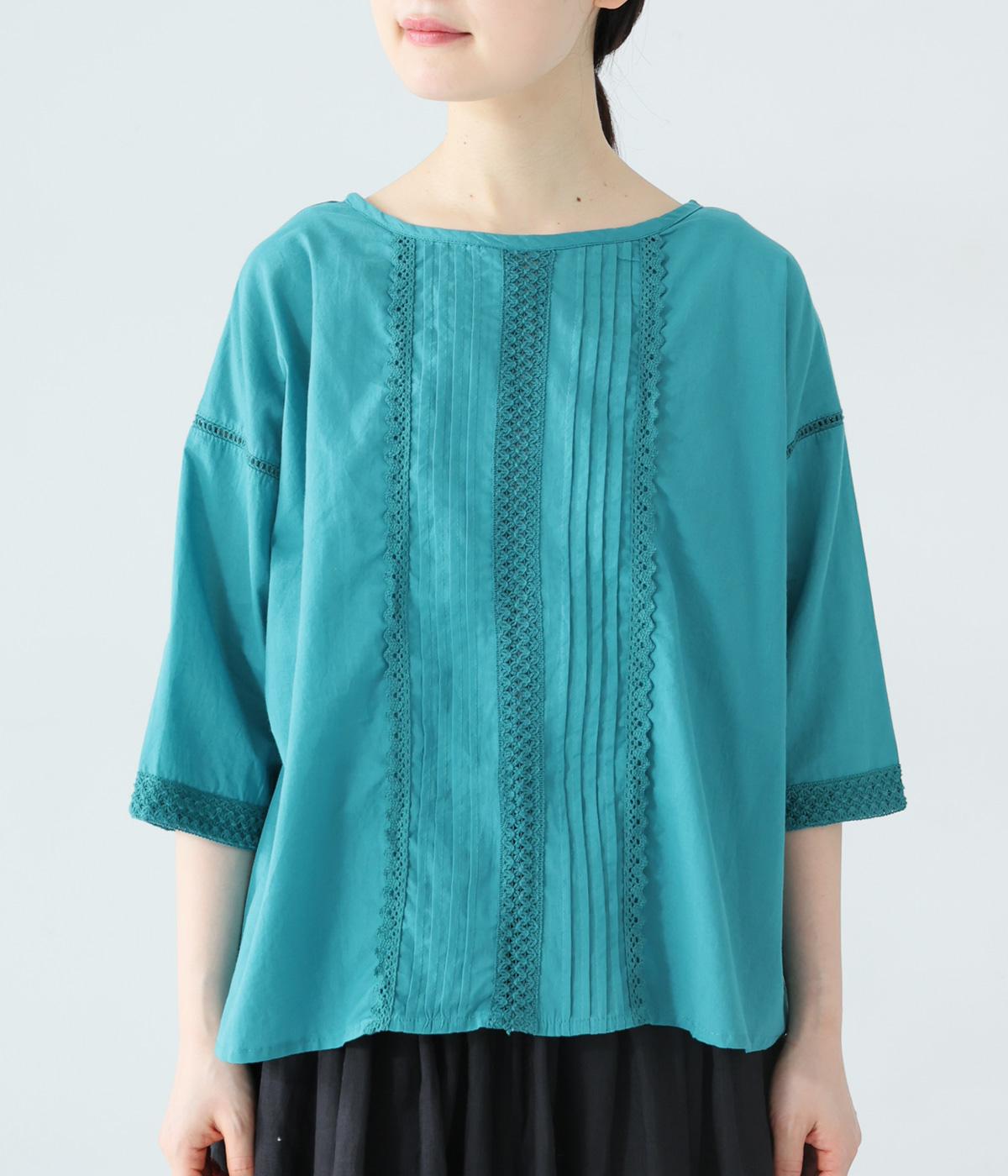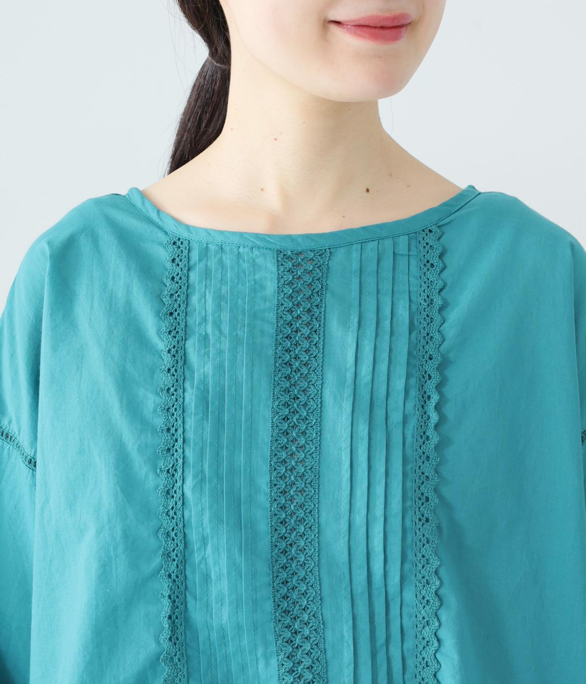 ピンタックとコットンレースをあしらった、フェミニンなムードをまとうプルオーバーです。デニムと合わせてカジュアルダウンしたスタイリングにもすっとなじみ、日々の装いに幅広く取り入れられる一枚です。