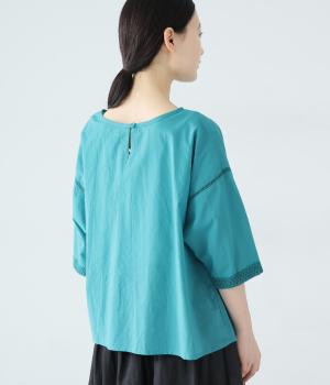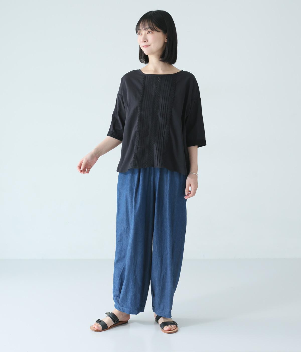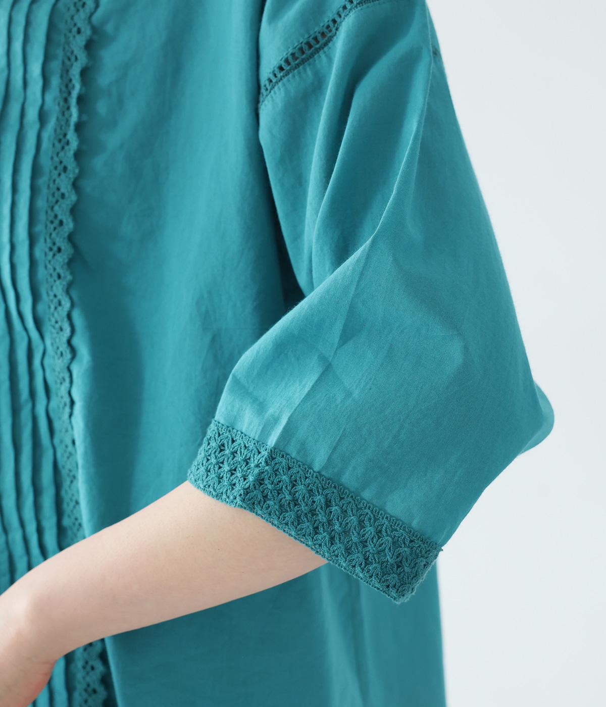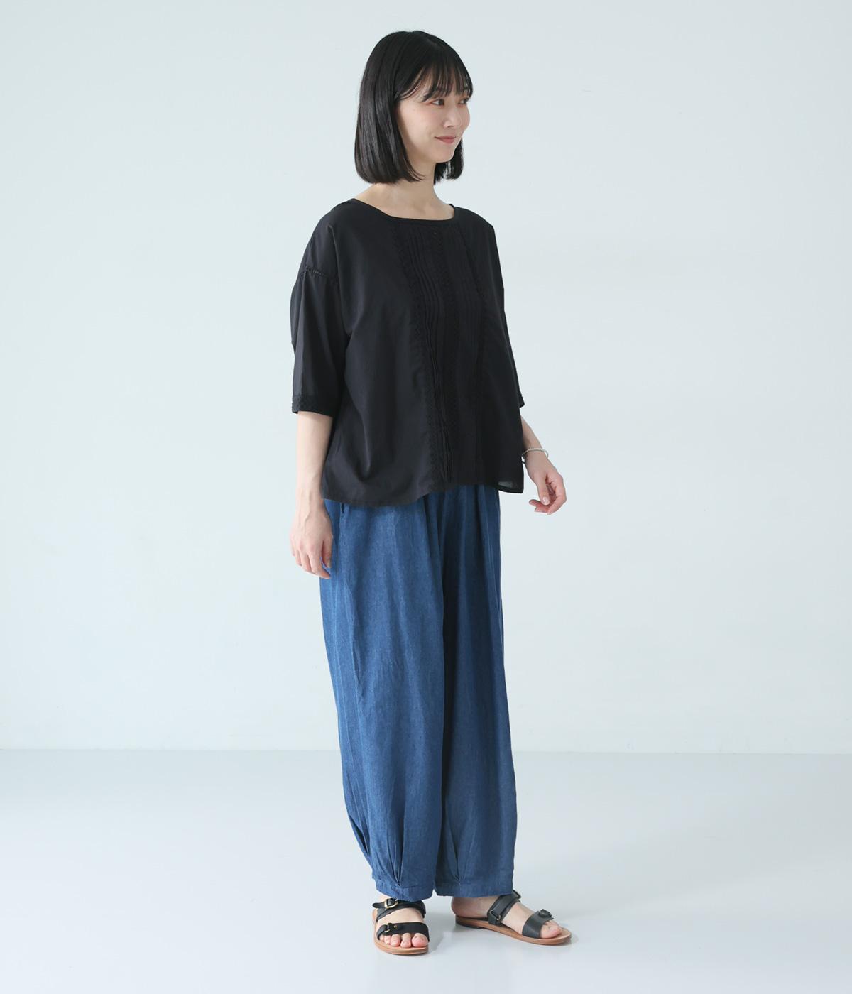 ピンタックとコットンレースをあしらった、フェミニンなムードをまとうプルオーバーです。デニムと合わせてカジュアルダウンしたスタイリングにもすっとなじみ、日々の装いに幅広く取り入れられる一枚です。