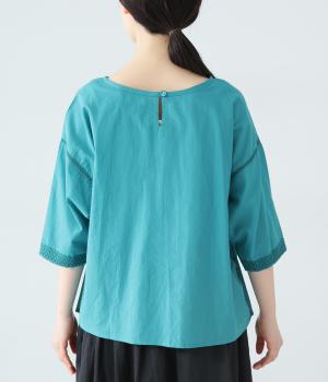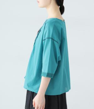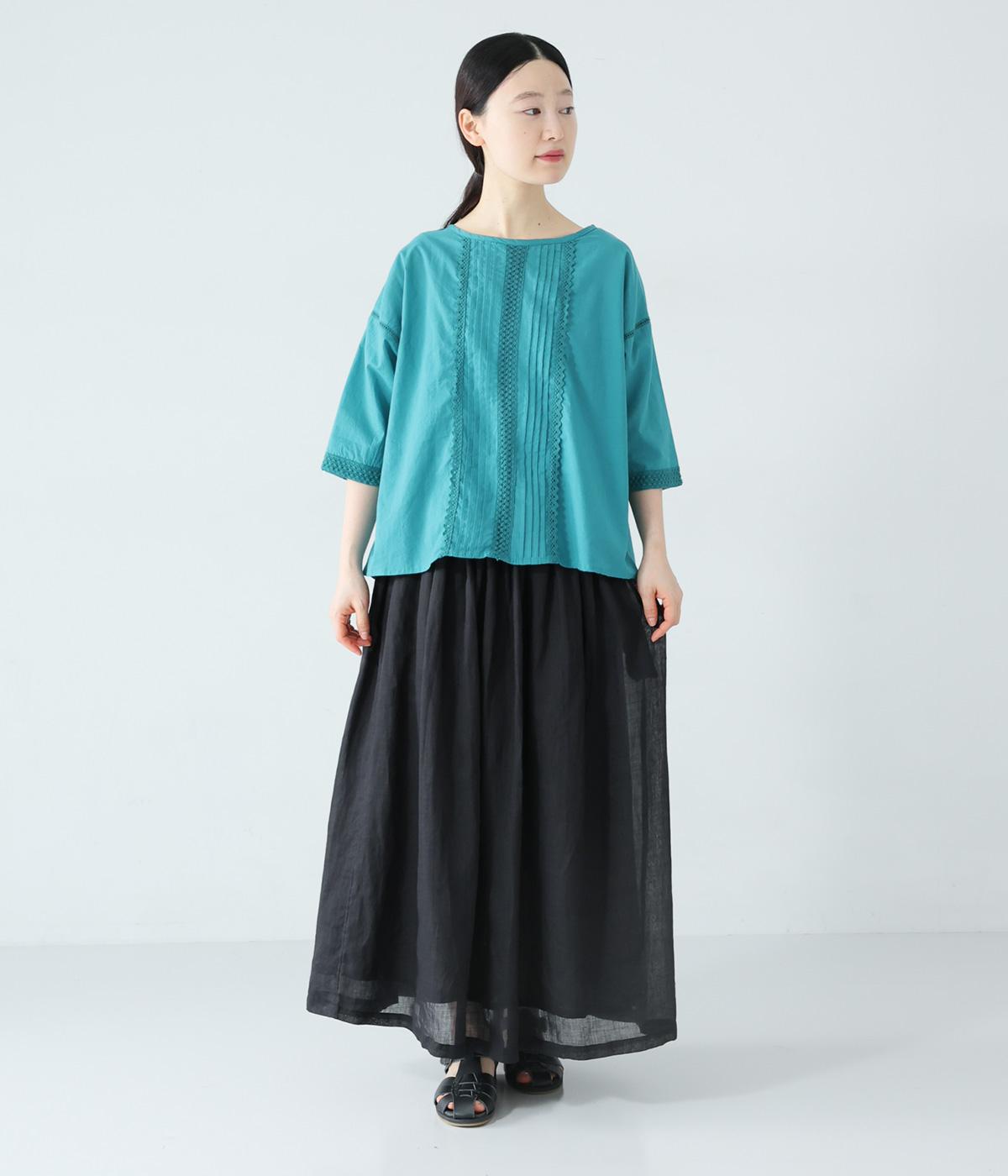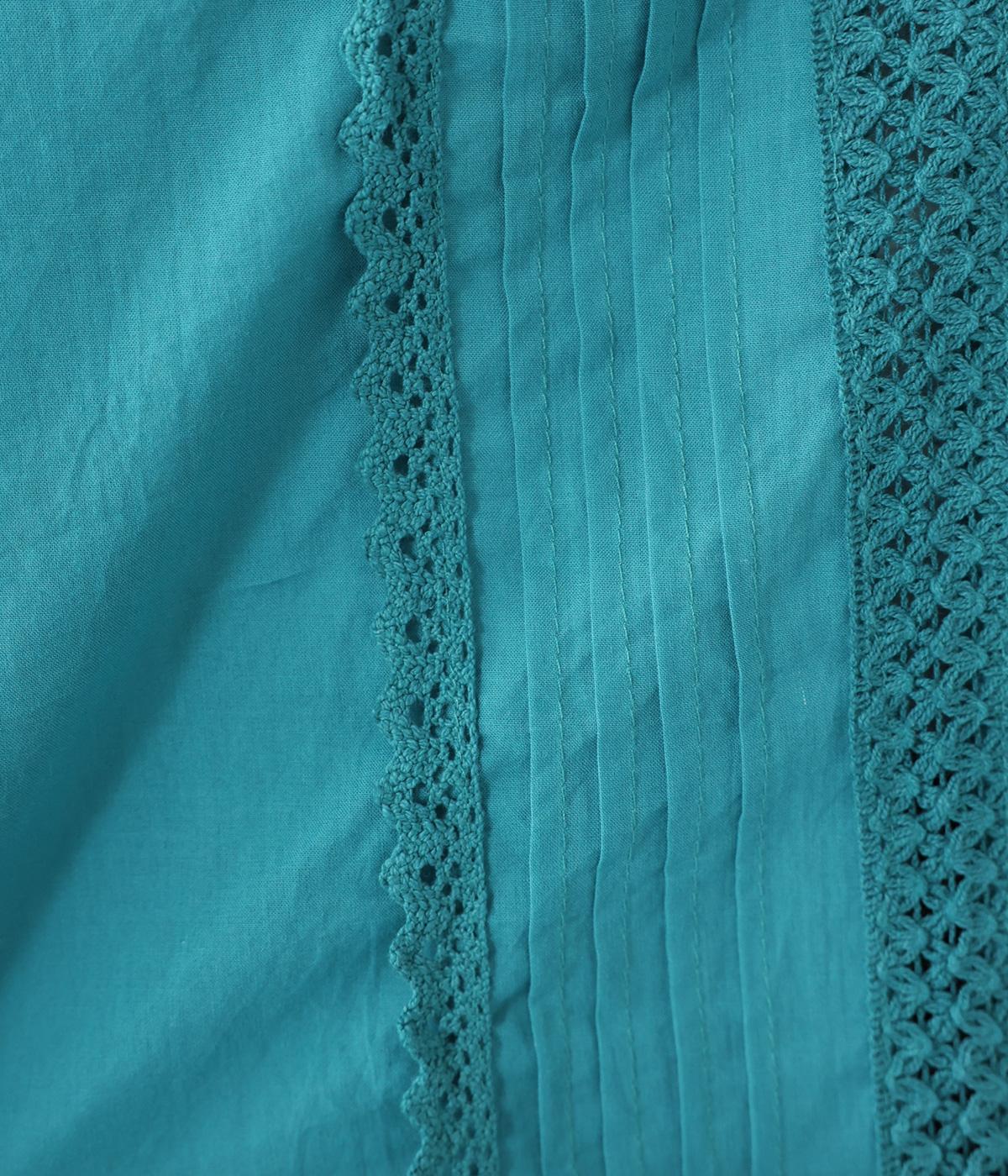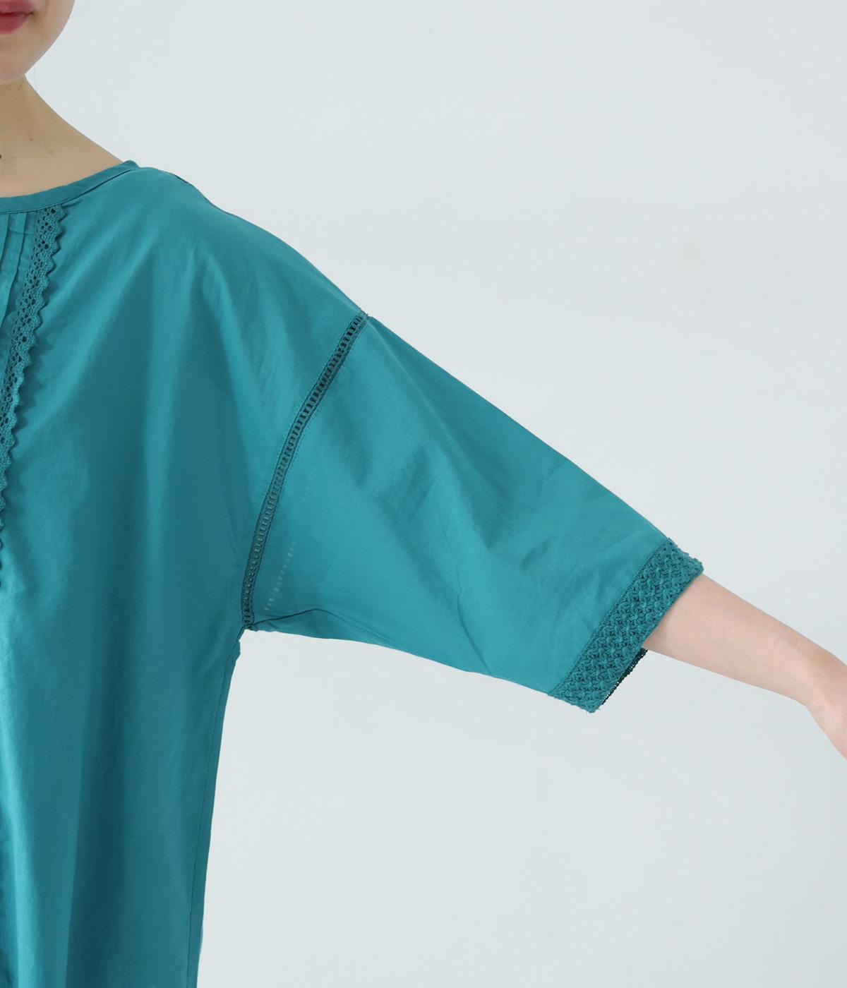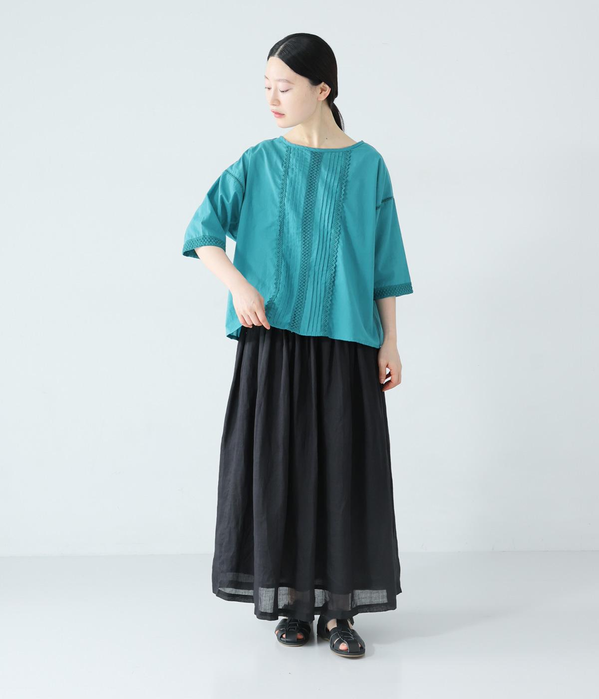 ピンタックとコットンレースをあしらった、フェミニンなムードをまとうプルオーバーです。デニムと合わせてカジュアルダウンしたスタイリングにもすっとなじみ、日々の装いに幅広く取り入れられる一枚です。
