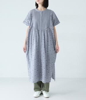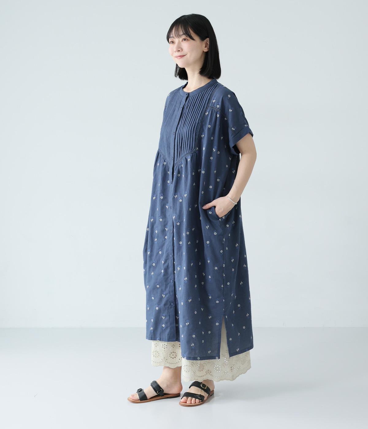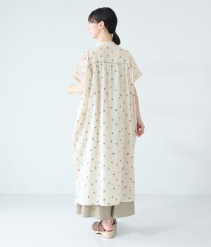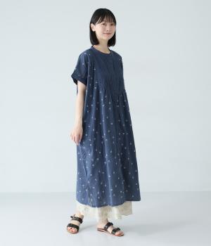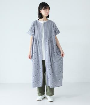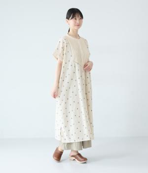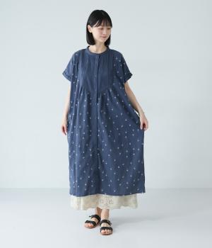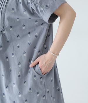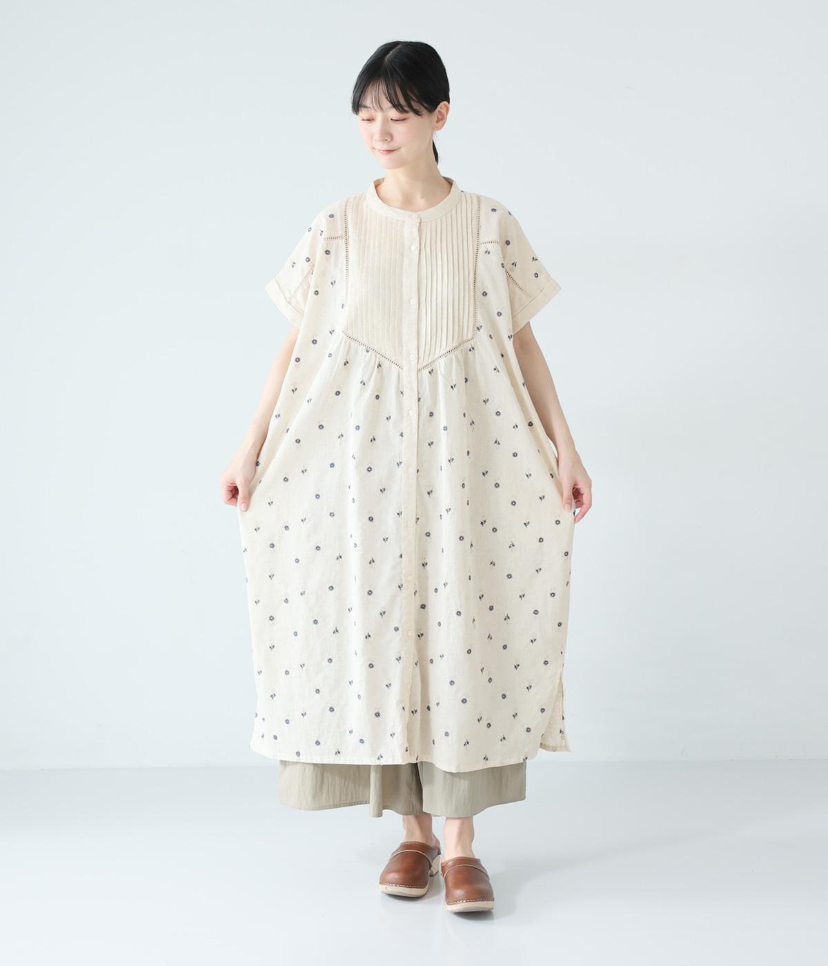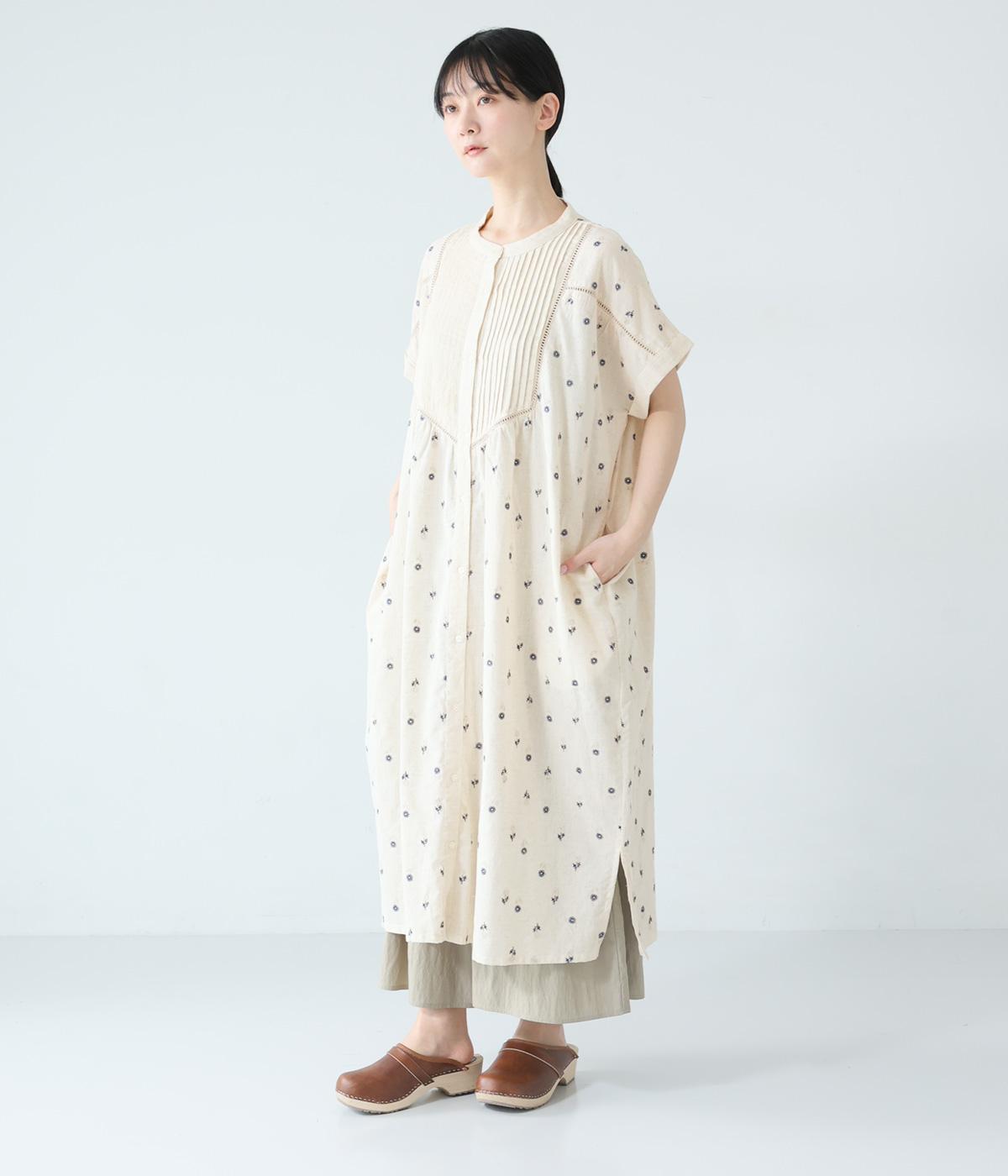 ナチュラルな麻混生地に花柄刺しゅうをあしらったワンピースです。ピンタックやはしごレースがクラシカルな雰囲気を添えます。二の腕をやさしくカバーする半袖丈に両サイドポケット付きで、デイリーに取り入れやすく仕立てました。
