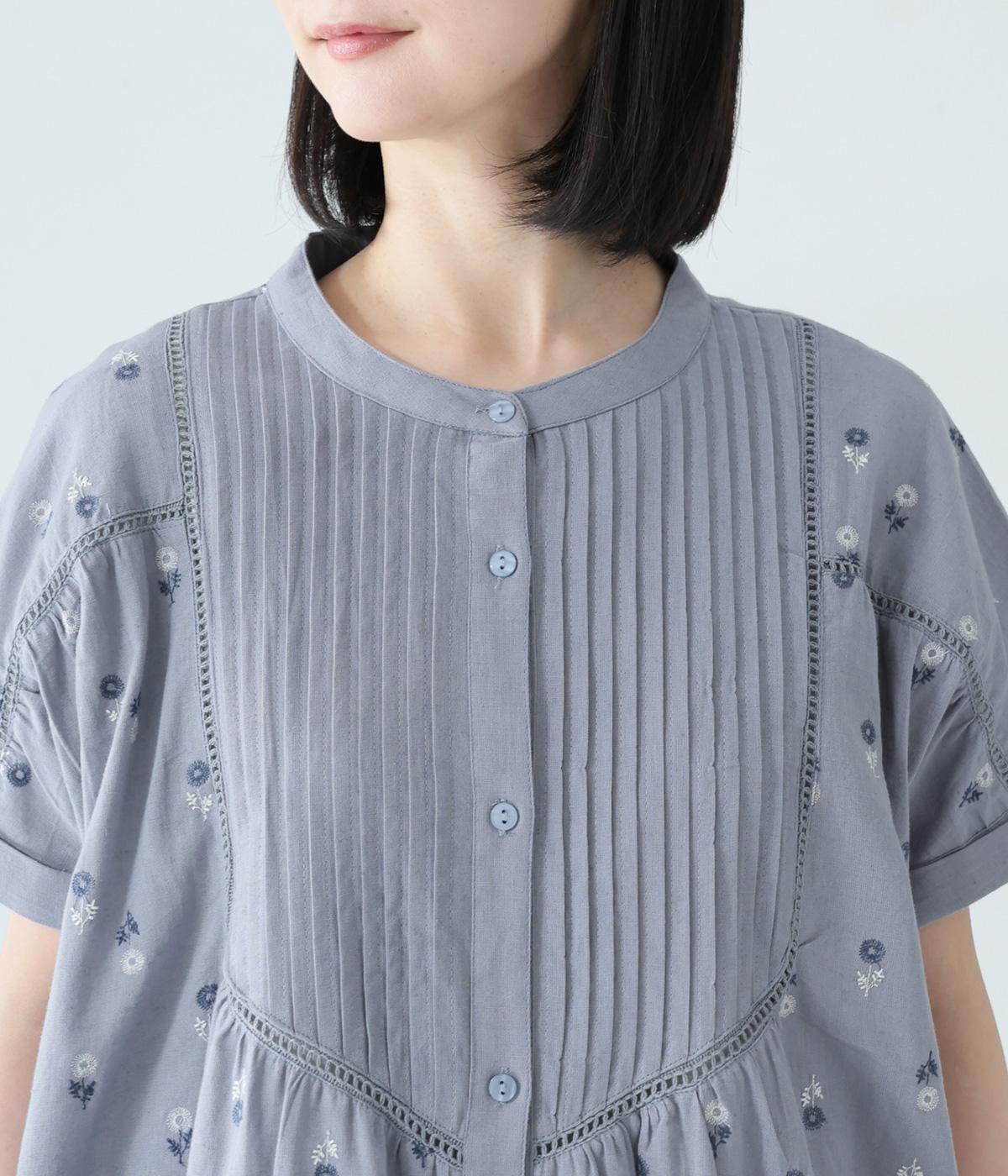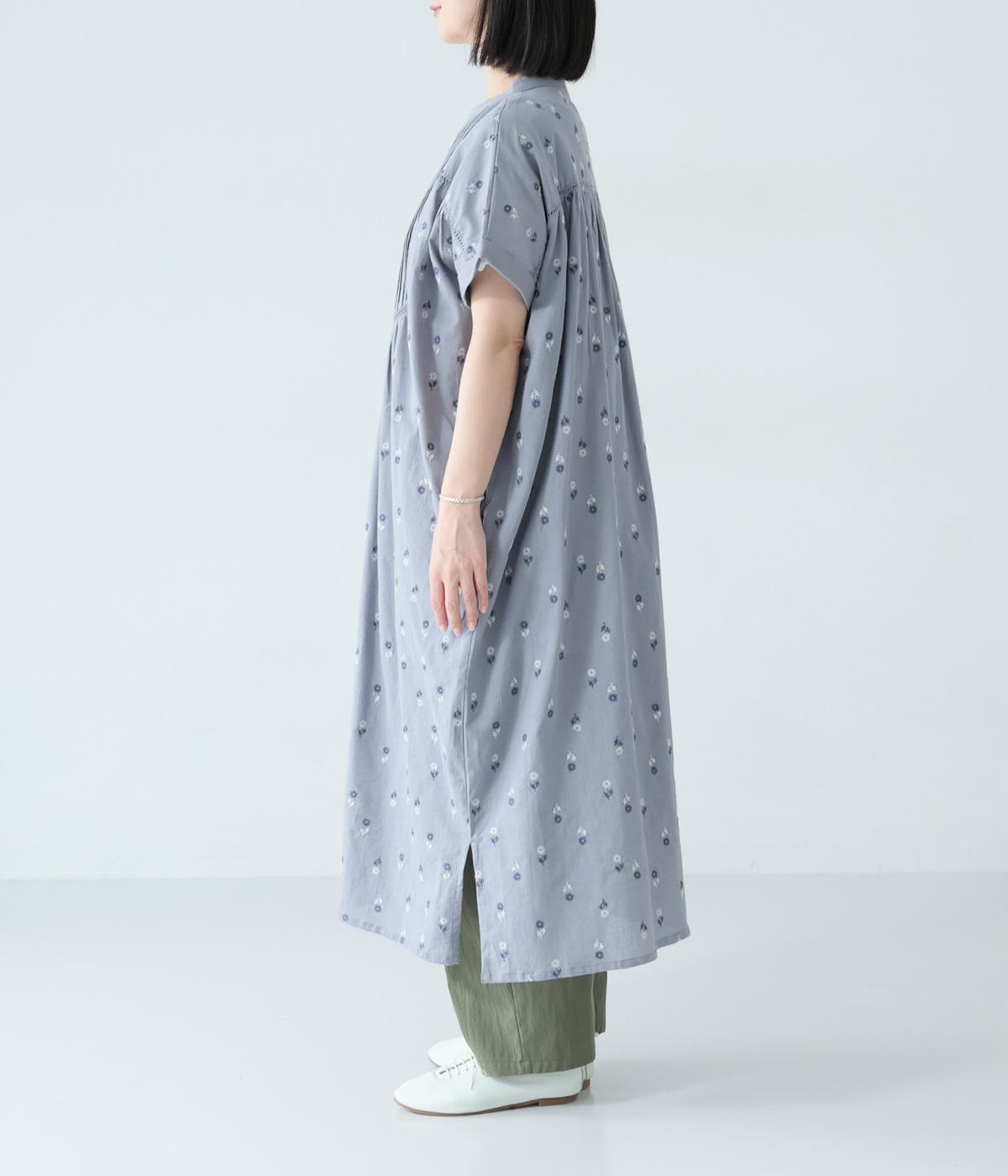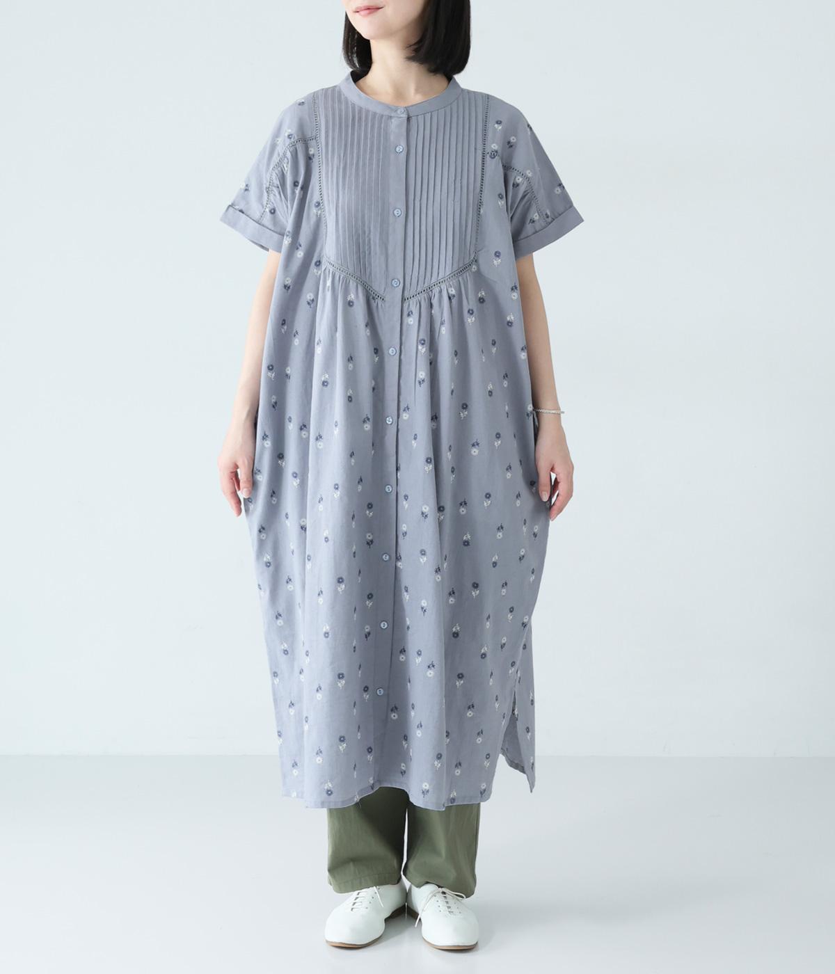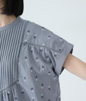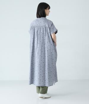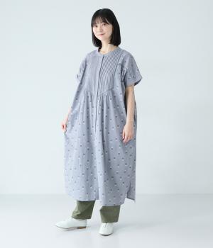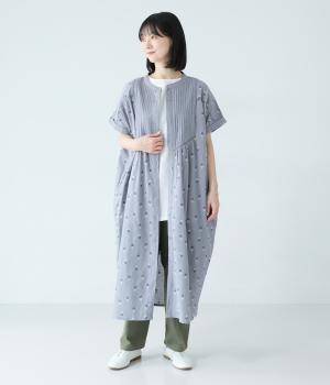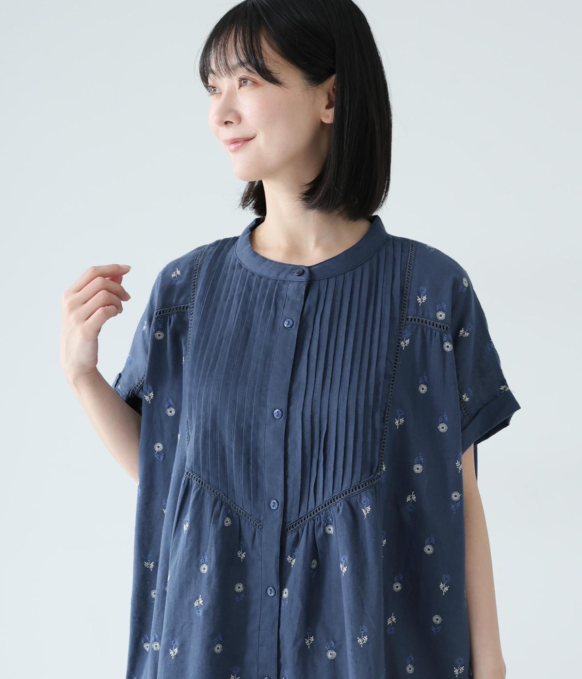 ナチュラルな麻混生地に花柄刺しゅうをあしらったワンピースです。ピンタックやはしごレースがクラシカルな雰囲気を添えます。二の腕をやさしくカバーする半袖丈に両サイドポケット付きで、デイリーに取り入れやすく仕立てました。